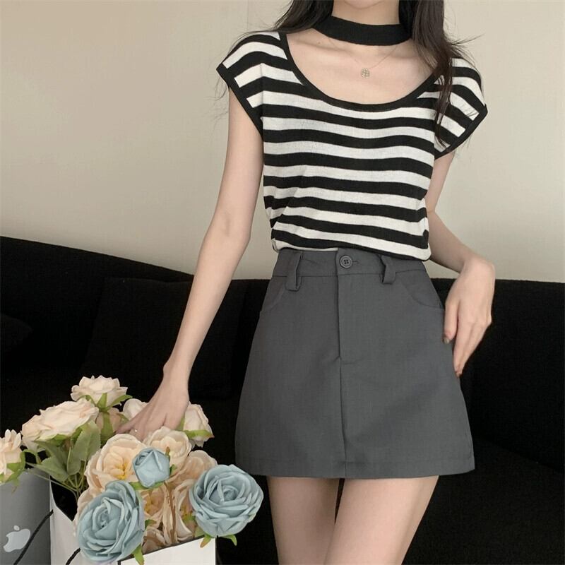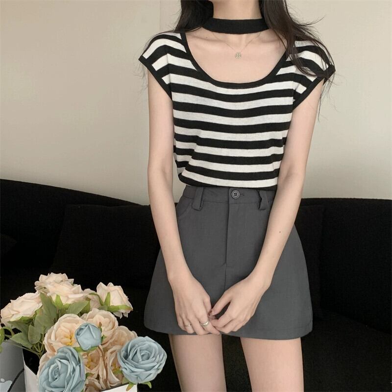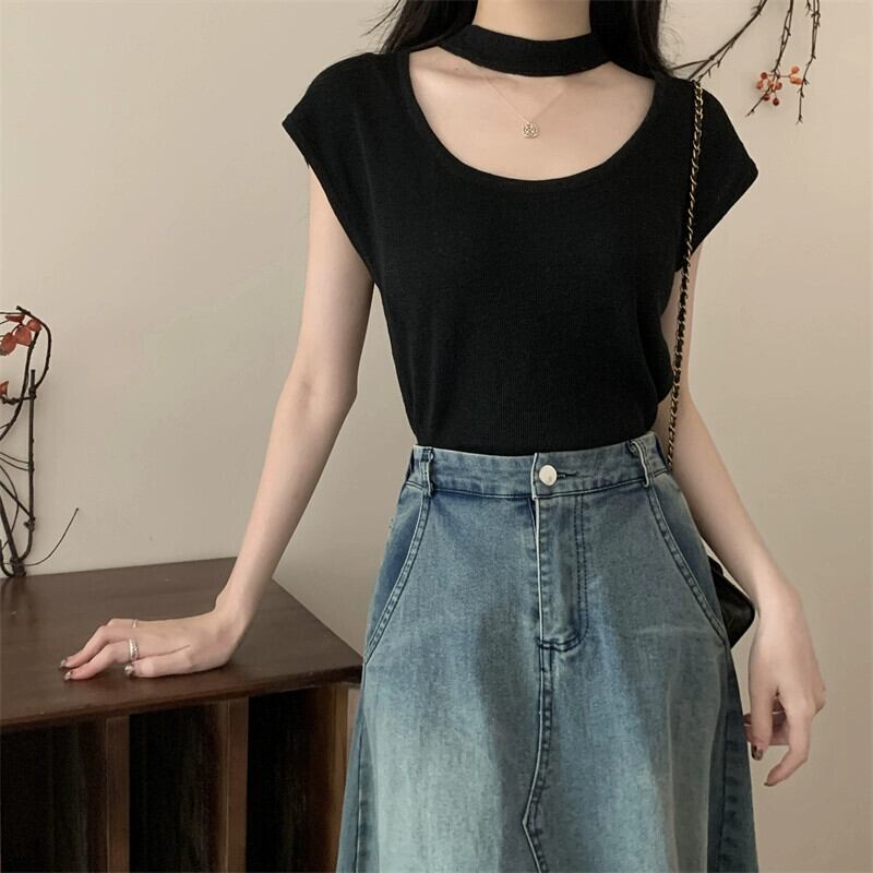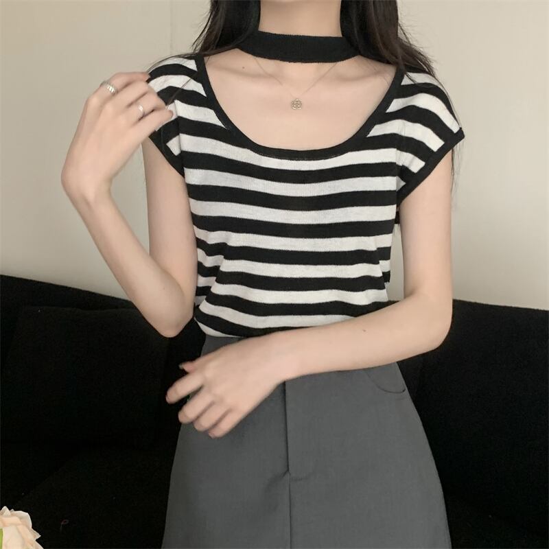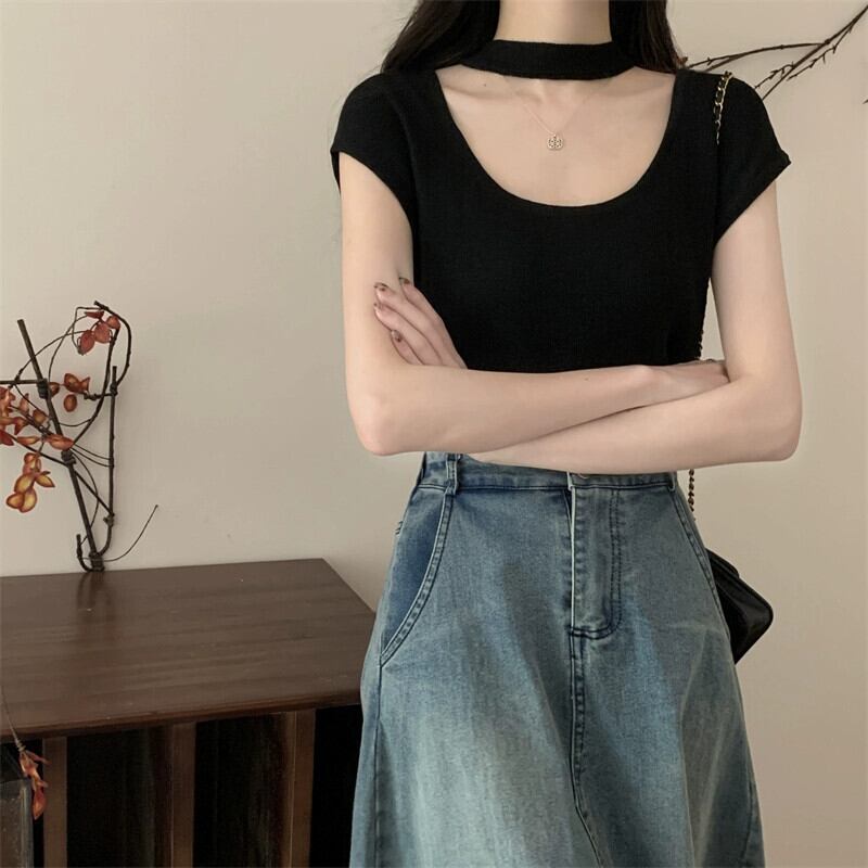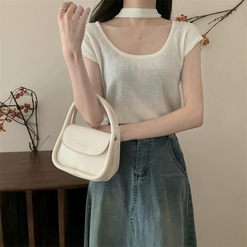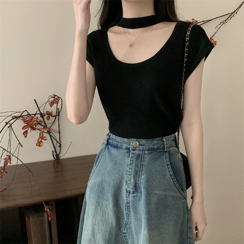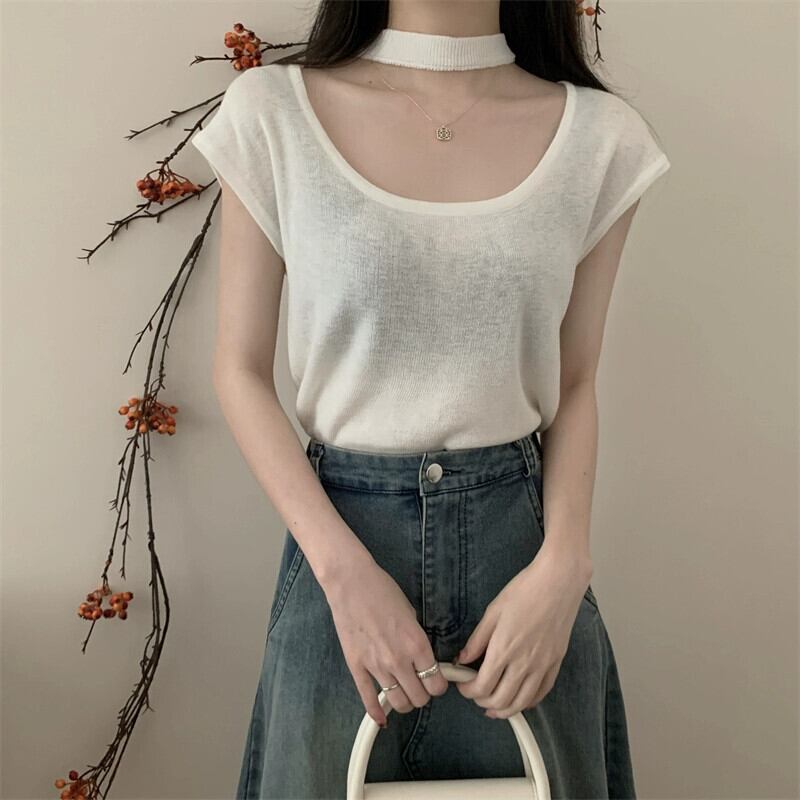 吊りネックニット半袖Tシャツレディース夏フレンチファッションデザインセンス薄肉アイスシルク小フライングスリーブラウンドネックトップホワイト サマー 夏物 Oネック 7460089397430382 | framboise21