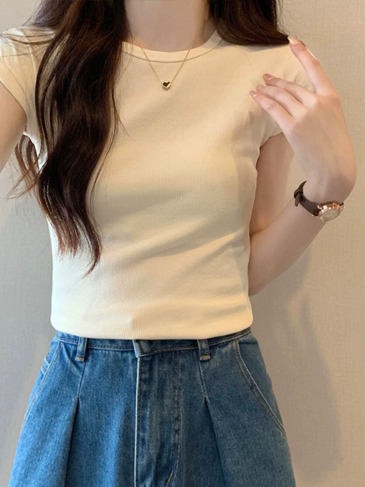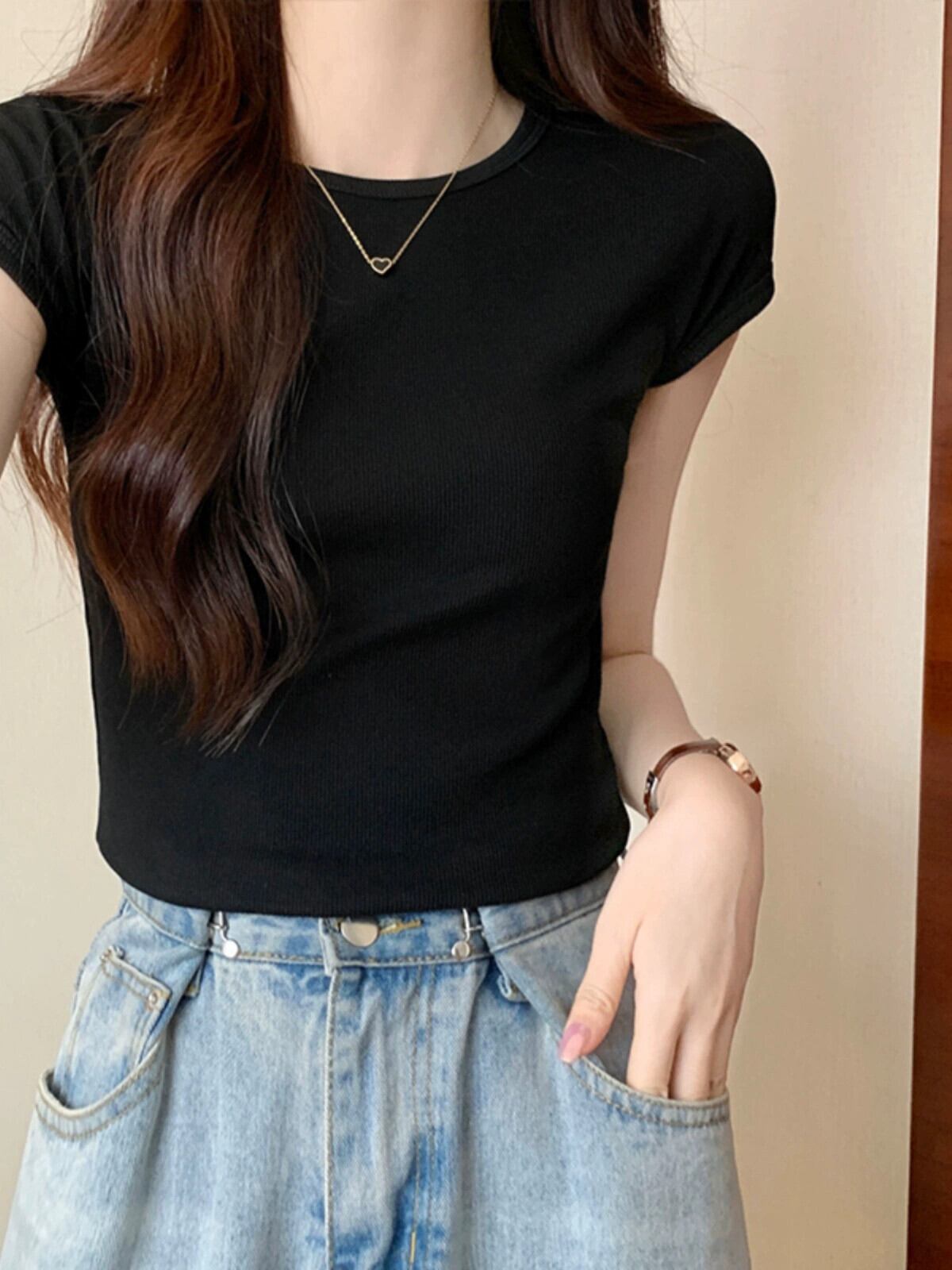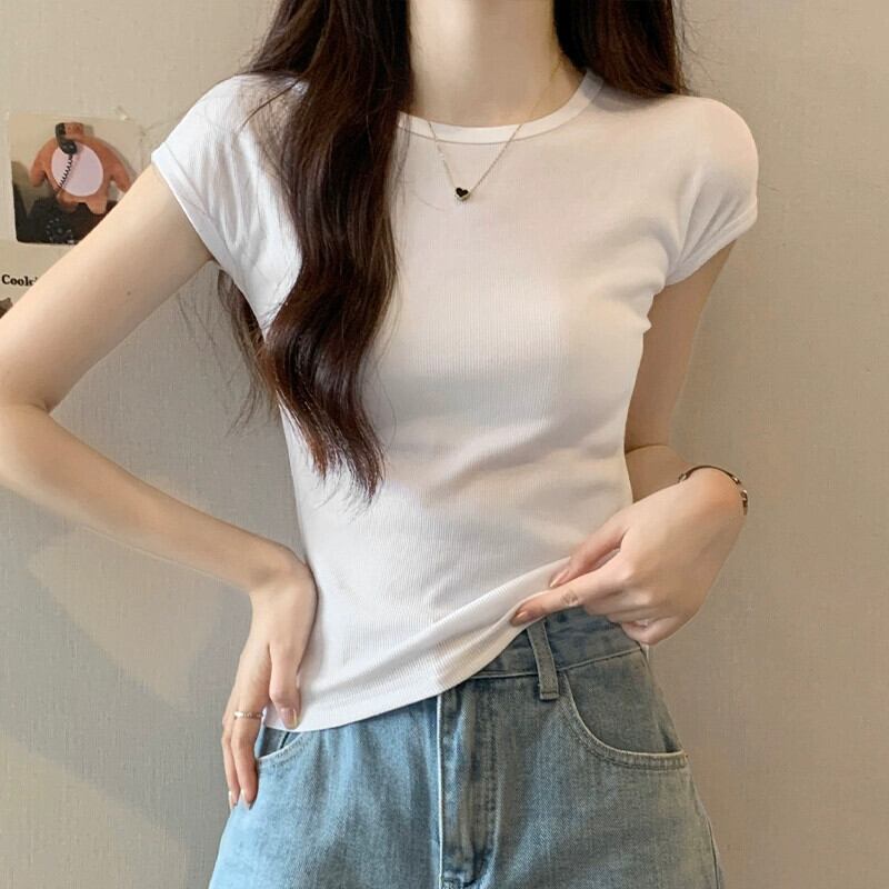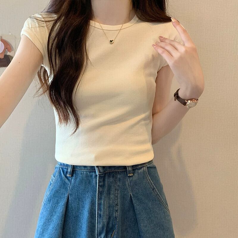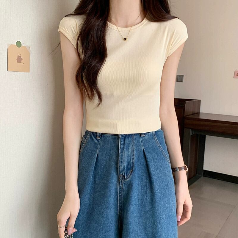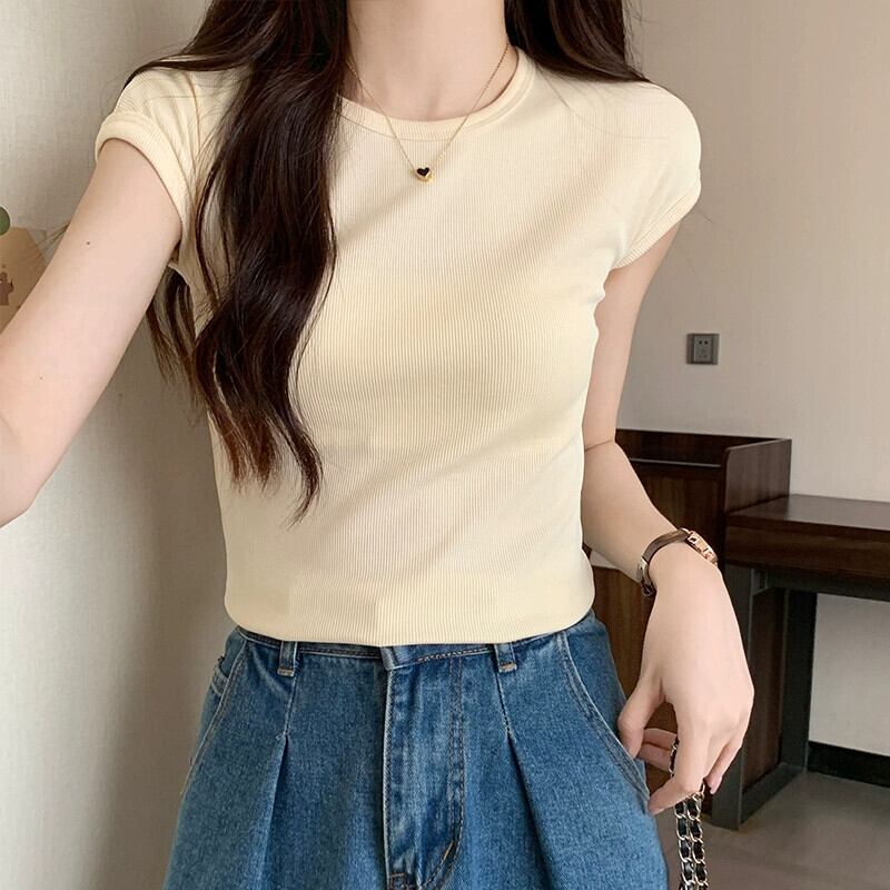 薄氷シルク糸半袖 Tシャツ女性の 2023 夏の新しいスリムフィットと薄い短いフロントショルダー小さなフライング スリーブ トップ ショート サマー 夏物 7460034667682700 | framboise21