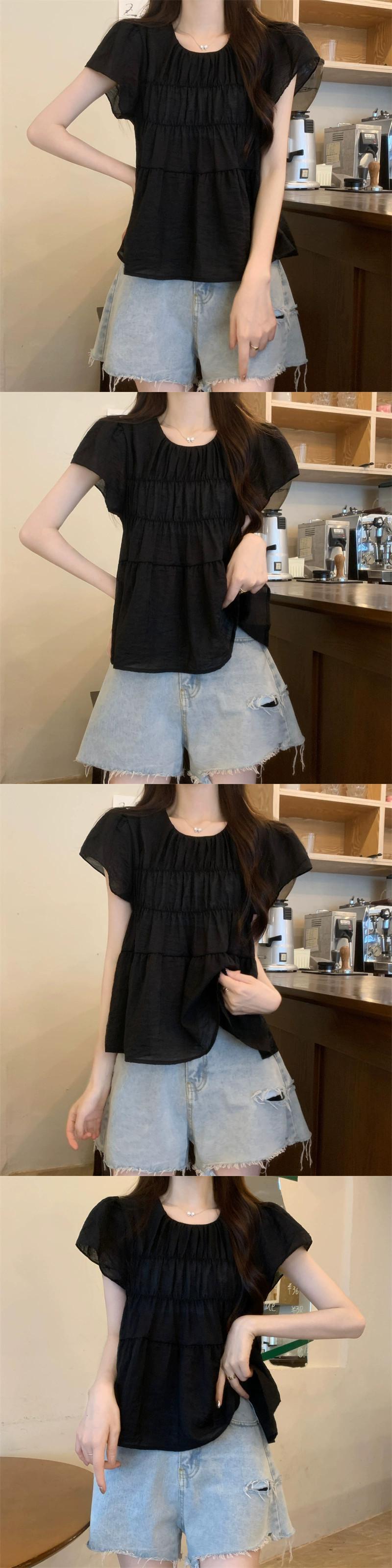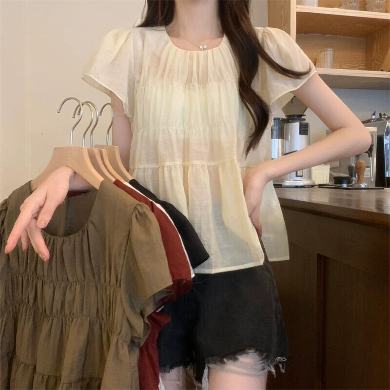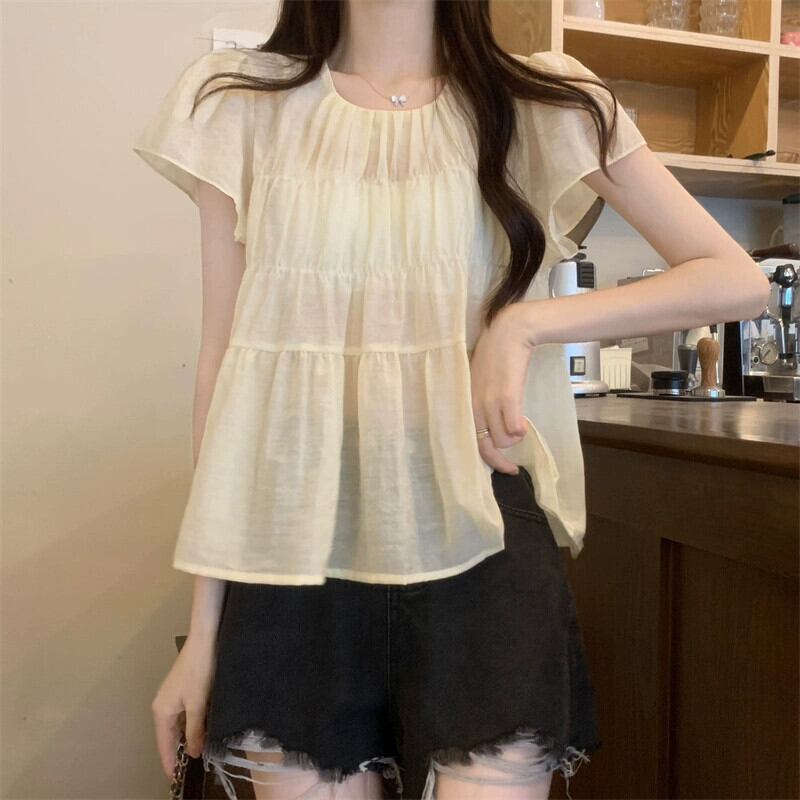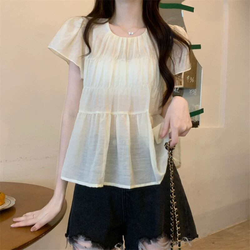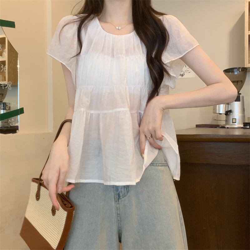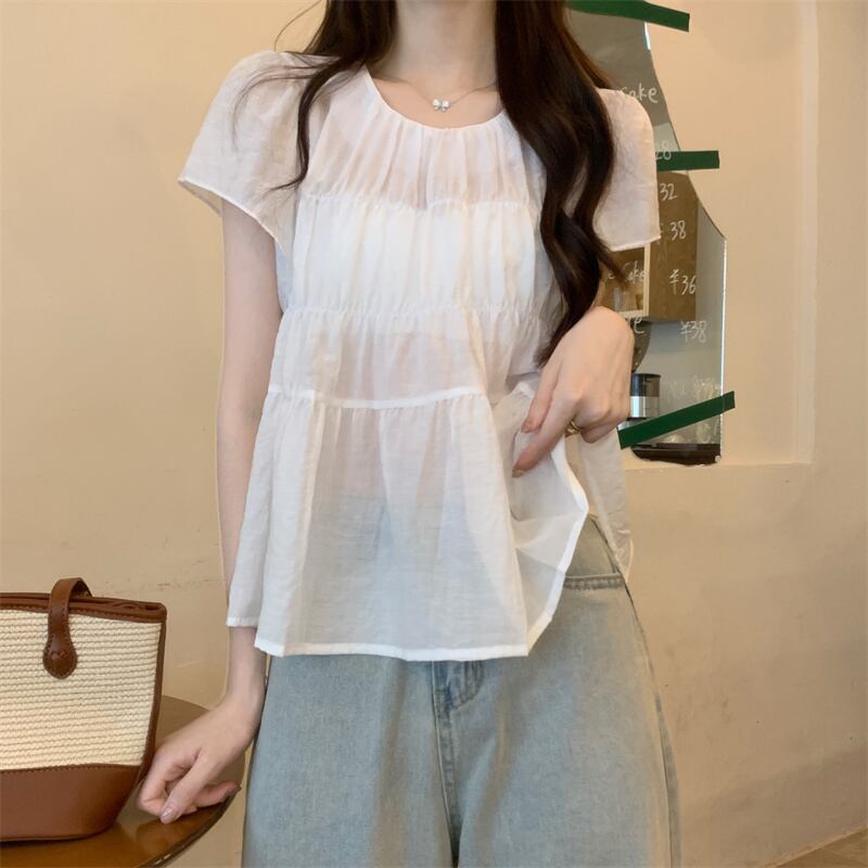 白い薄いセクションプリーツ半袖シャツレディース夏のファッションアインスタイルデザインセンスルーズオールマッチシースルーラウンドネックトップ ホワイト サマー 夏物 Oネック 7460074158120071 | framboise21