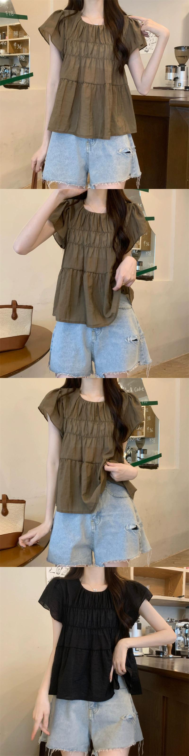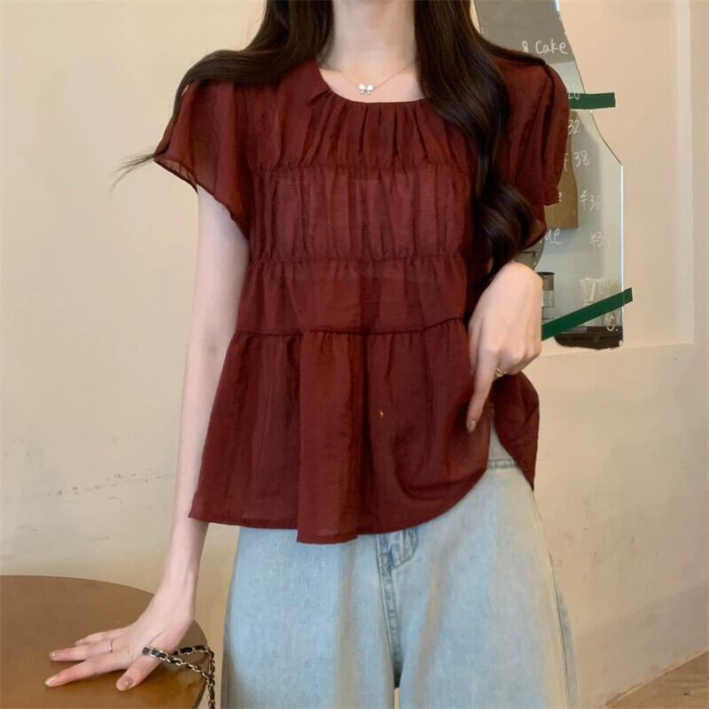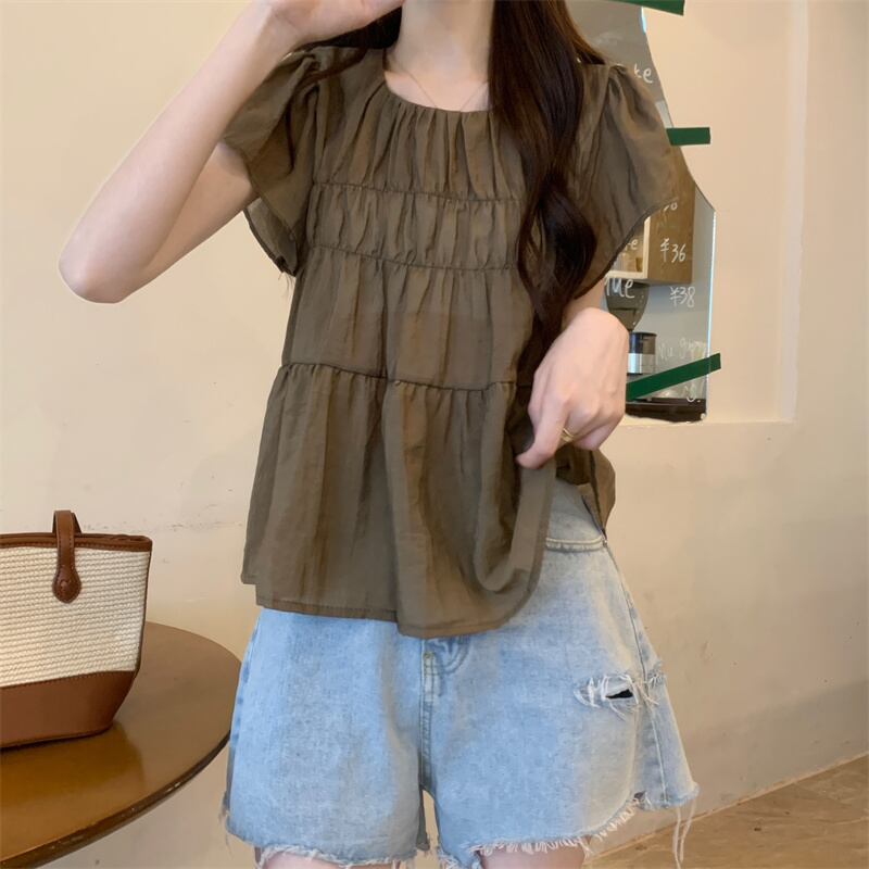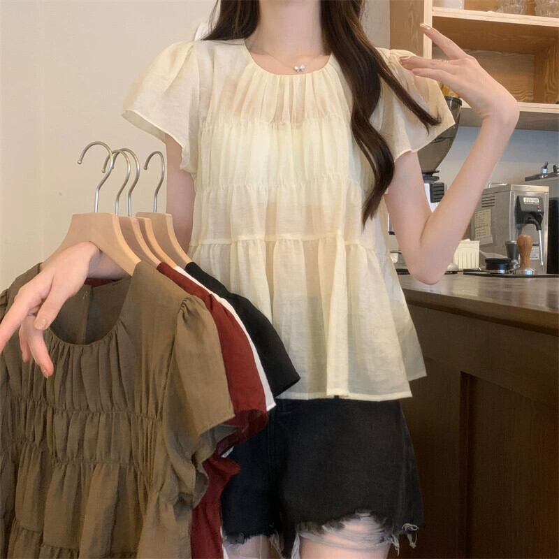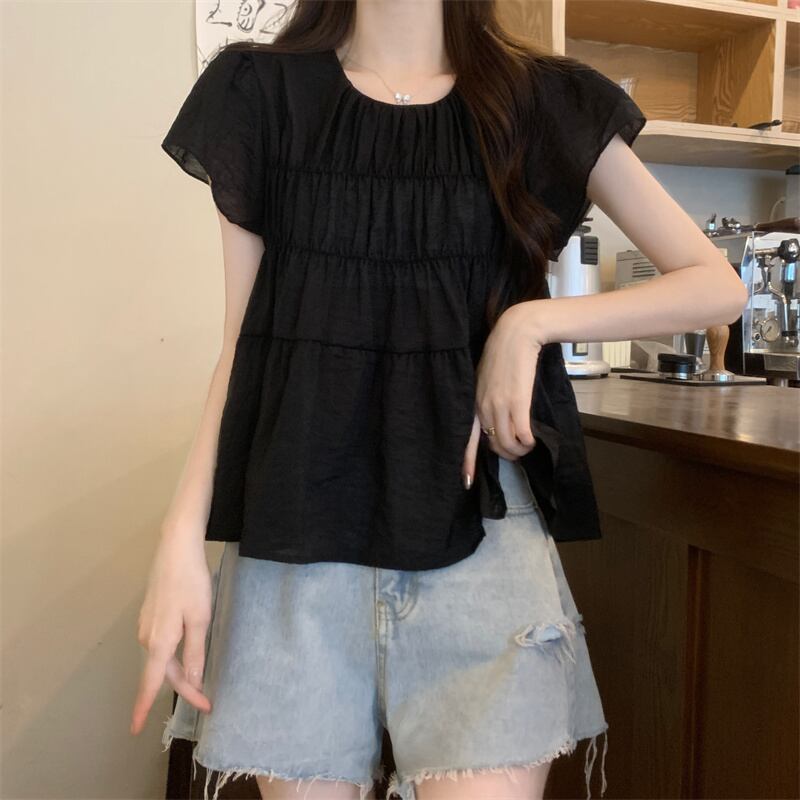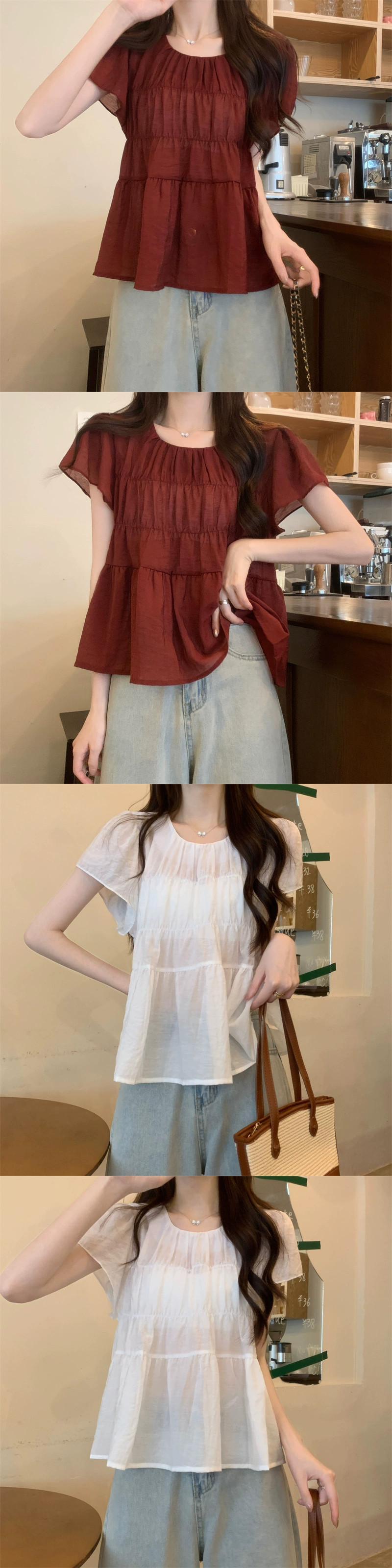 白い薄いセクションプリーツ半袖シャツレディース夏のファッションアインスタイルデザインセンスルーズオールマッチシースルーラウンドネックトップ ホワイト サマー 夏物 Oネック 7460074158120071 | framboise21