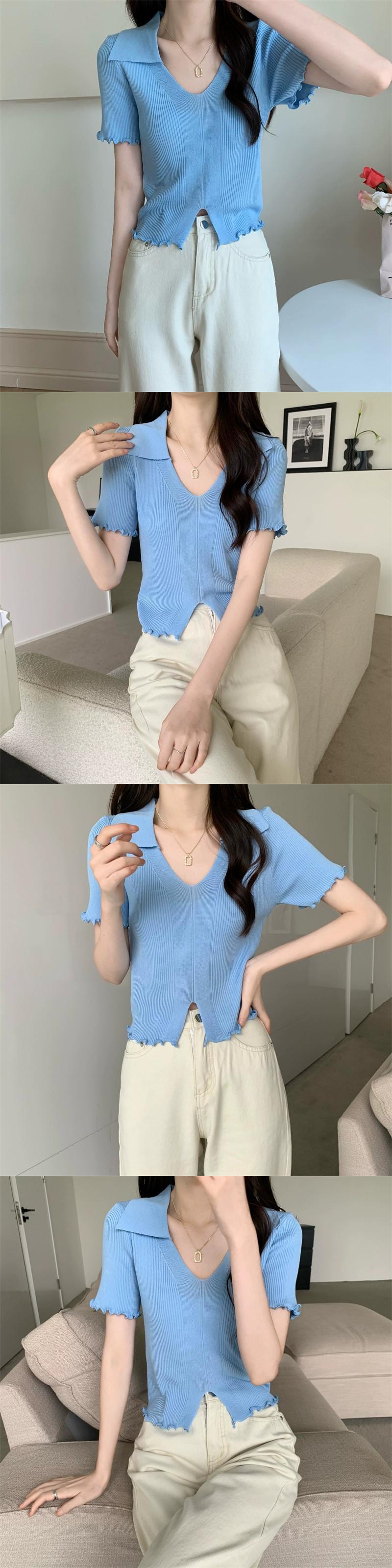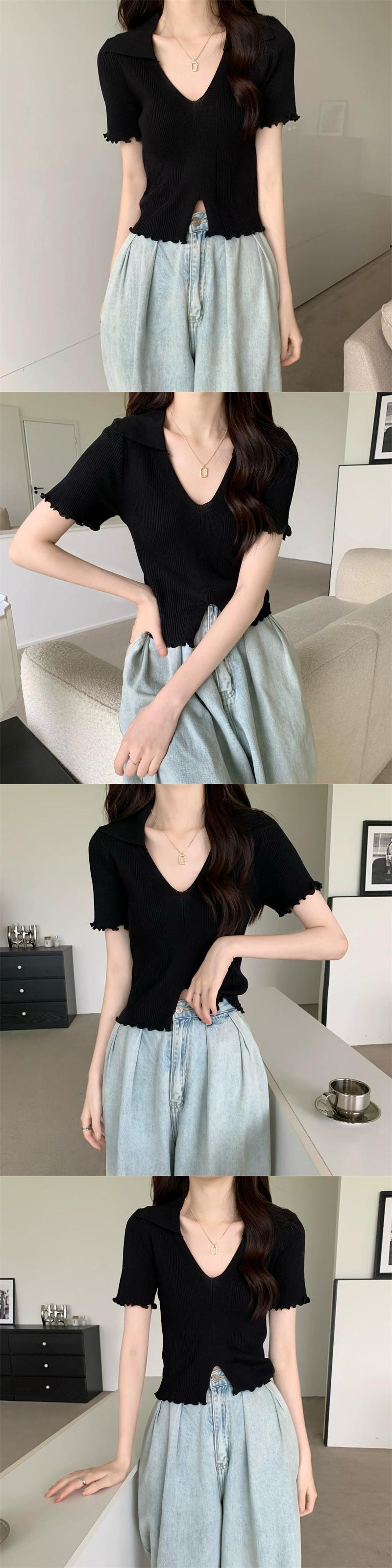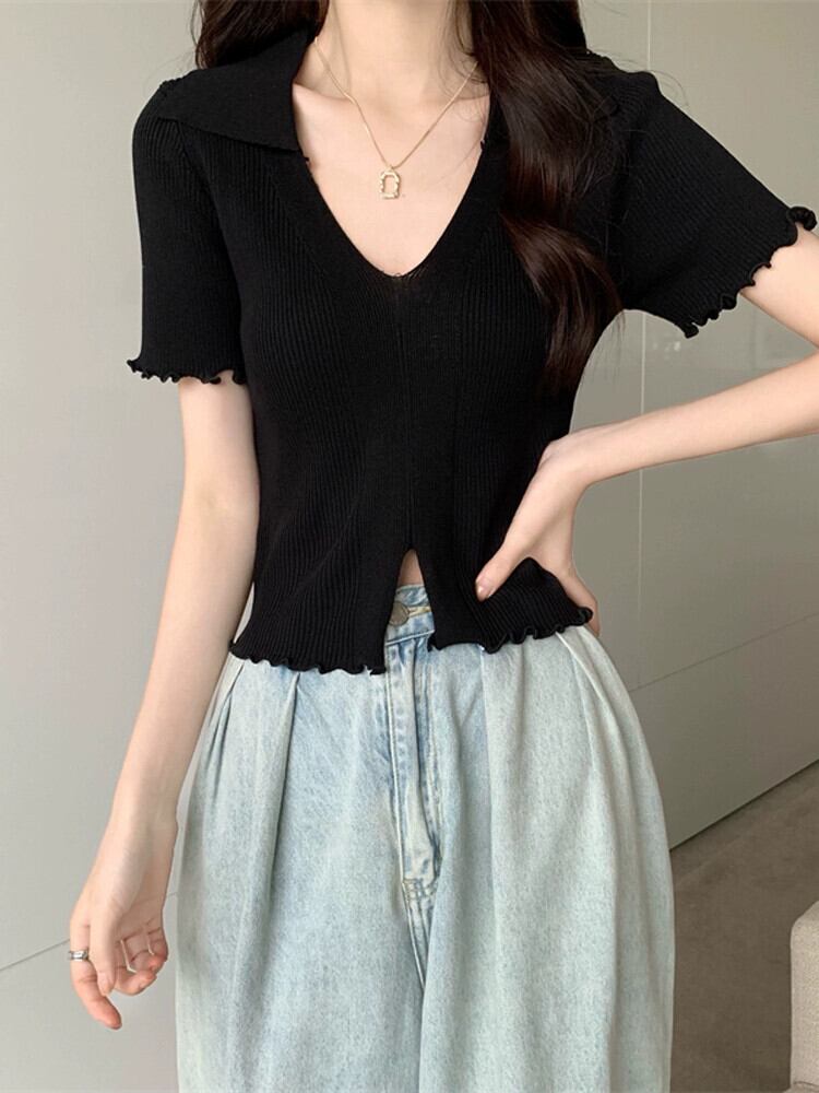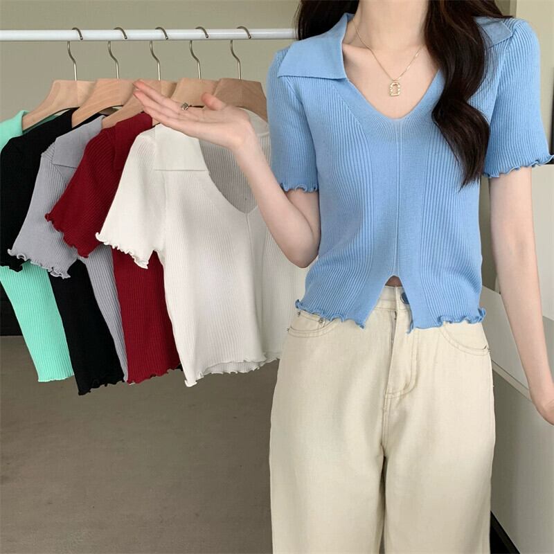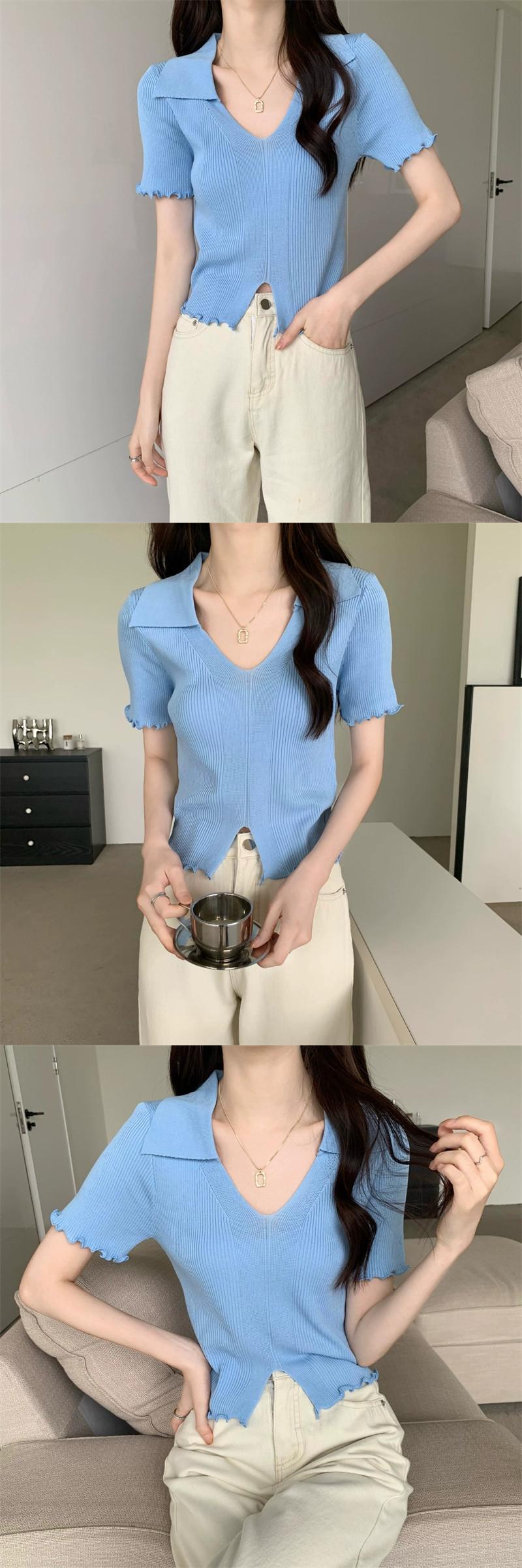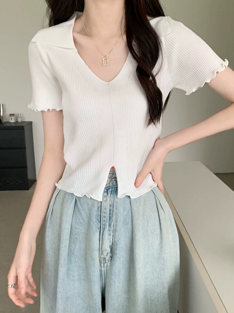 ホワイトフロントショルダー V ネック半袖 Tシャツ女性の夏のニッチファッション Eign スタイル木耳薄セクションアイスシルクニットショートトップ サマー 夏物 Vネック 7460077383392067 | framboise21