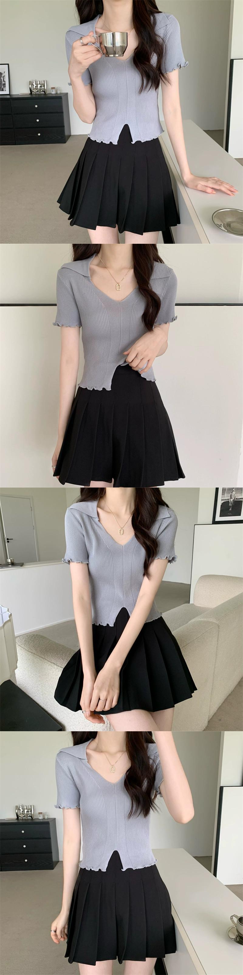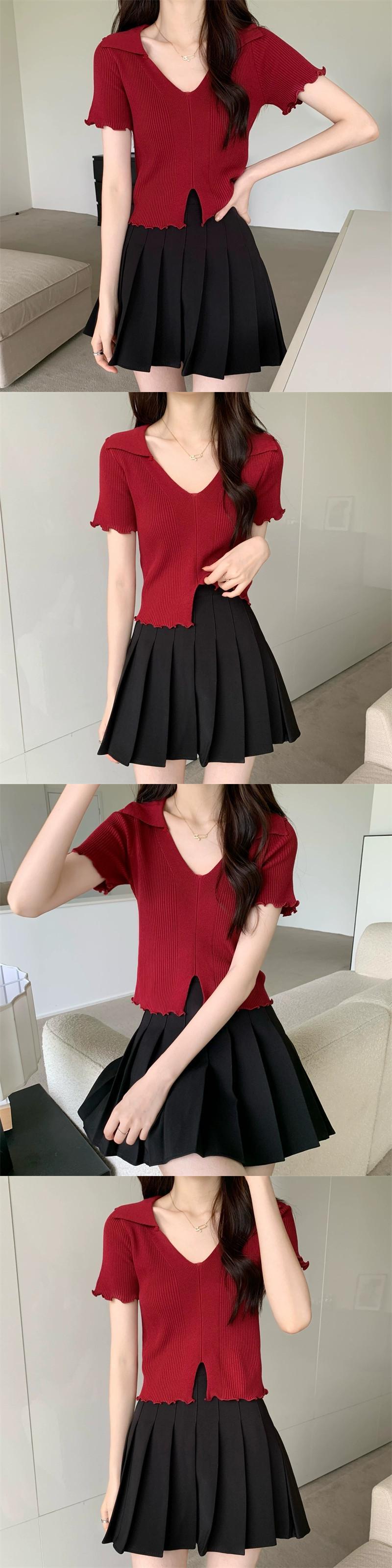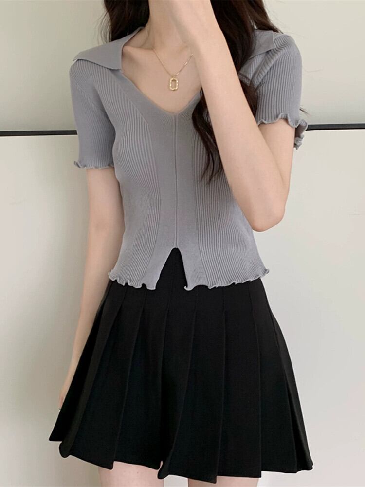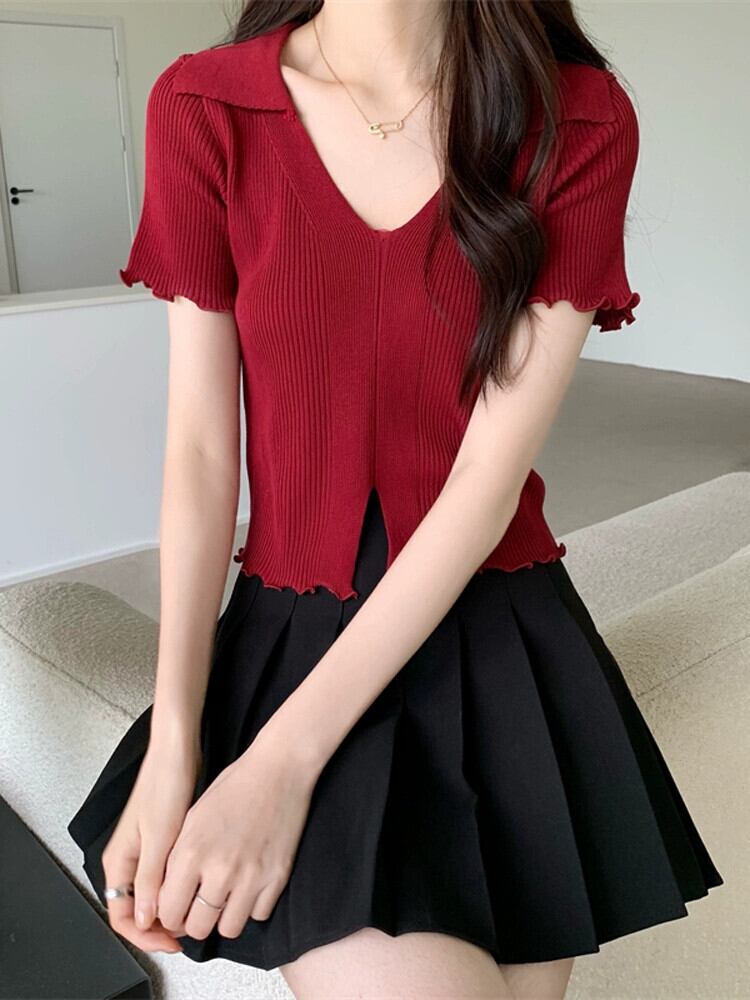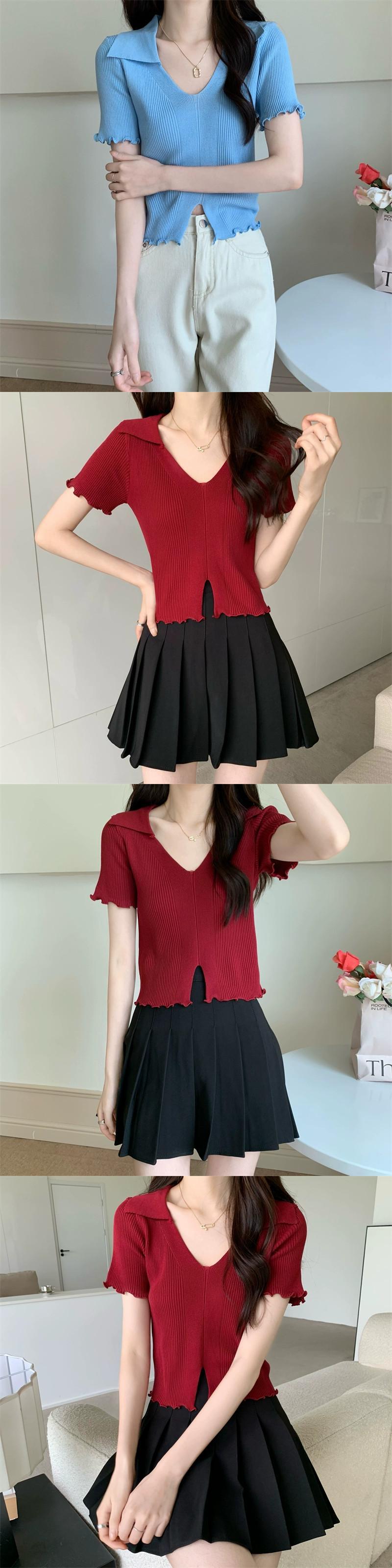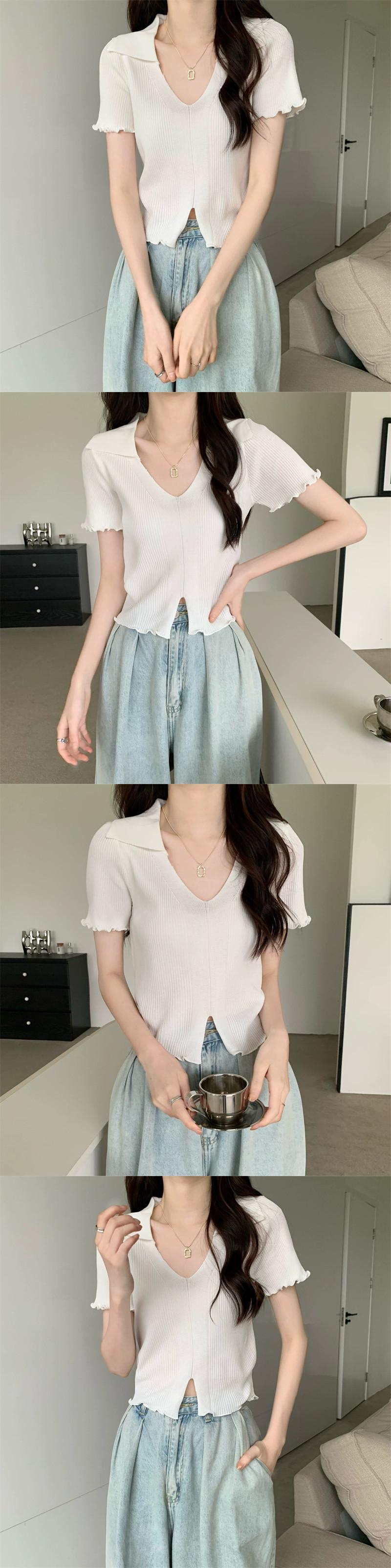 ホワイトフロントショルダー V ネック半袖 Tシャツ女性の夏のニッチファッション Eign スタイル木耳薄セクションアイスシルクニットショートトップ サマー 夏物 Vネック 7460077383392067 | framboise21