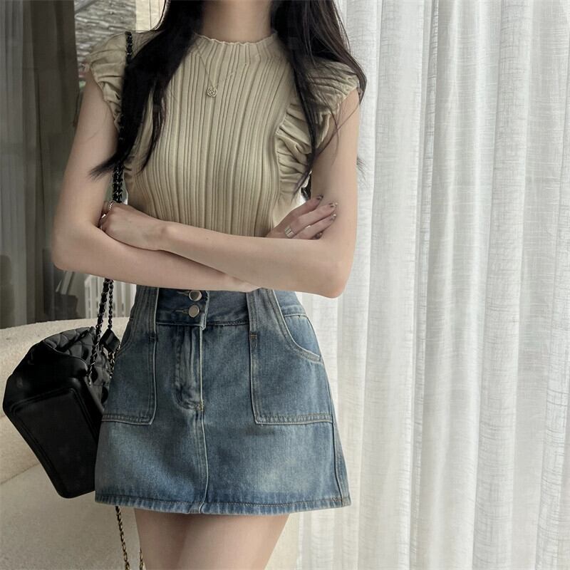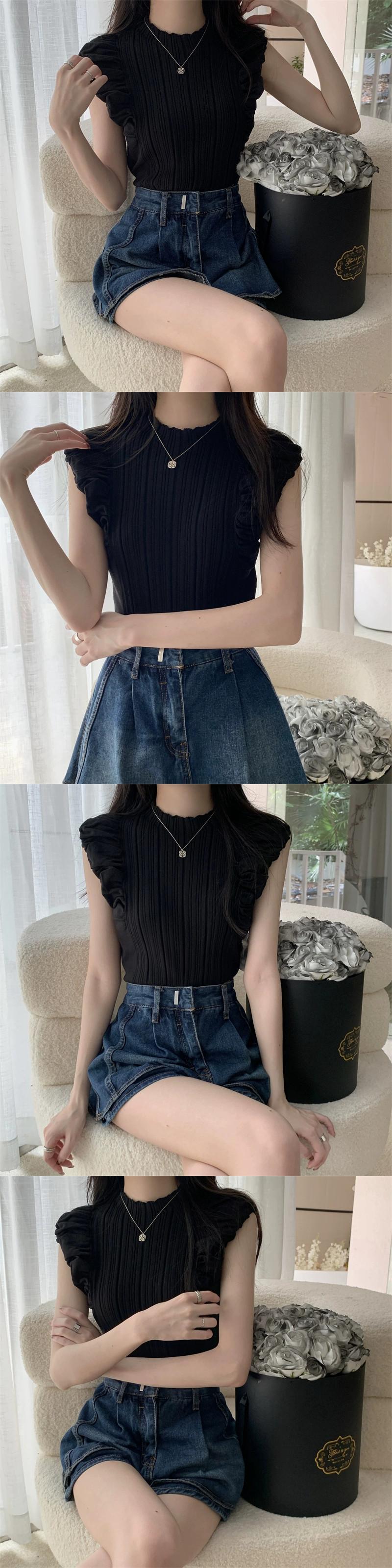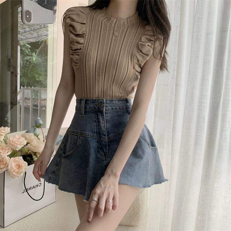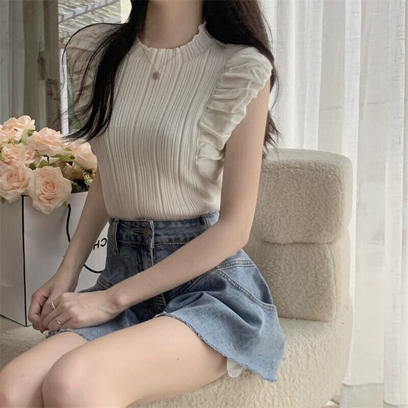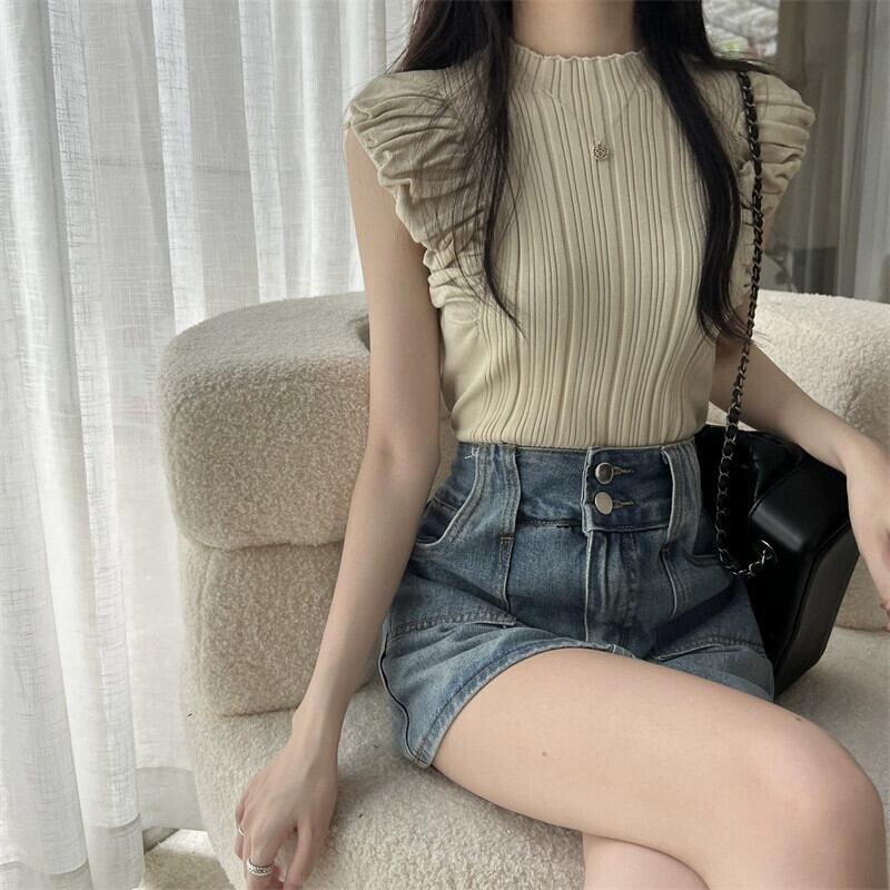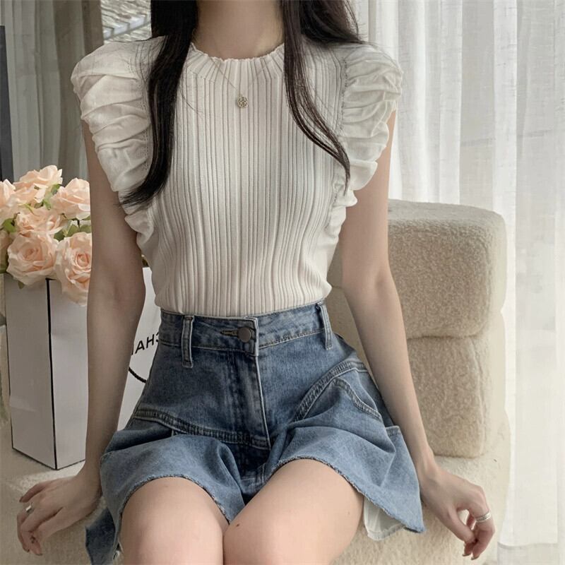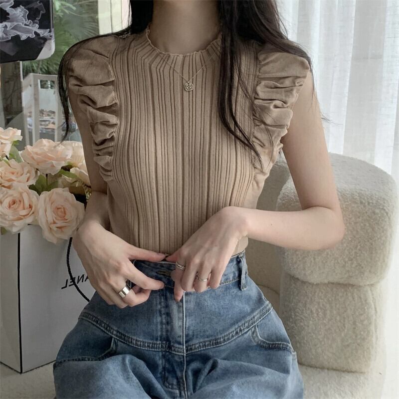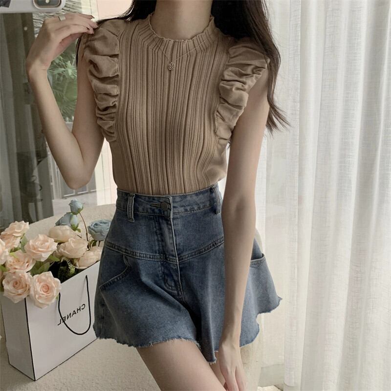 プリーツノースリーブアイスシルクニットセーターレディース夏フレンチレトロデザイン自己修養の感覚と薄いショートラウンドネックトップアプリコット サマー 夏物 Oネック 7460067266087010 | framboise21