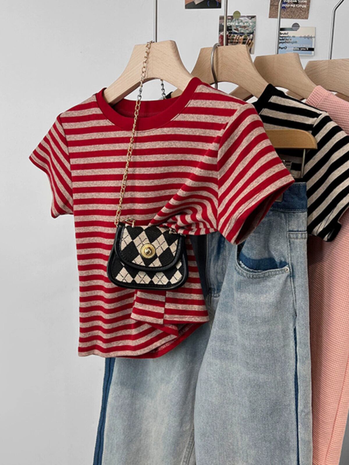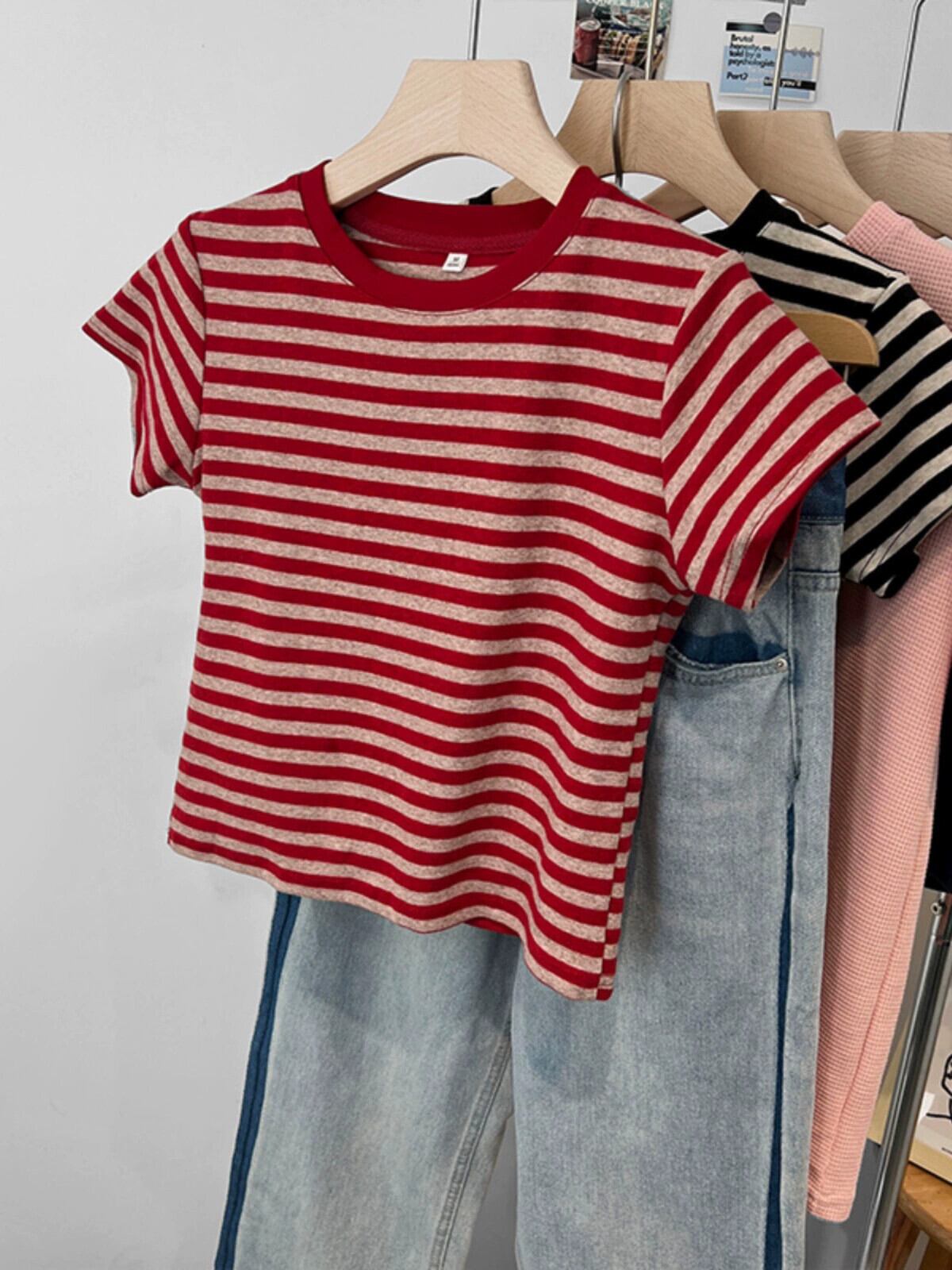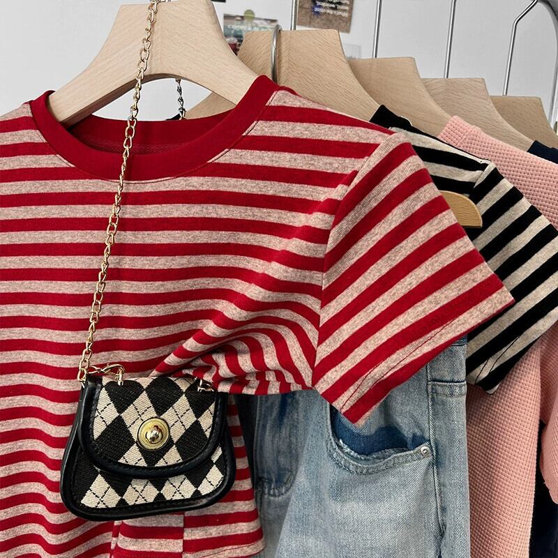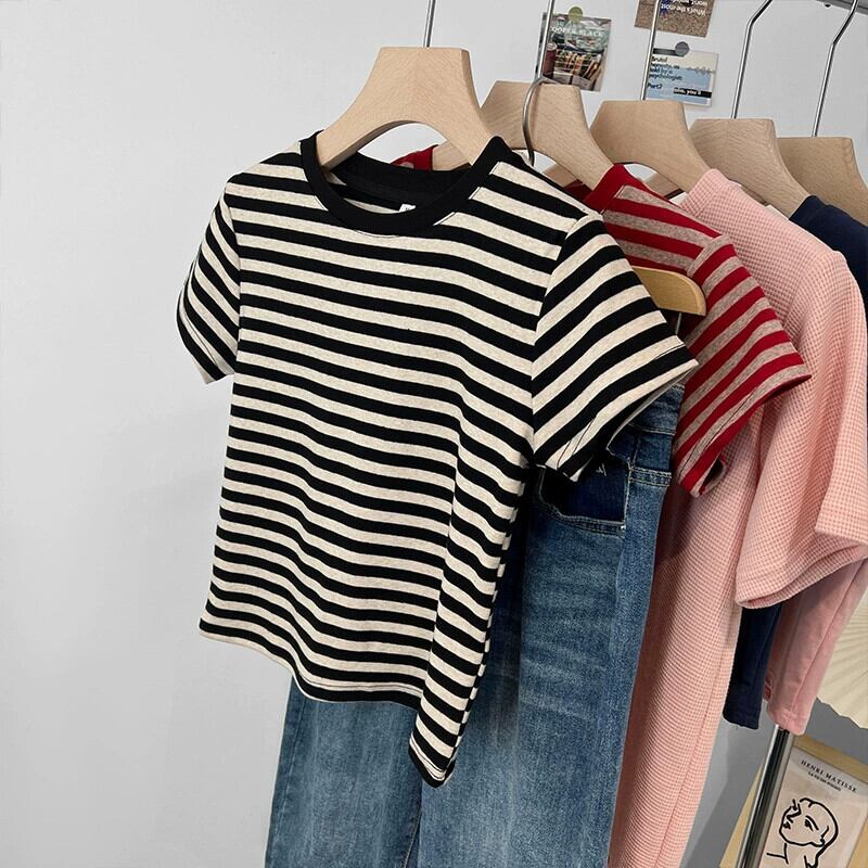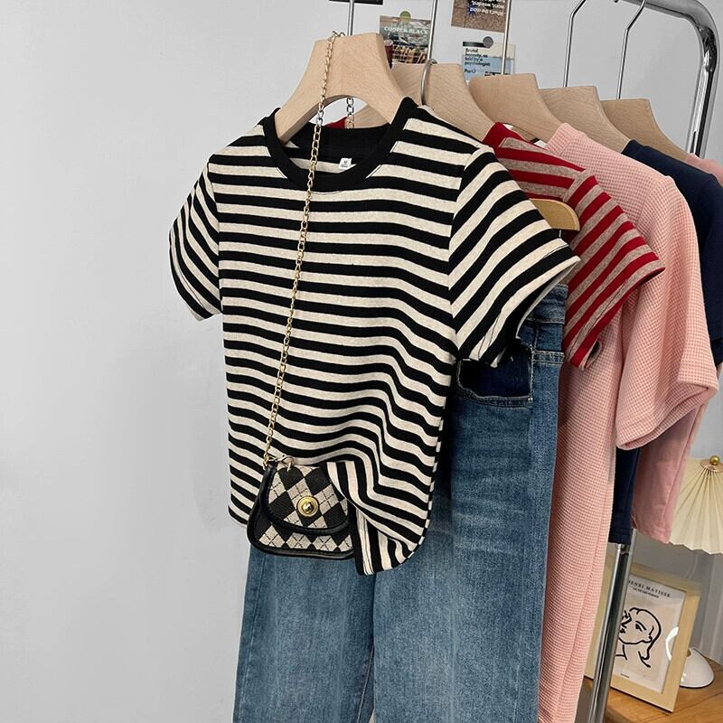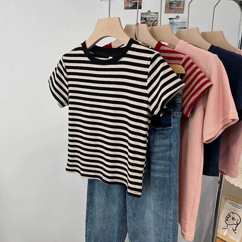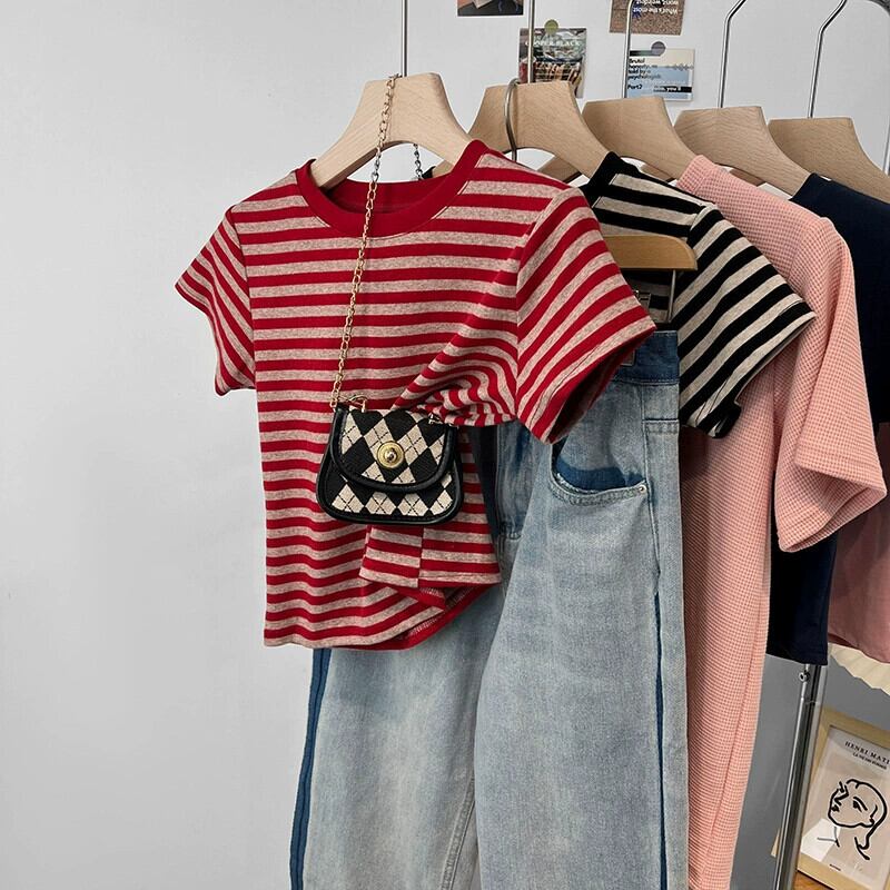レッドストライプフロントショルダー半袖Tシャツレディース2023年夏新作アメリカンデザインセンスハイウエストショートトップ ハイウェスト サマー 夏物 7460033696562555 | framboise21