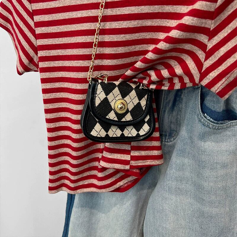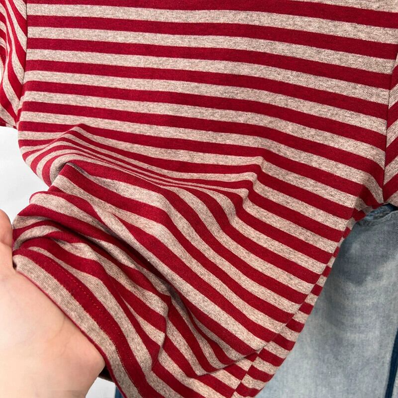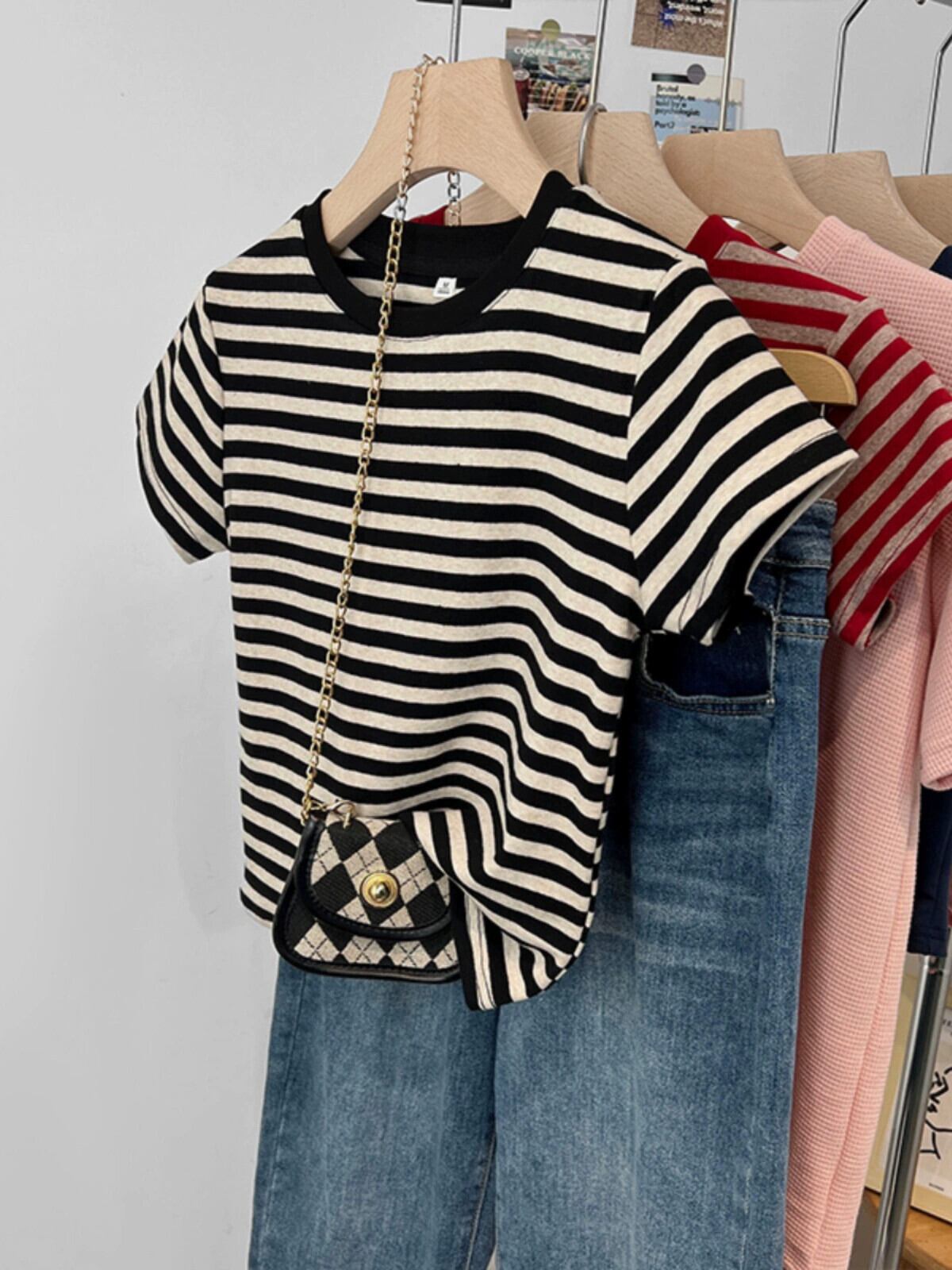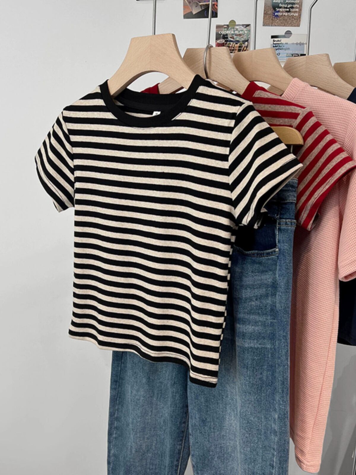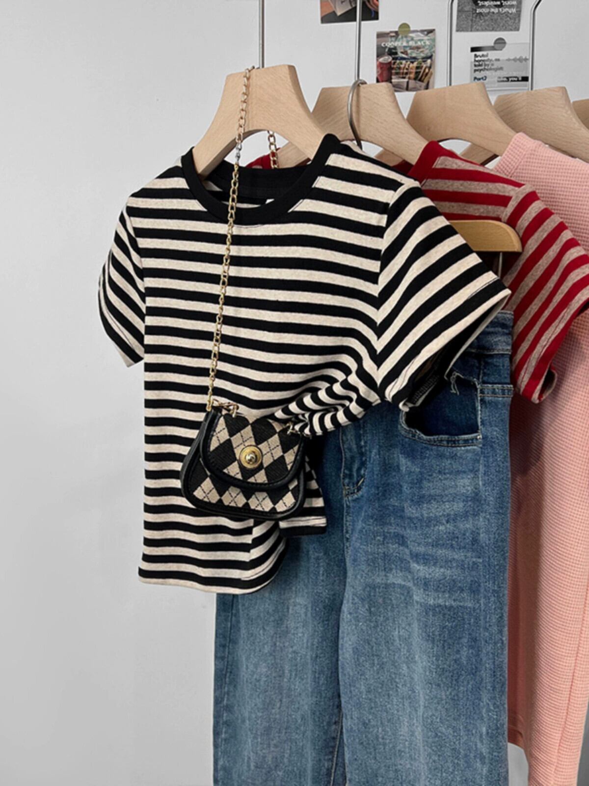 レッドストライプフロントショルダー半袖Tシャツレディース2023年夏新作アメリカンデザインセンスハイウエストショートトップ ハイウェスト サマー 夏物 7460033696562555 | framboise21