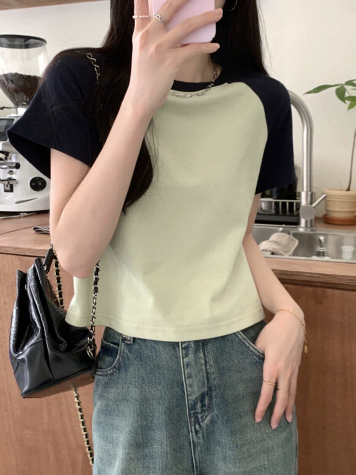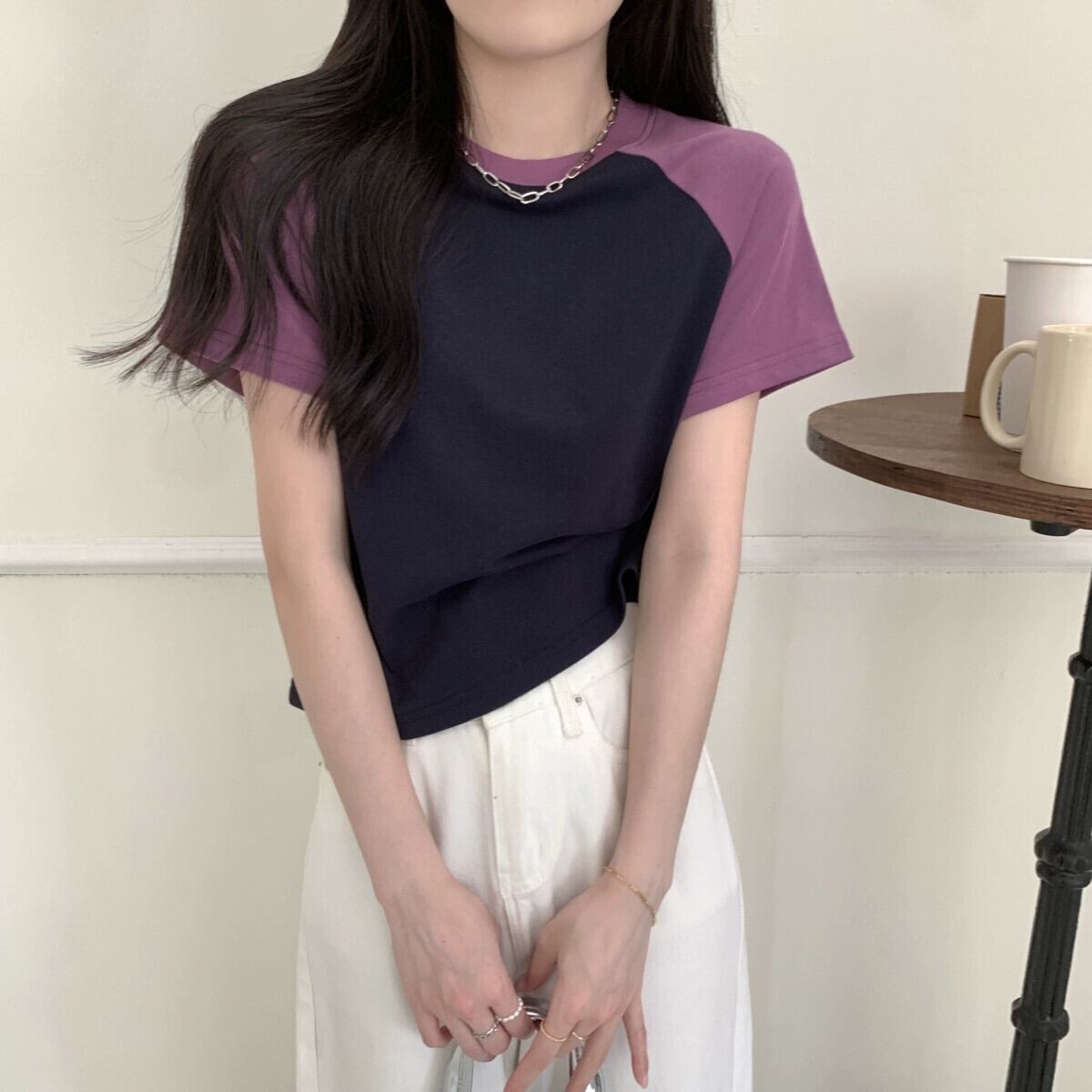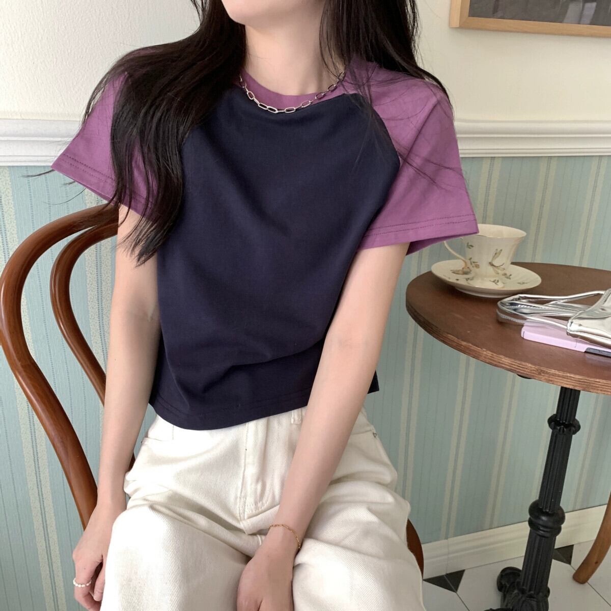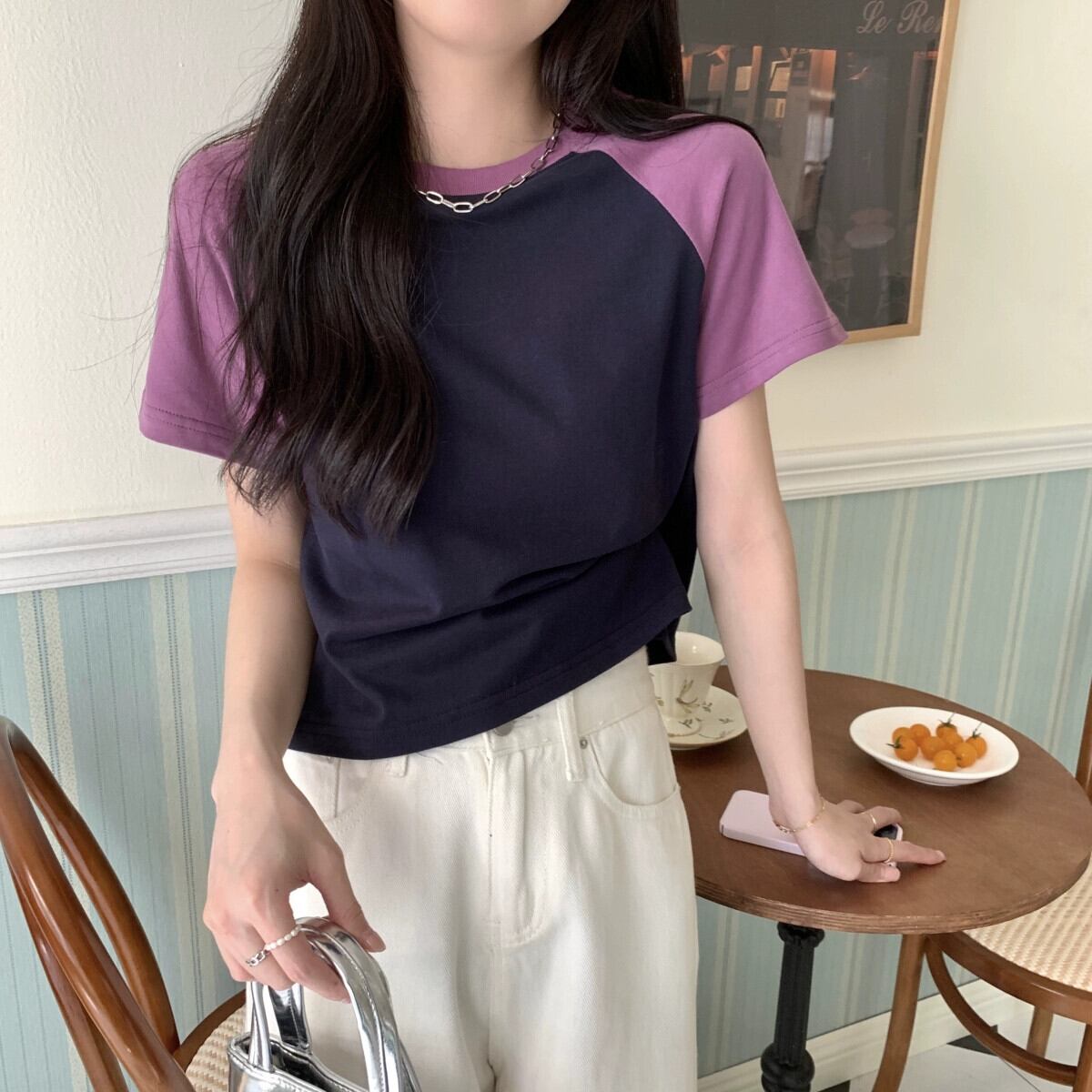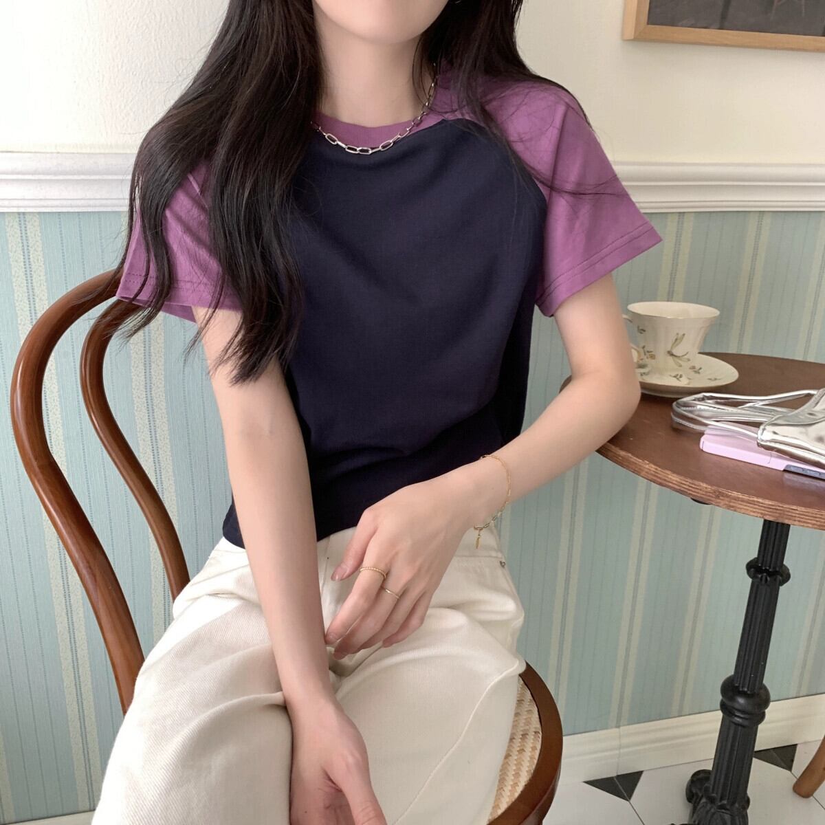 コントラストカラーのラグランショルダー半袖Tシャツレディース夏アメリカンレトロニッチデザインルーズで汎用性の高いラウンドネックショートトップ潮 サマー 夏物 Oネック 7460025604722608 | framboise21