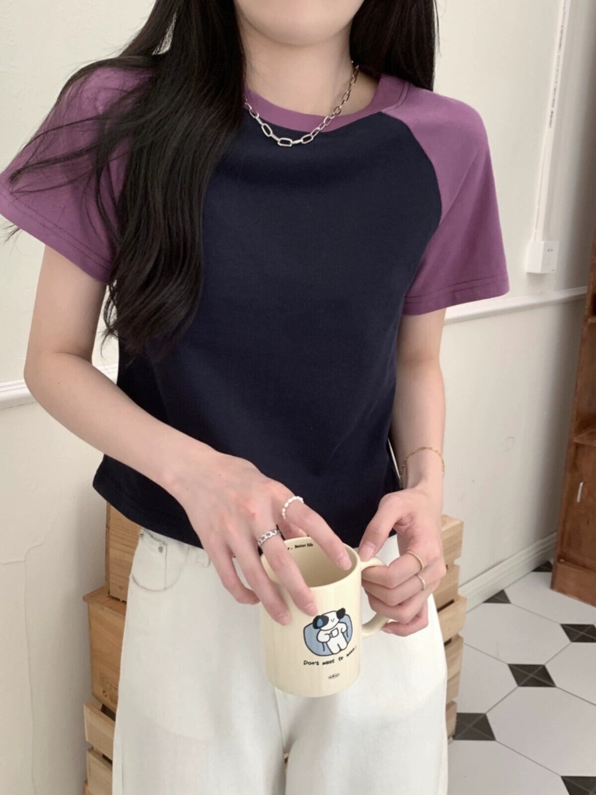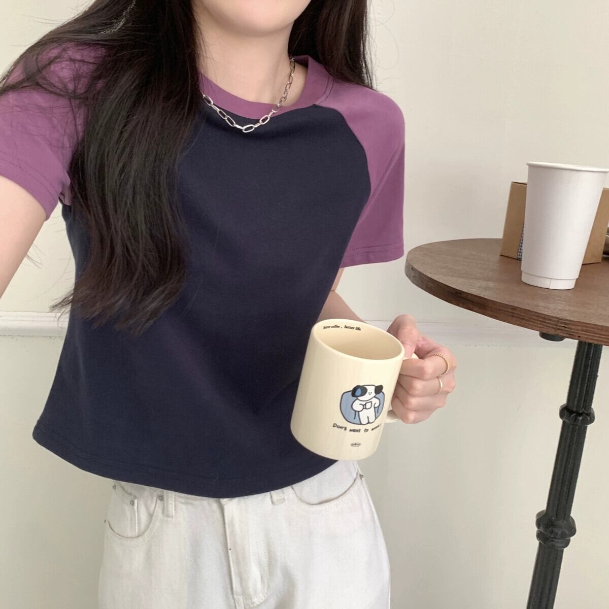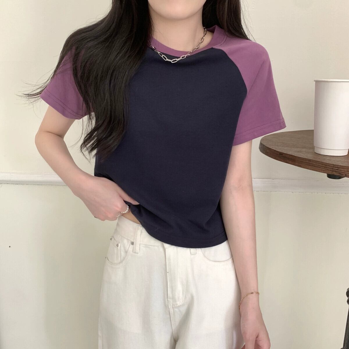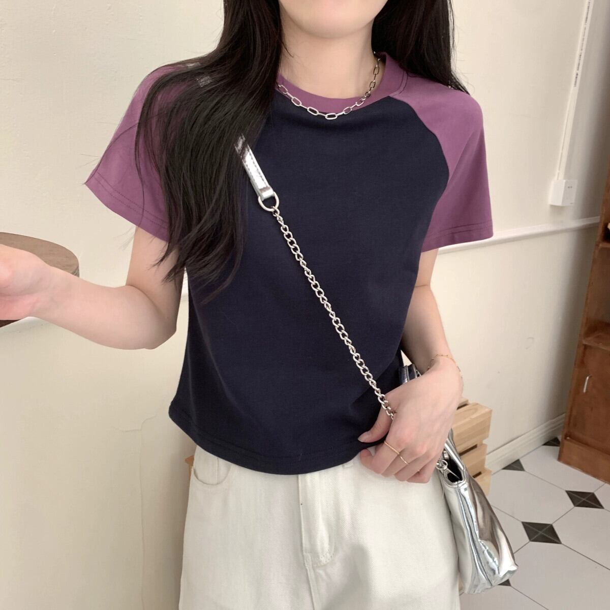コントラストカラーのラグランショルダー半袖Tシャツレディース夏アメリカンレトロニッチデザインルーズで汎用性の高いラウンドネックショートトップ潮 サマー 夏物 Oネック 7460025604722608 | framboise21