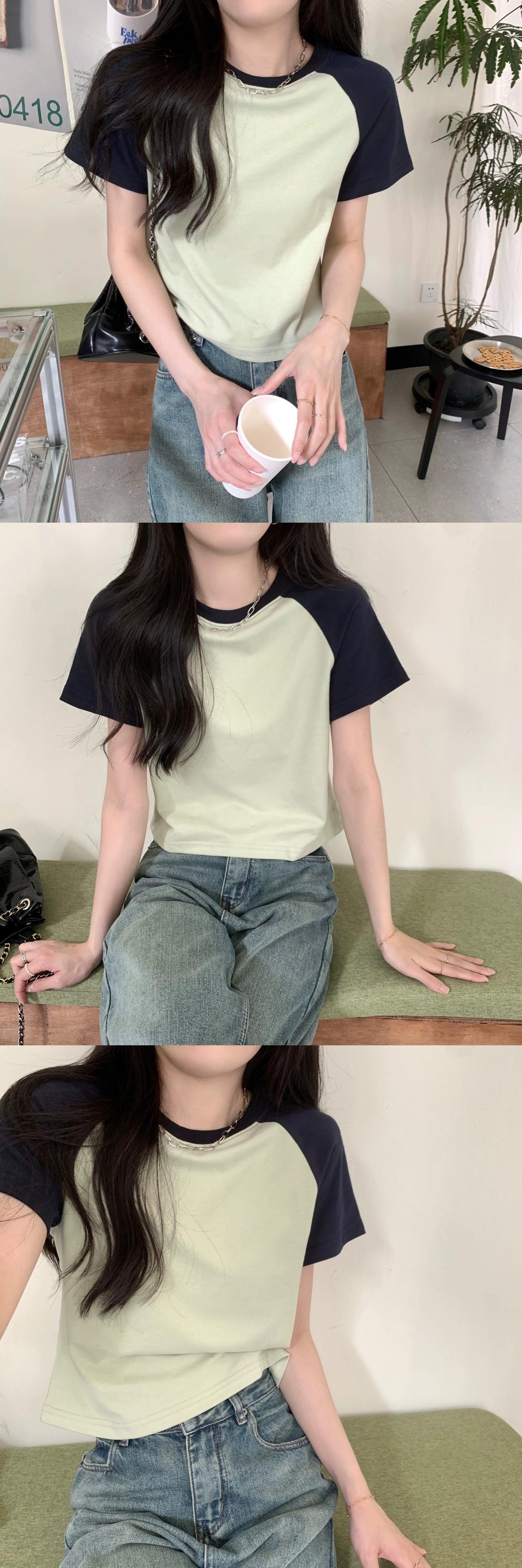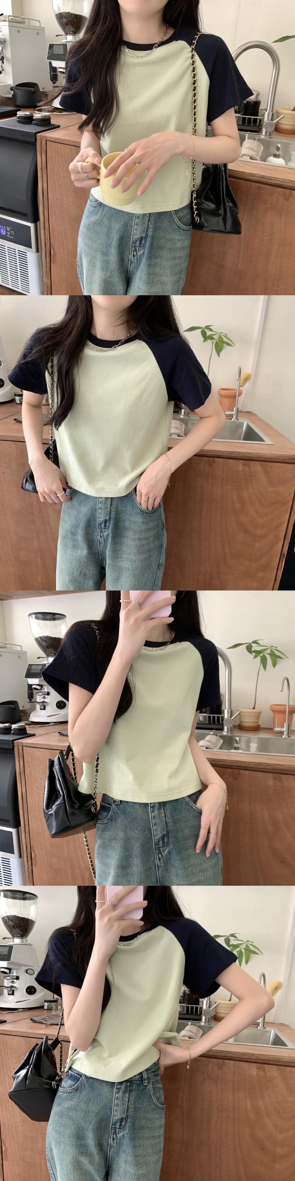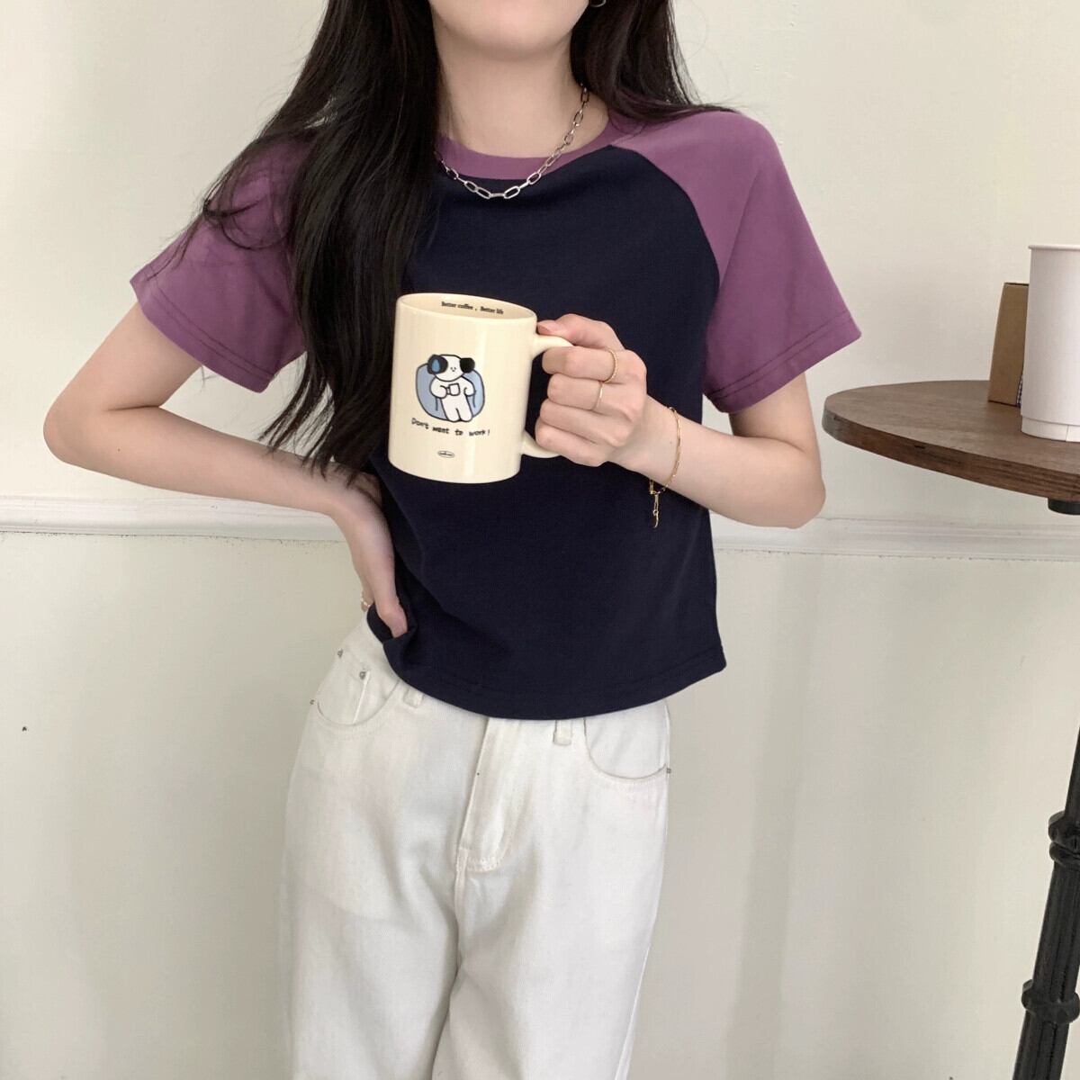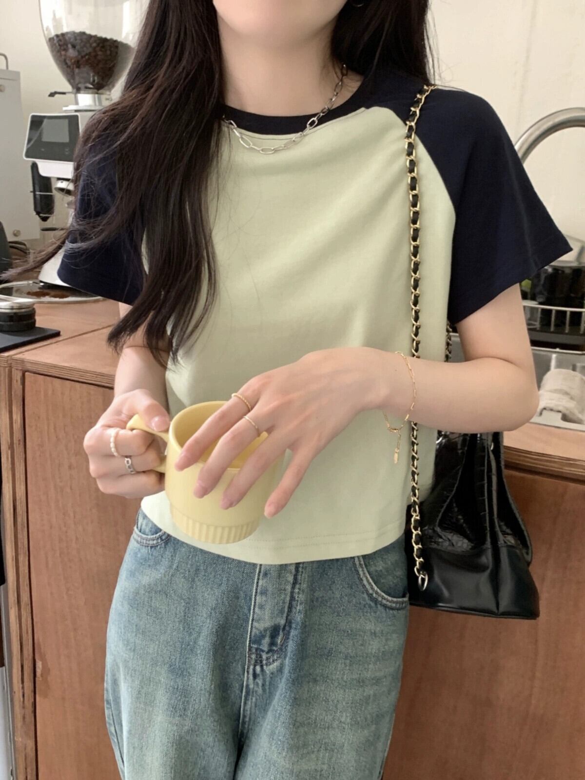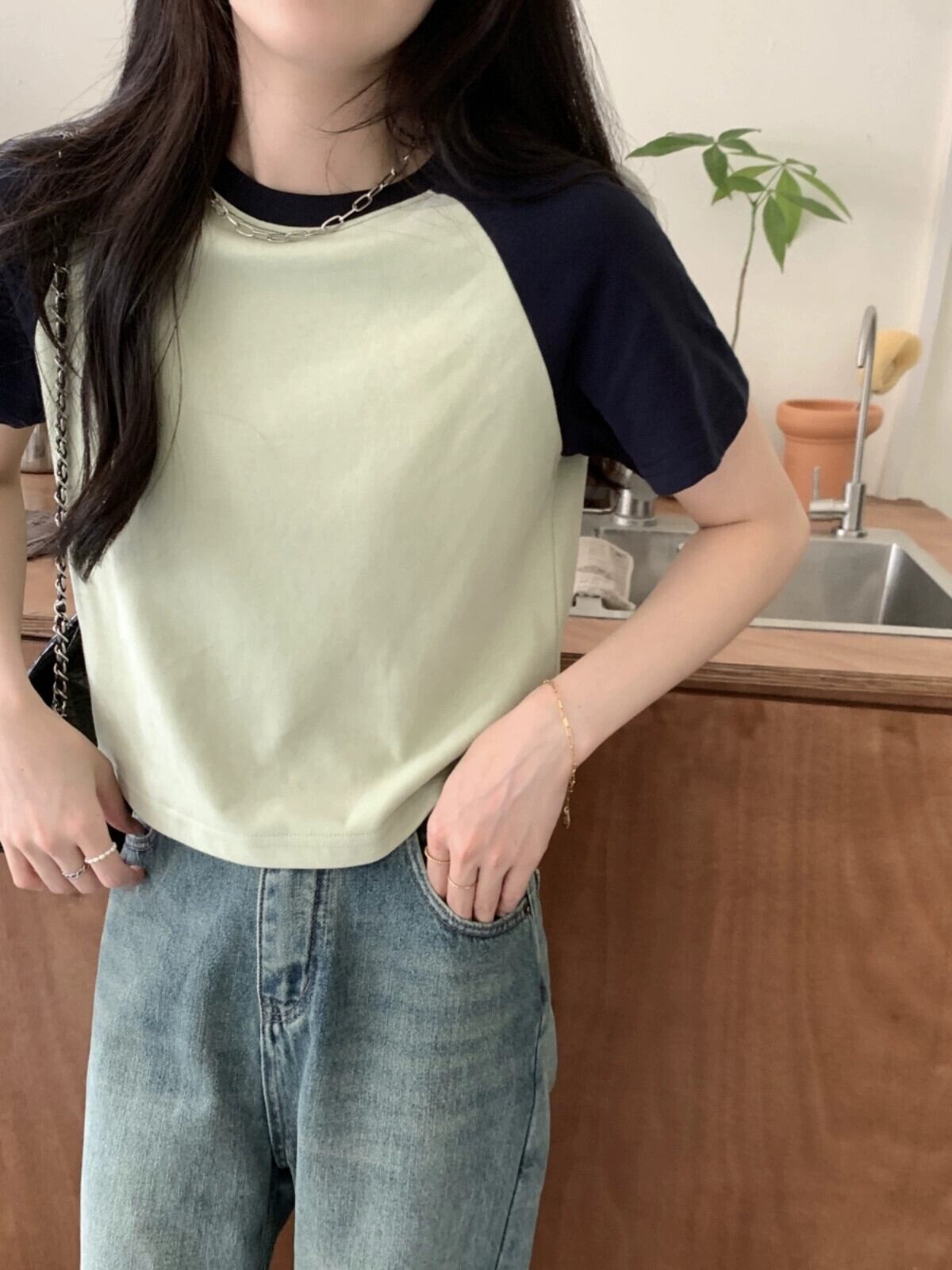コントラストカラーのラグランショルダー半袖Tシャツレディース夏アメリカンレトロニッチデザインルーズで汎用性の高いラウンドネックショートトップ潮 サマー 夏物 Oネック 7460025604722608 | framboise21