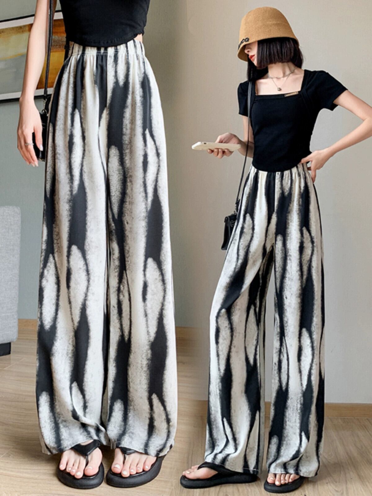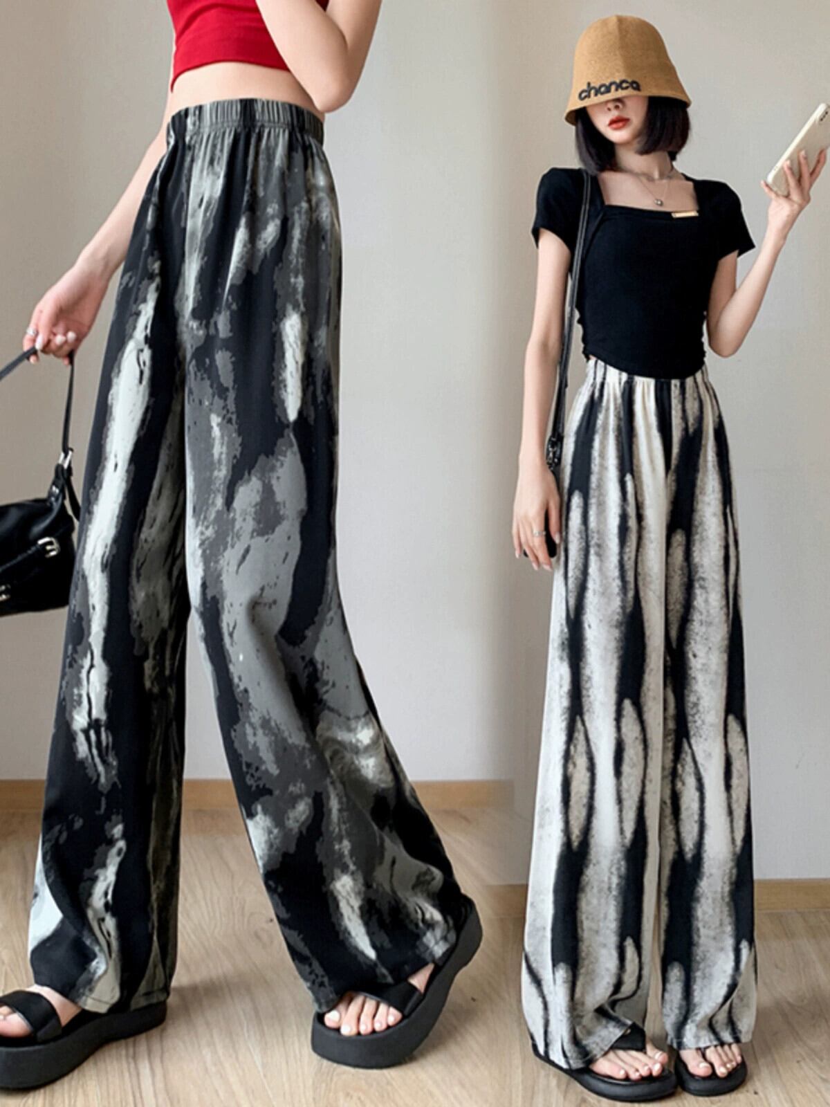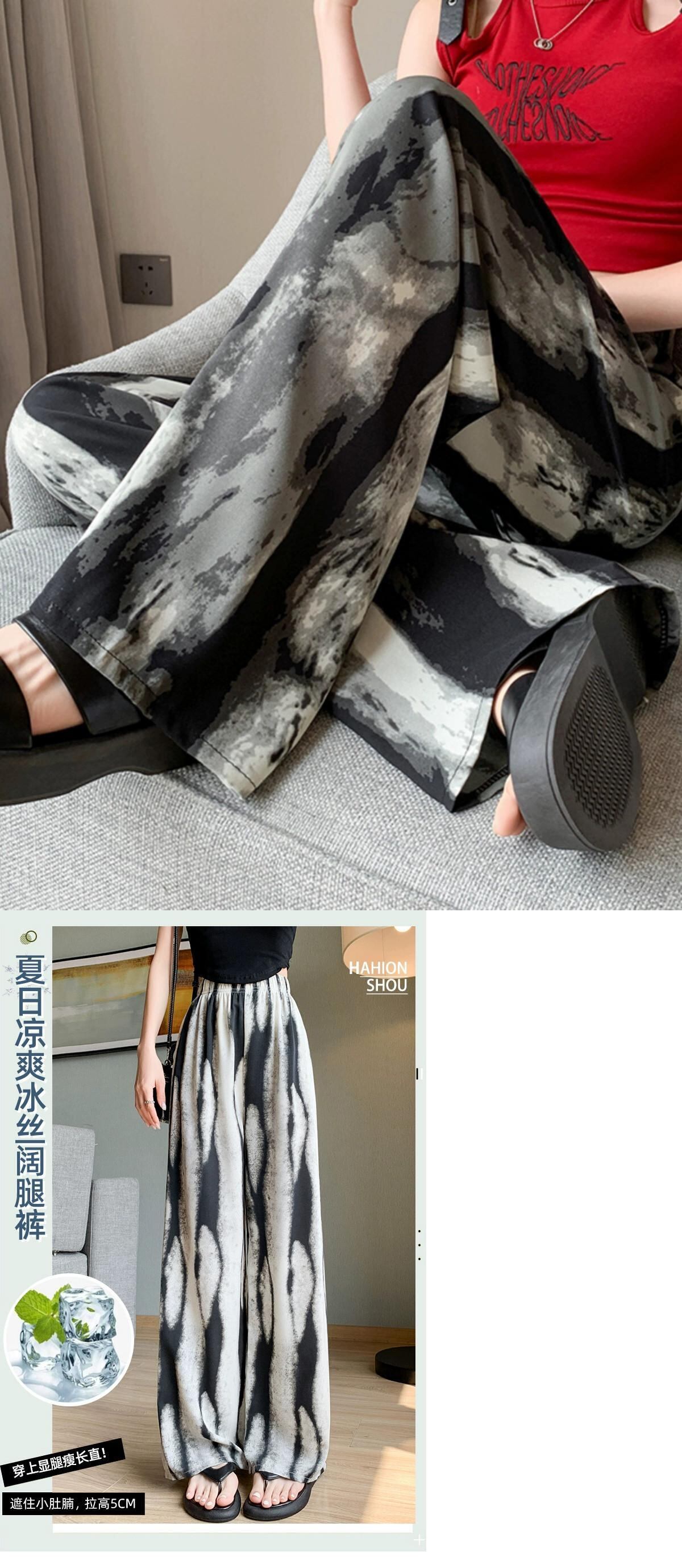 タイダイアイスシルクワイドレッグパンツレディース夏薄セクションドレーププリントパンツルーズカジュアルストレートハイウエストモップパンツ ハイウェスト サマー 夏物 746002640090934 | framboise21
