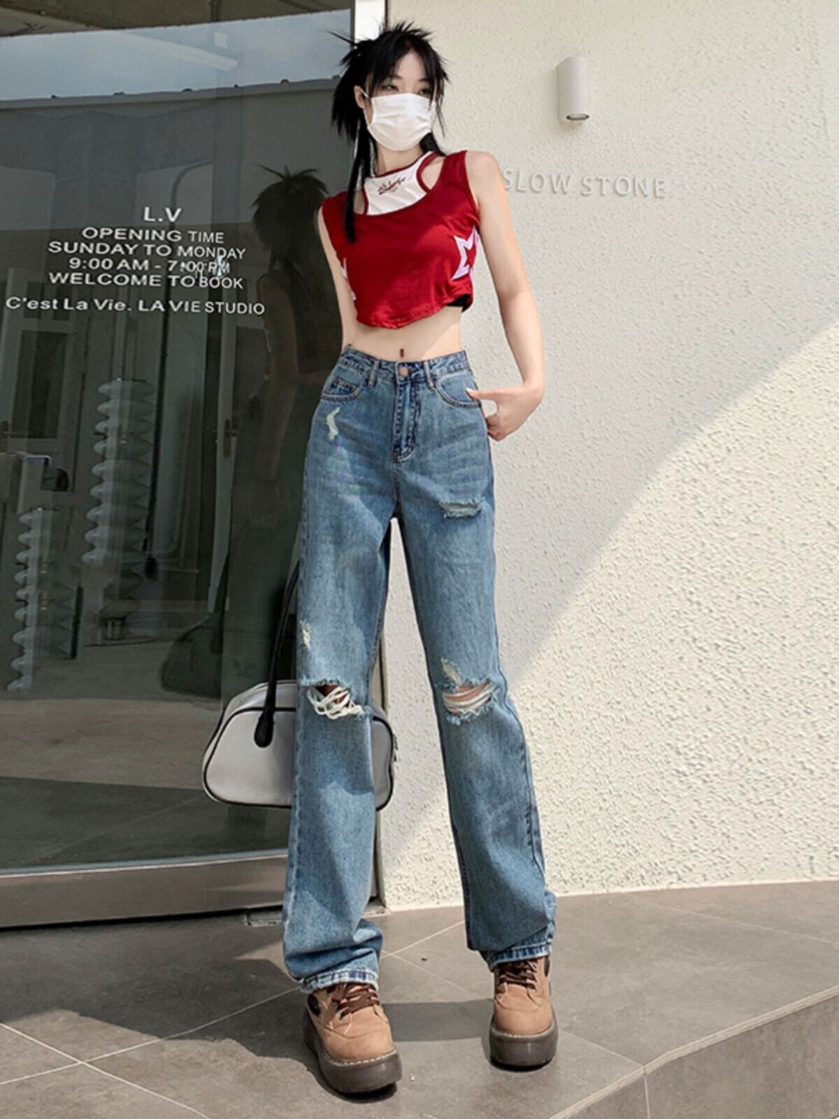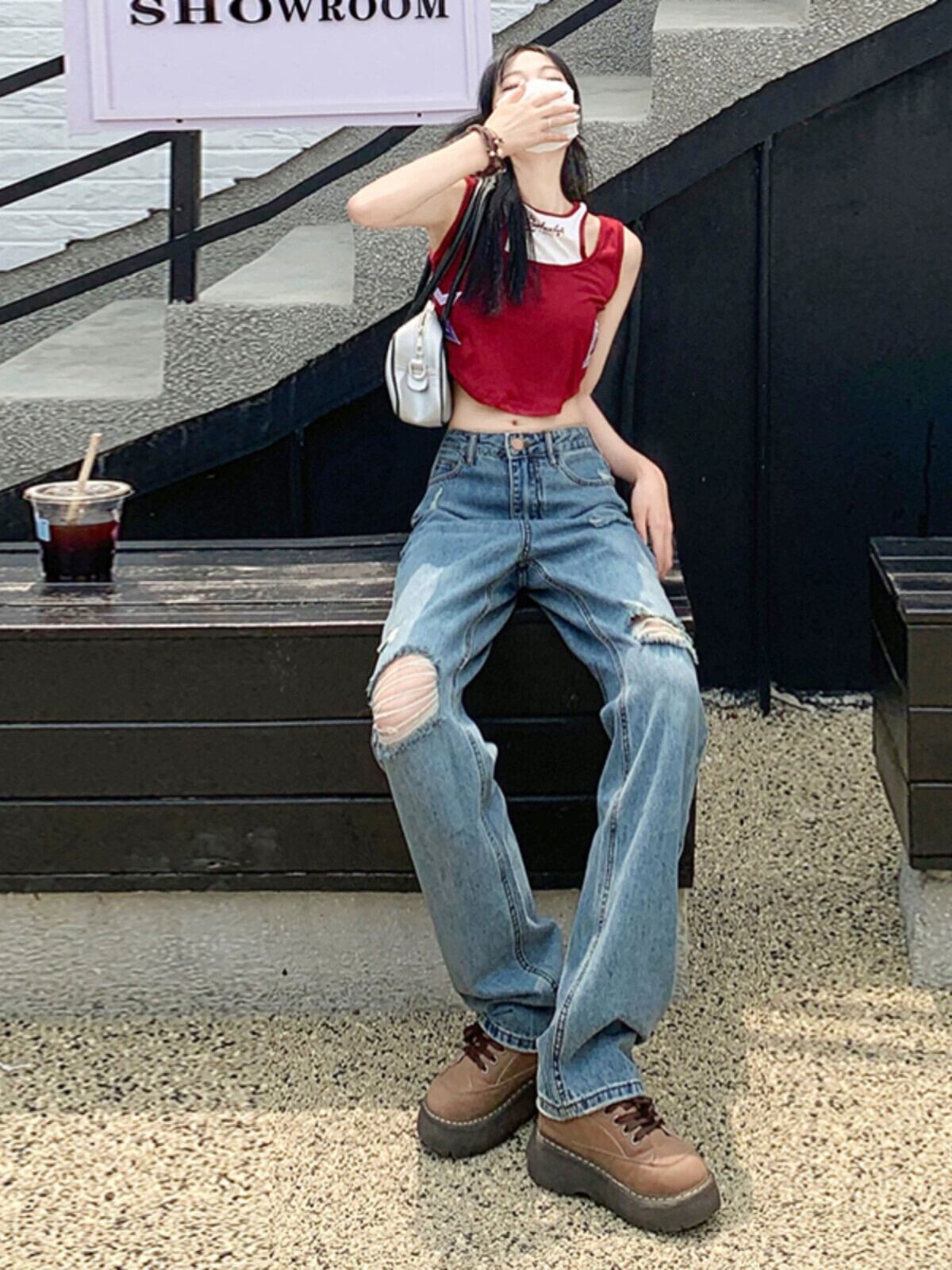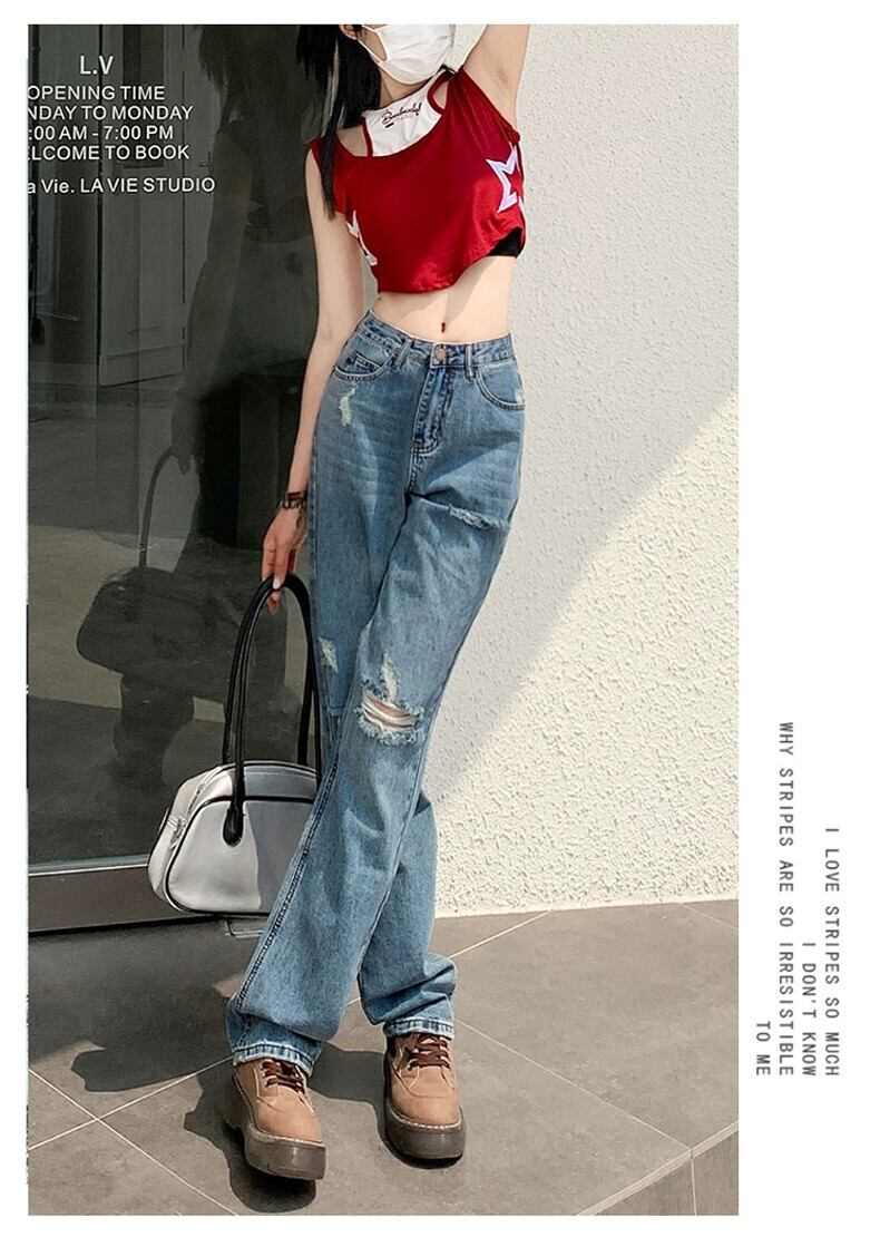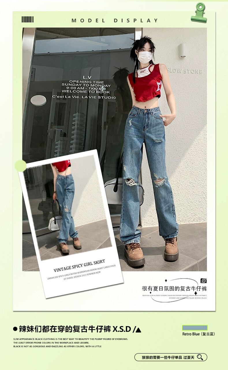 アメリカンレトロリップドジーンズレディース夏ルーズドレープストレートレッグワイドレッグパンツスリムハイウエストモップロングパンツトレンディ ハイウェスト サマー 夏物 ワイドパンツ 7460047305939283 | framboise21