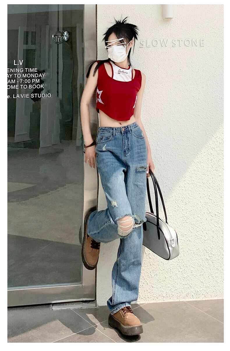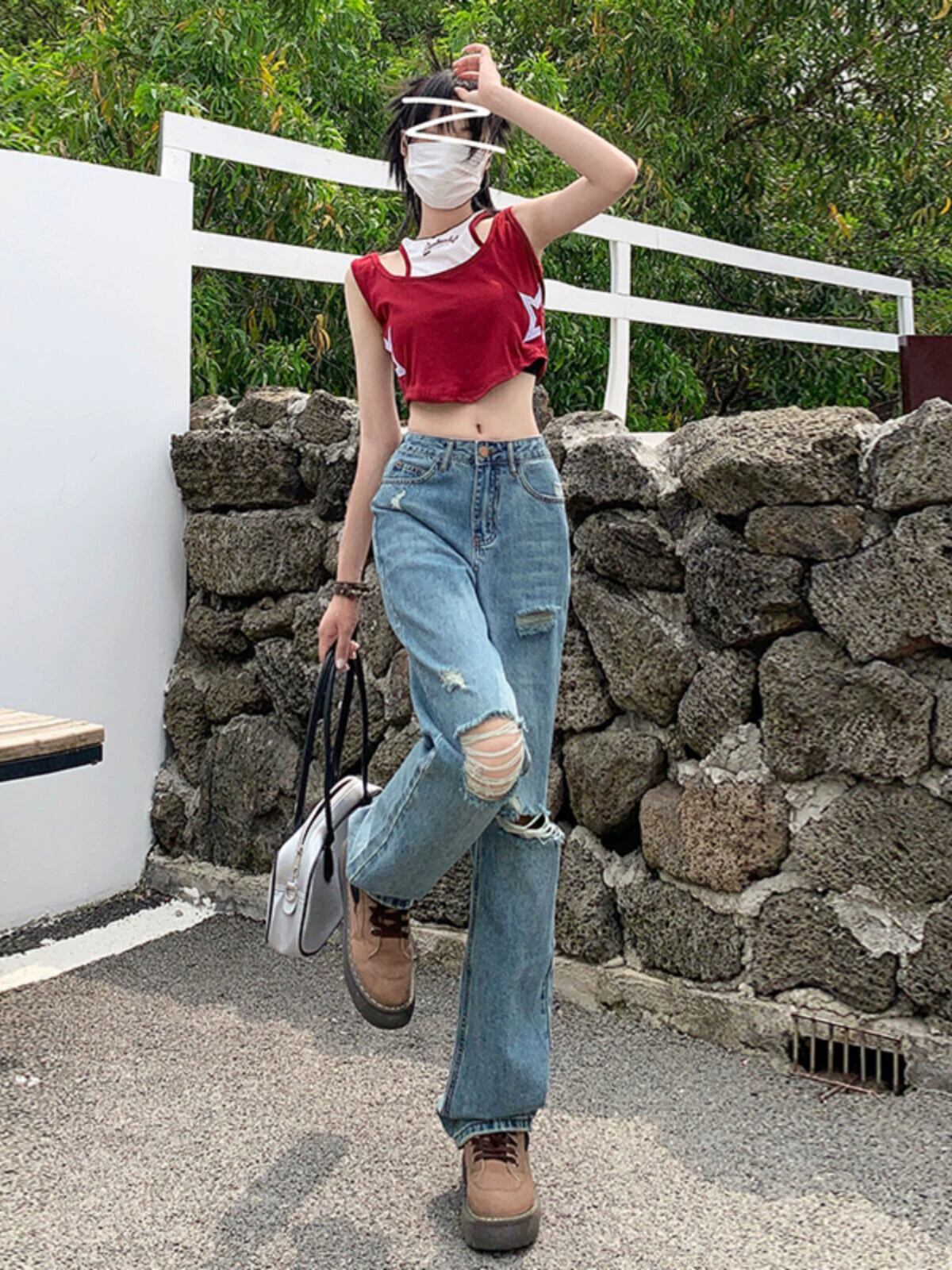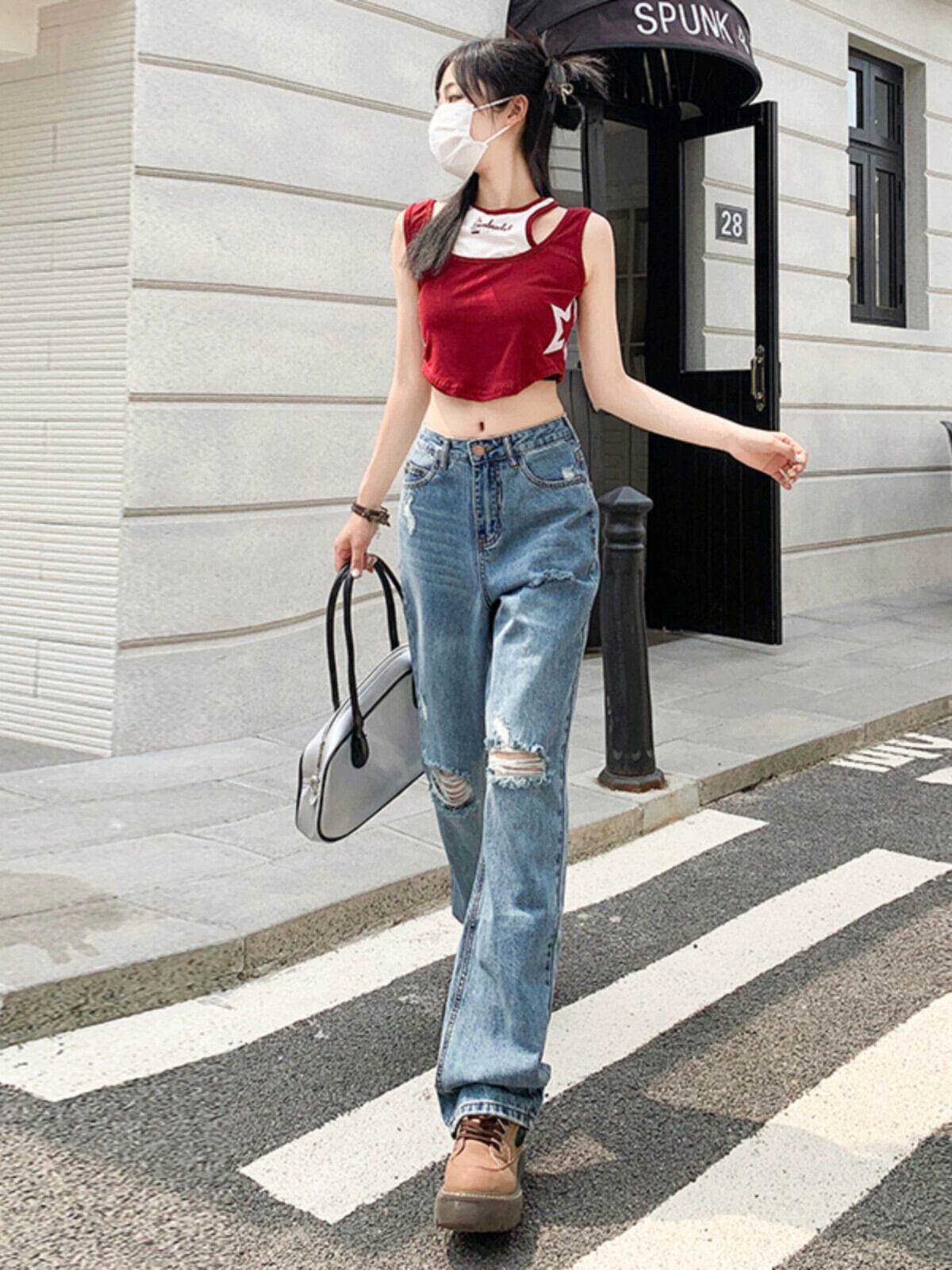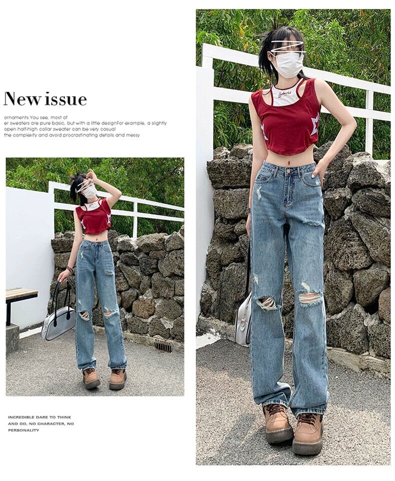 アメリカンレトロリップドジーンズレディース夏ルーズドレープストレートレッグワイドレッグパンツスリムハイウエストモップロングパンツトレンディ ハイウェスト サマー 夏物 ワイドパンツ 7460047305939283 | framboise21