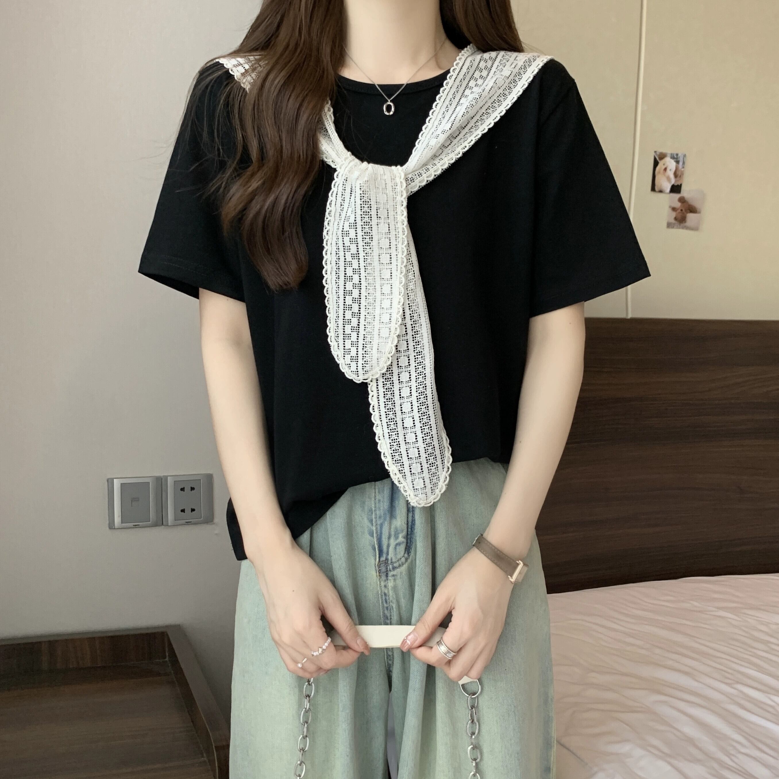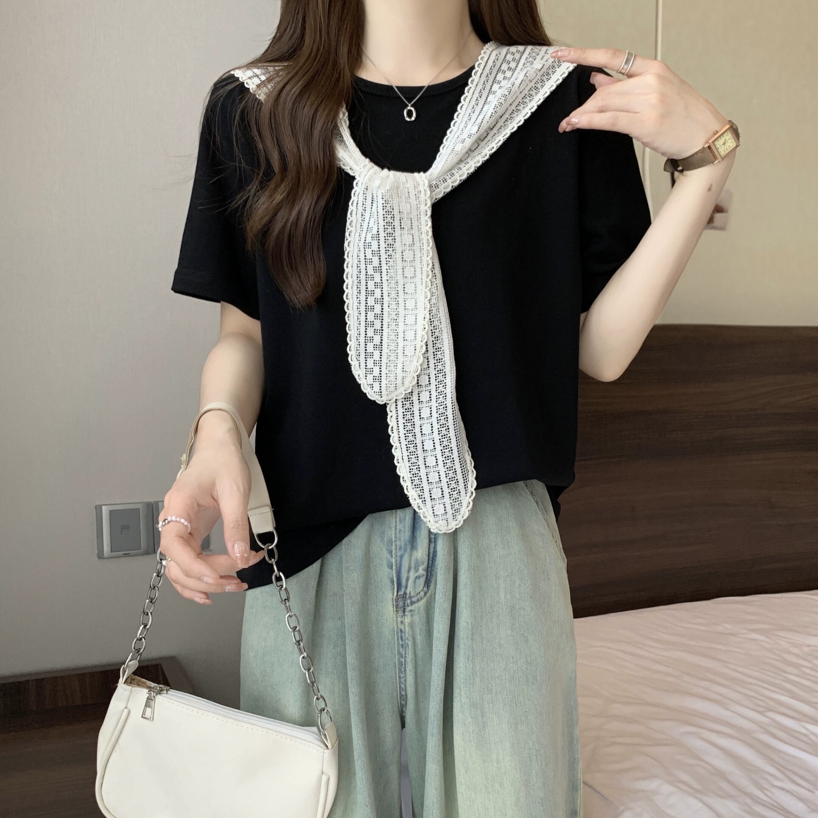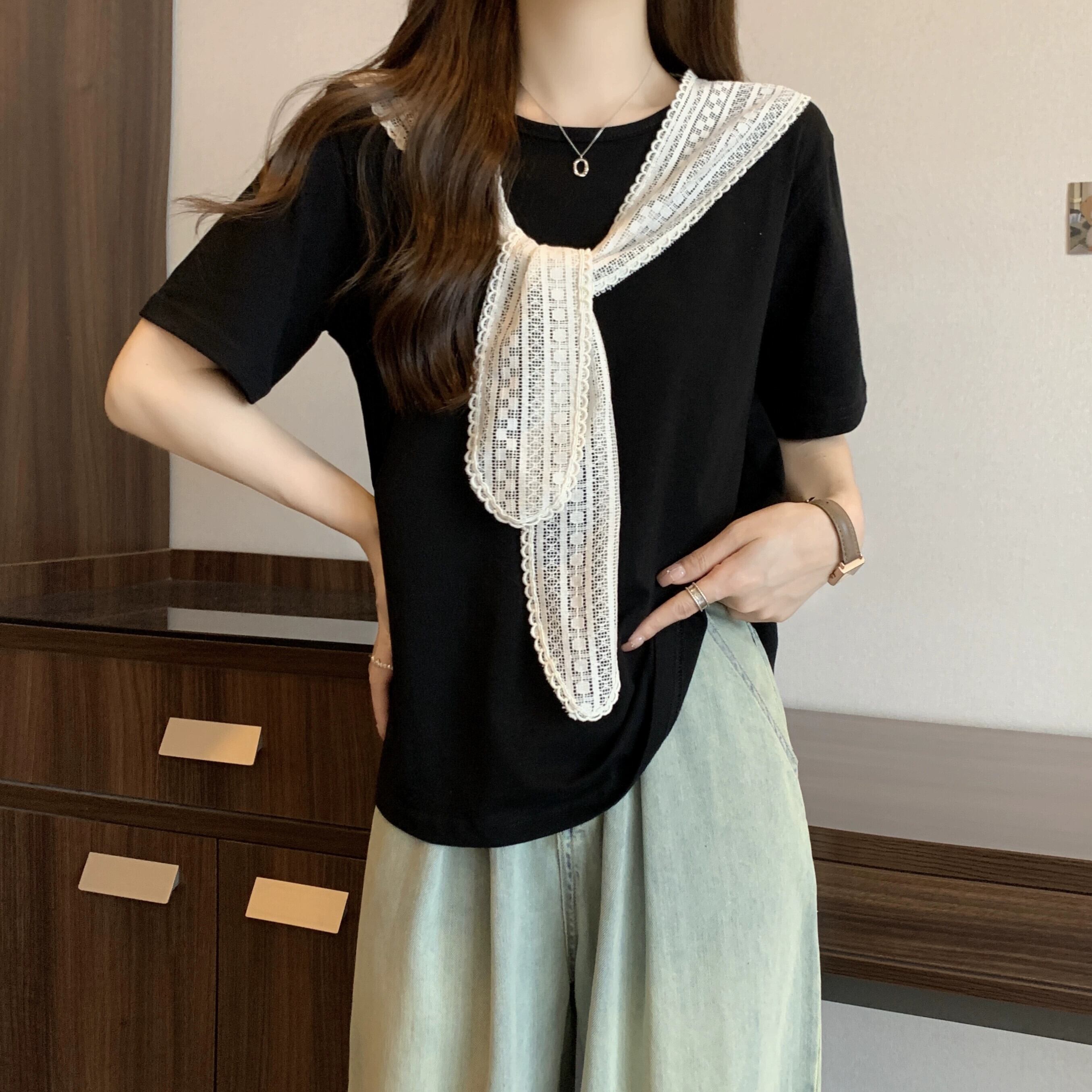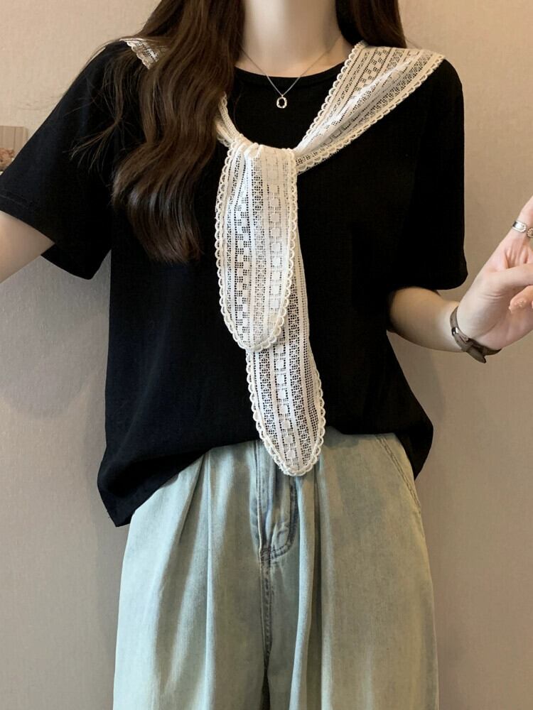 黒フロントショルダー半袖 t シャツの女性の夏のファッションデザインルーズで多用途なフェイクツーピースレースショールトップ潮 ブラック サマー 夏物 Tシャツ 7460016021651903 | framboise21