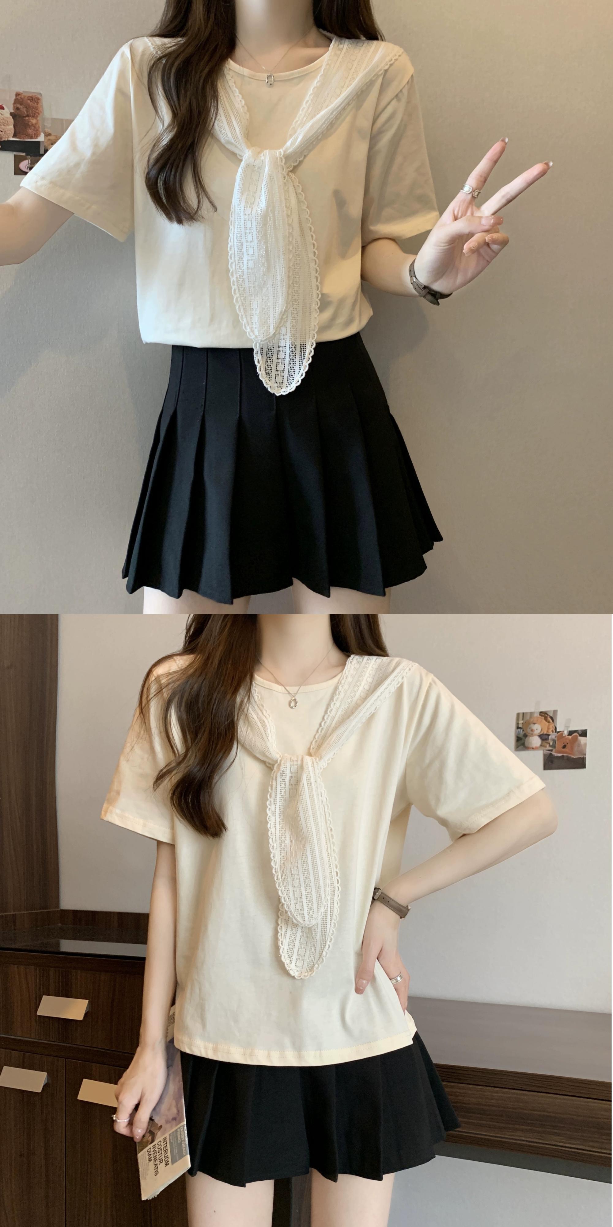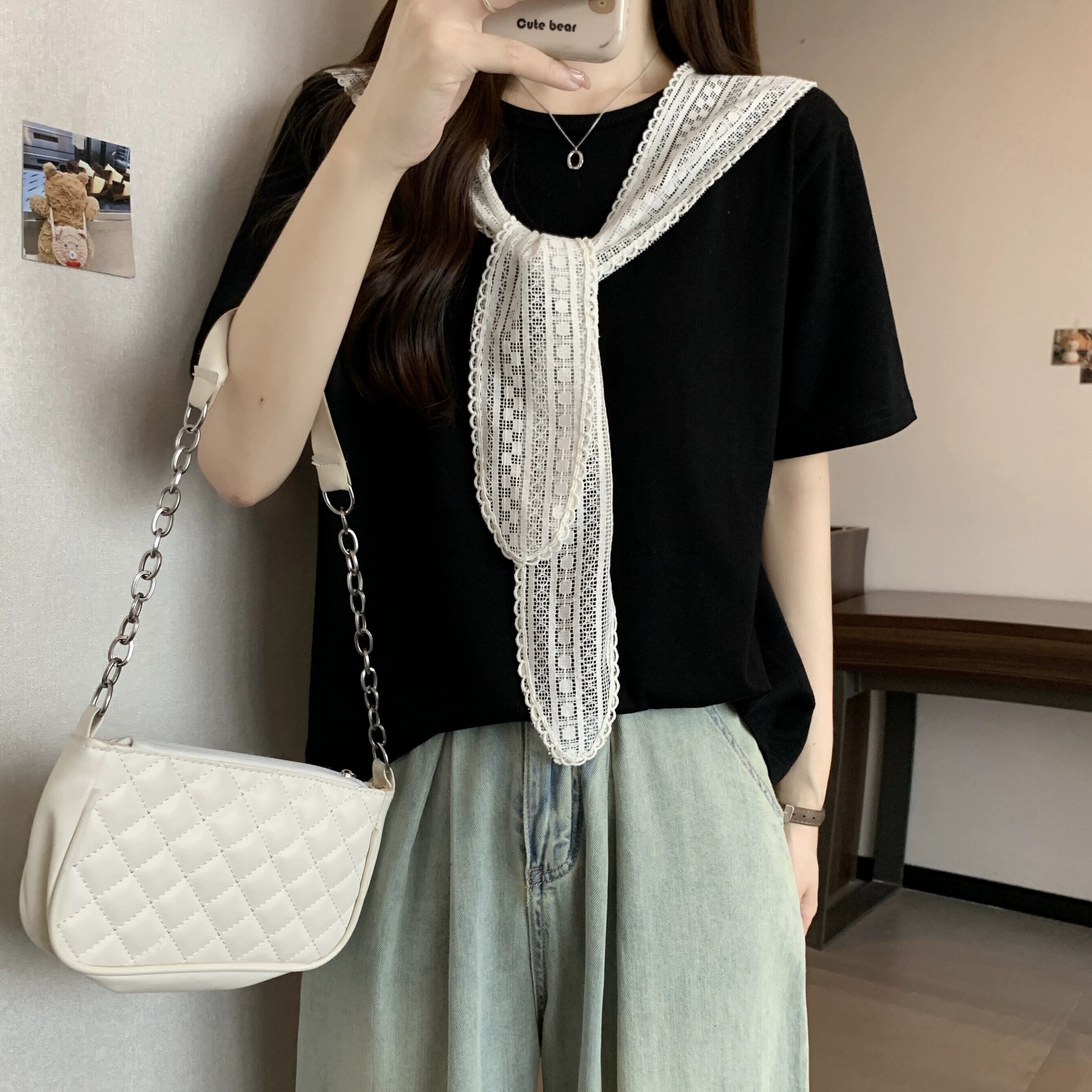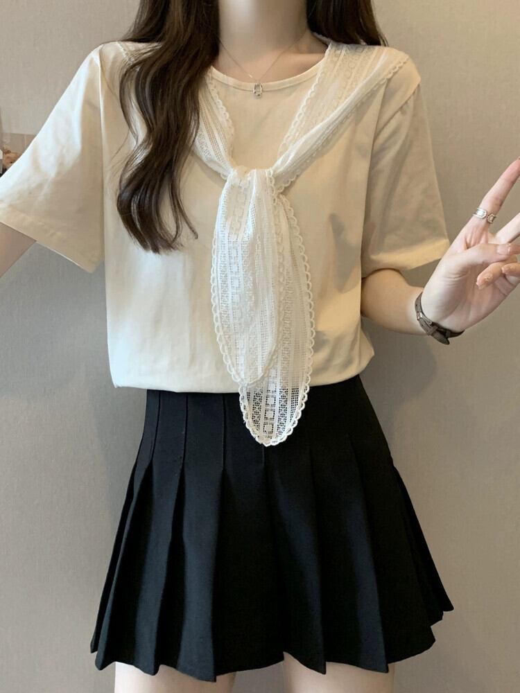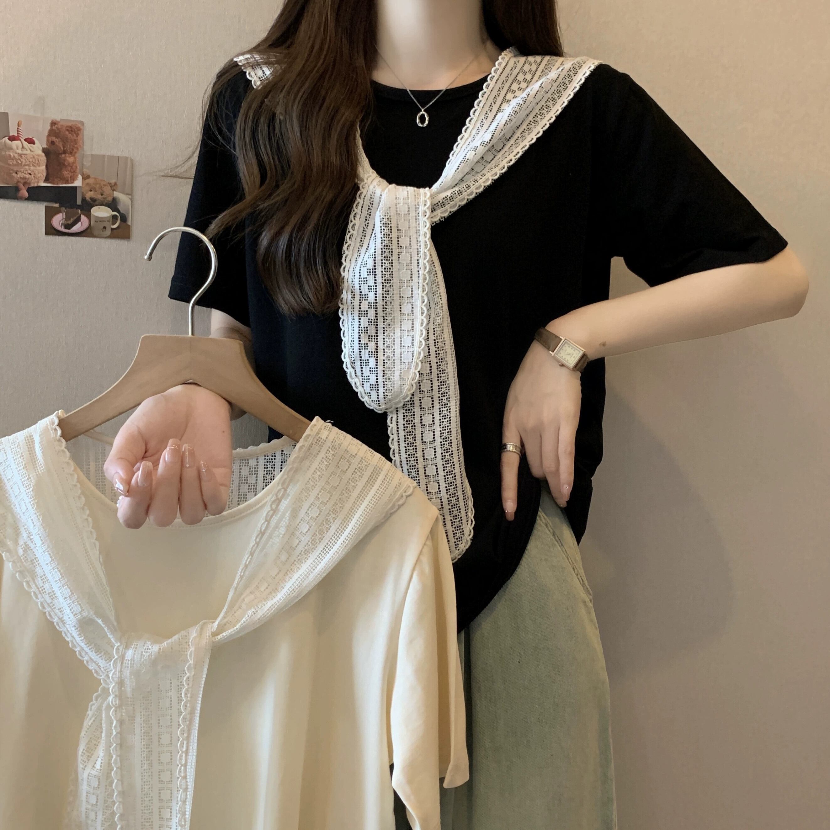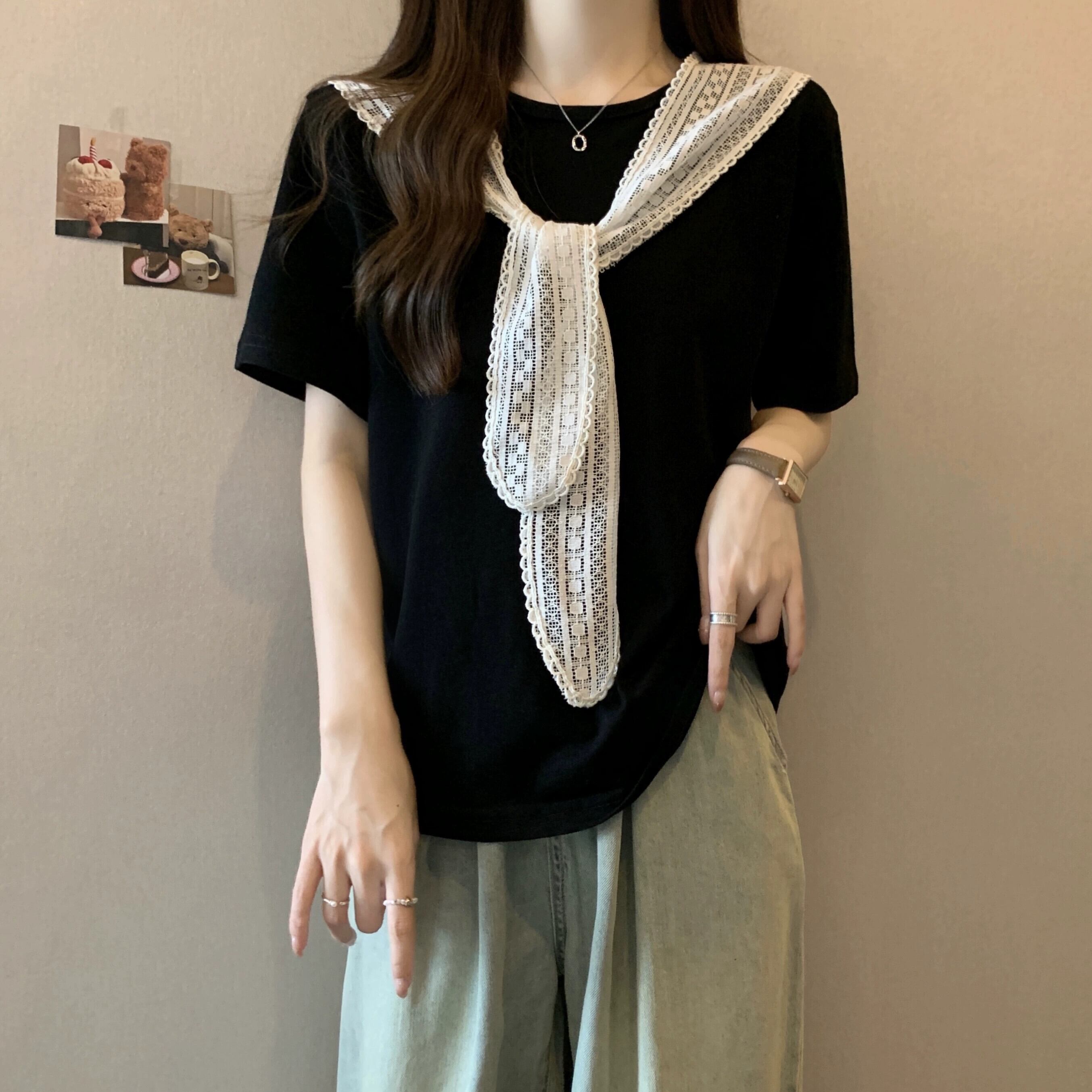 黒フロントショルダー半袖 t シャツの女性の夏のファッションデザインルーズで多用途なフェイクツーピースレースショールトップ潮 ブラック サマー 夏物 Tシャツ 7460016021651903 | framboise21