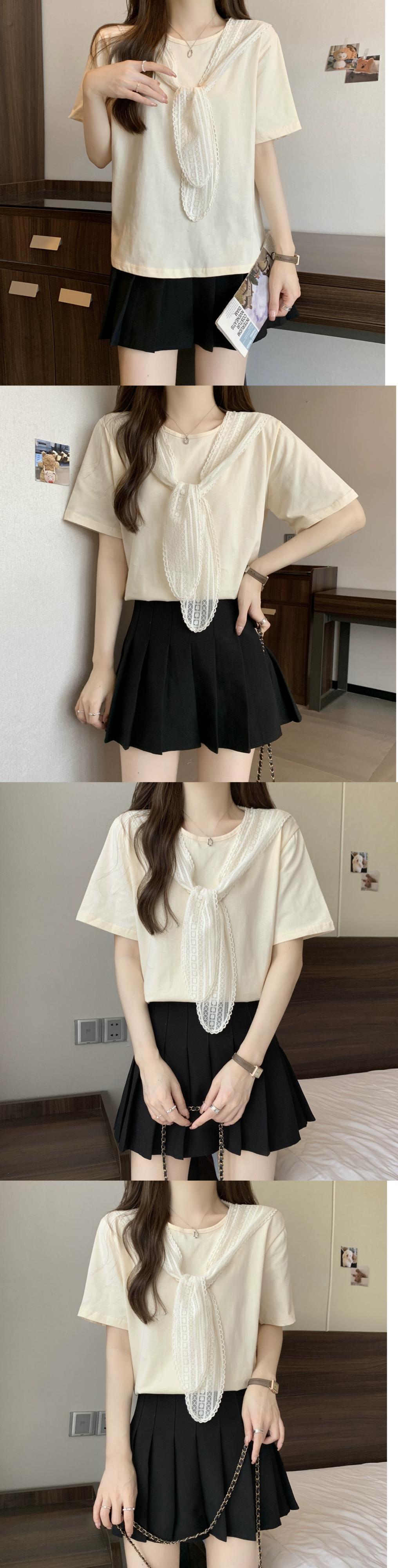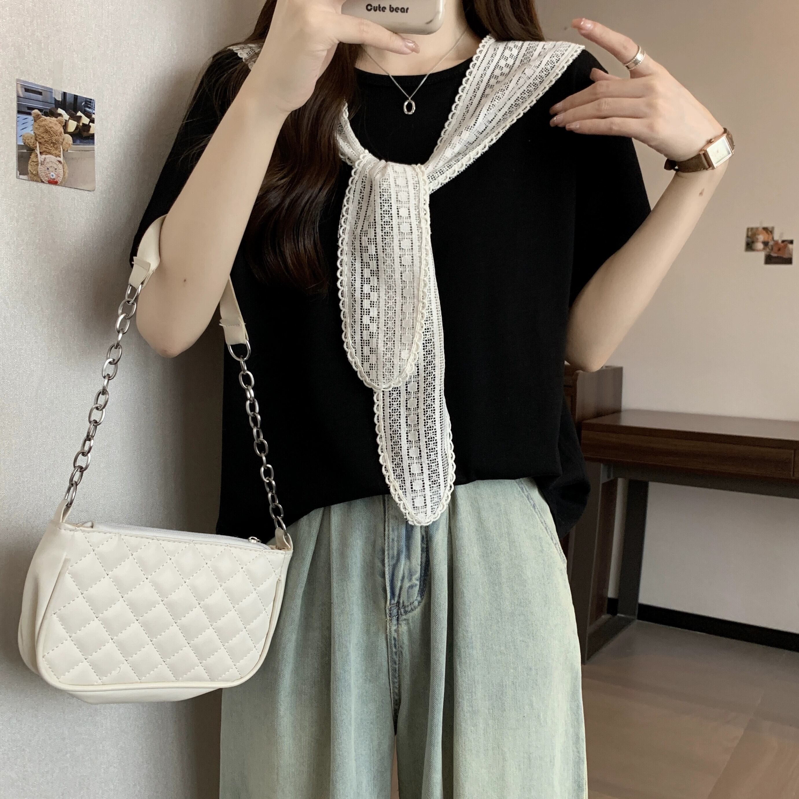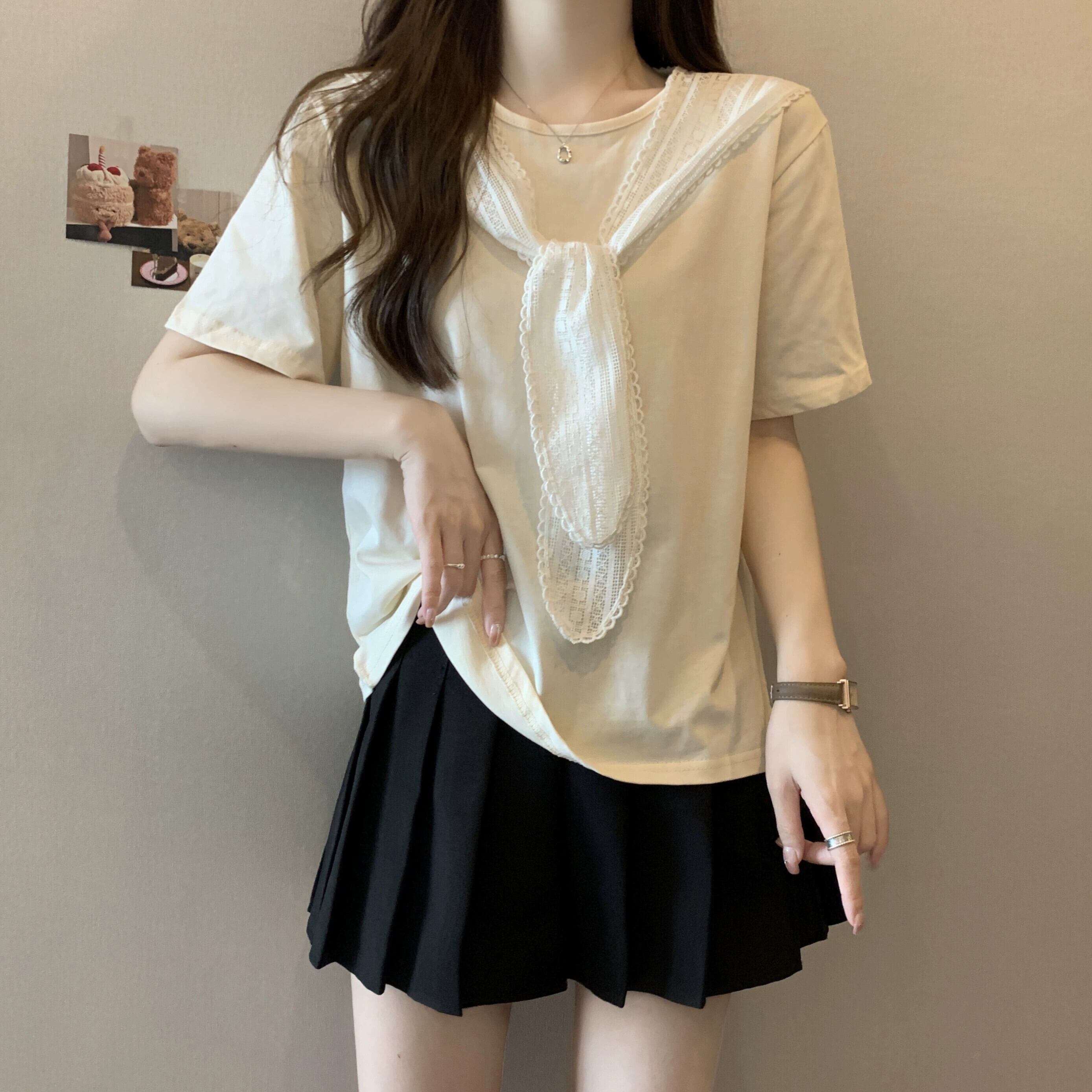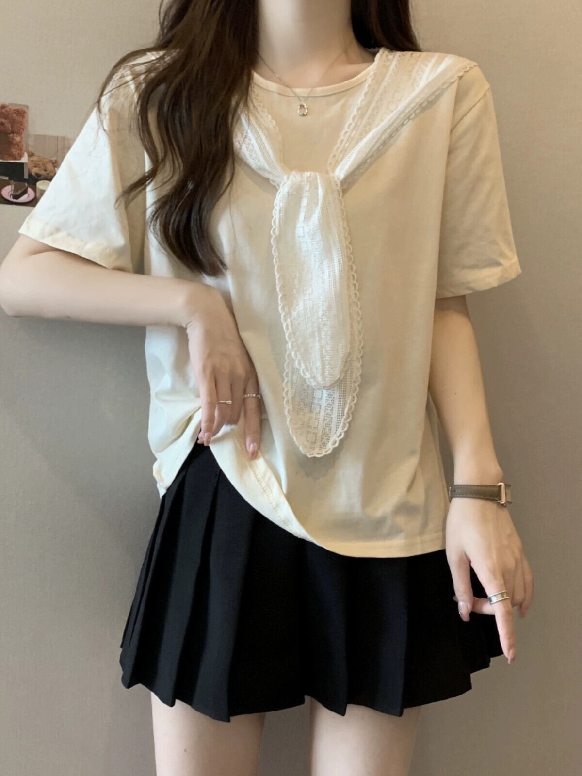 黒フロントショルダー半袖 t シャツの女性の夏のファッションデザインルーズで多用途なフェイクツーピースレースショールトップ潮 ブラック サマー 夏物 Tシャツ 7460016021651903 | framboise21