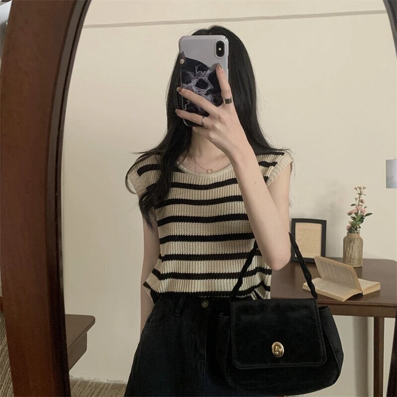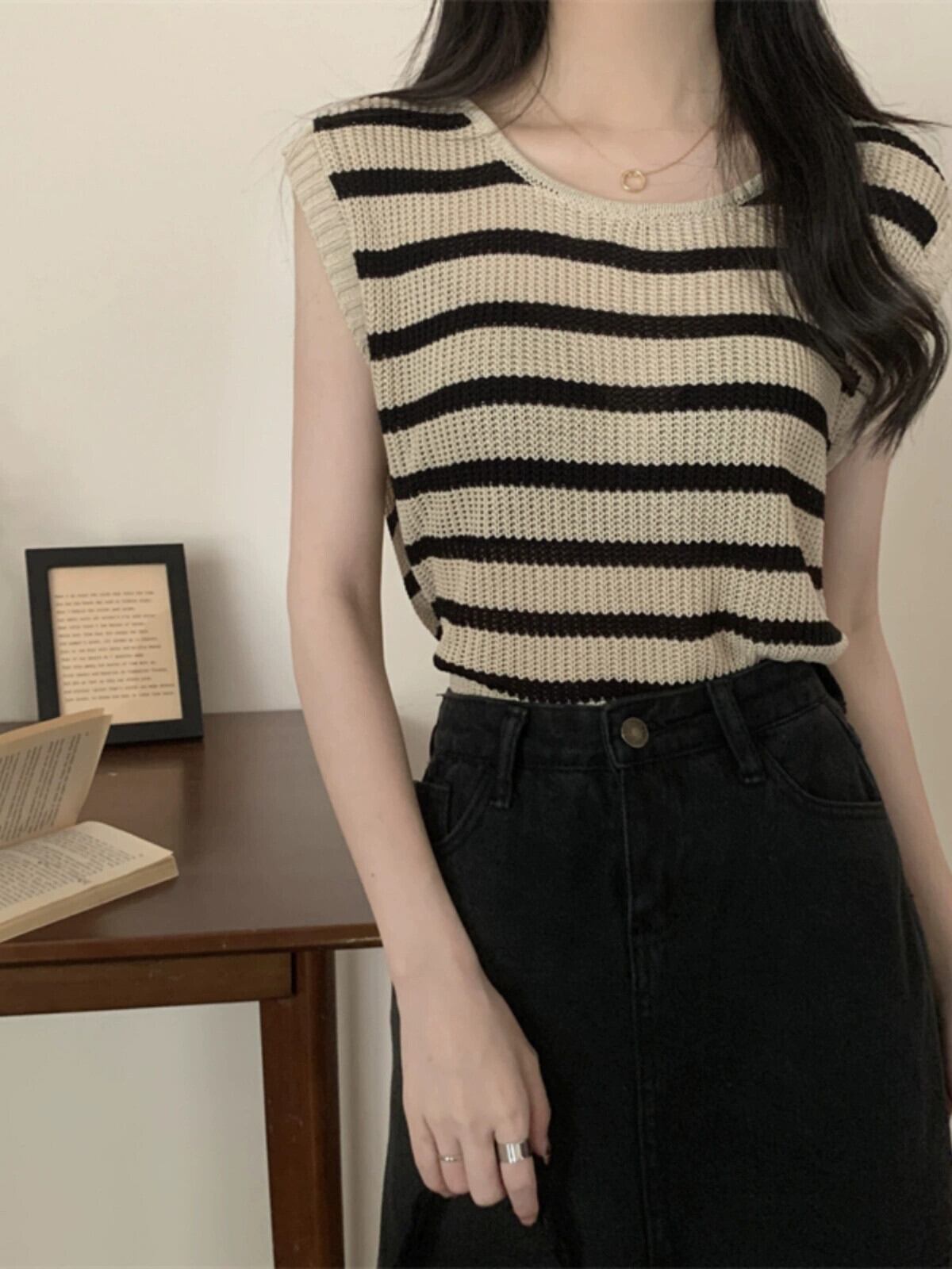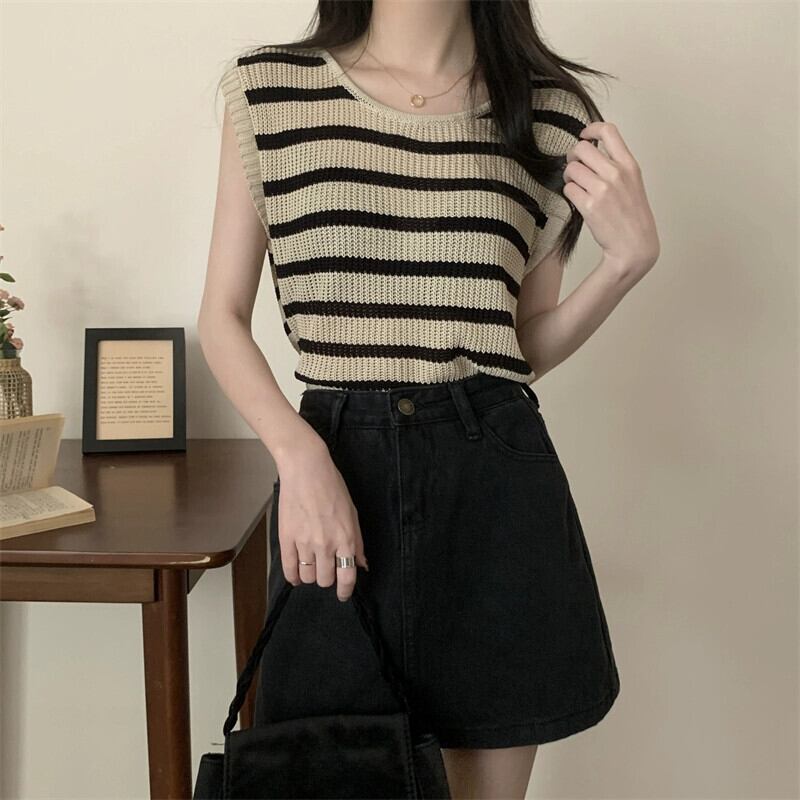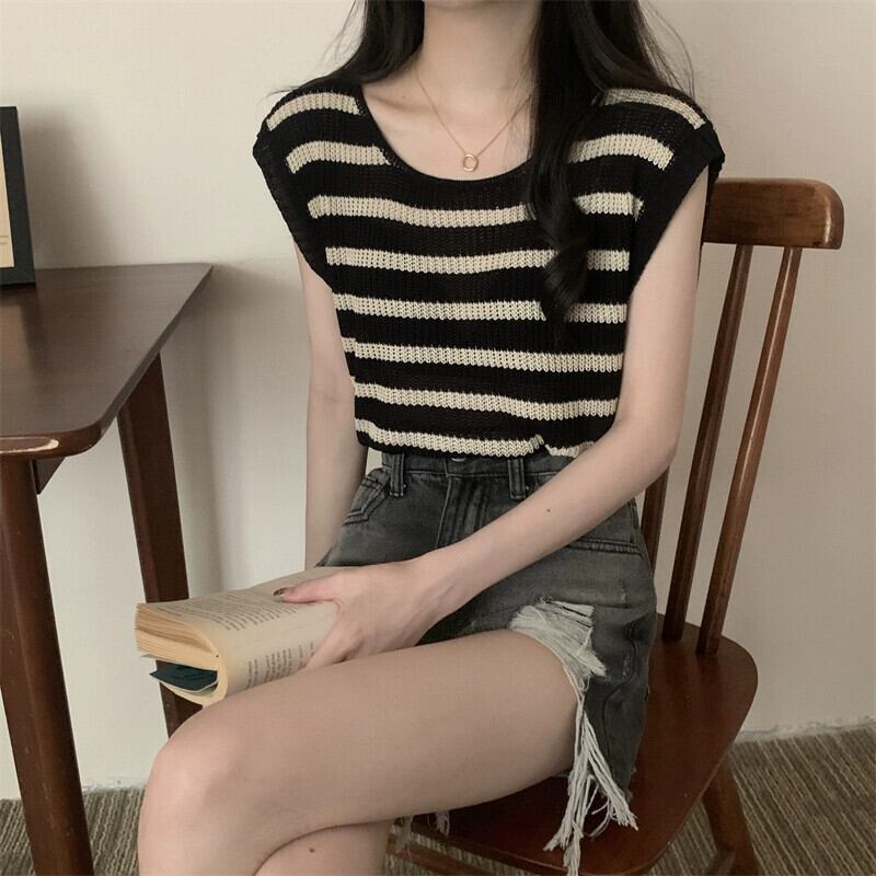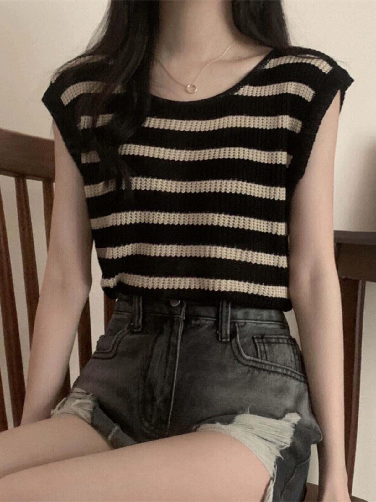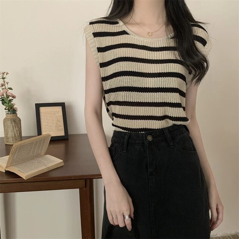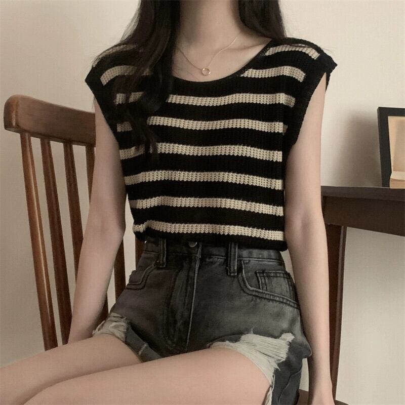 薄いストライプのアイスシルクノースリーブニットセーター女性の夏のデザインセンス緩くて薄いオールマッチショートラウンドネックベストショルダートップ サマー 夏物 Oネック 7460093191864967 | framboise21