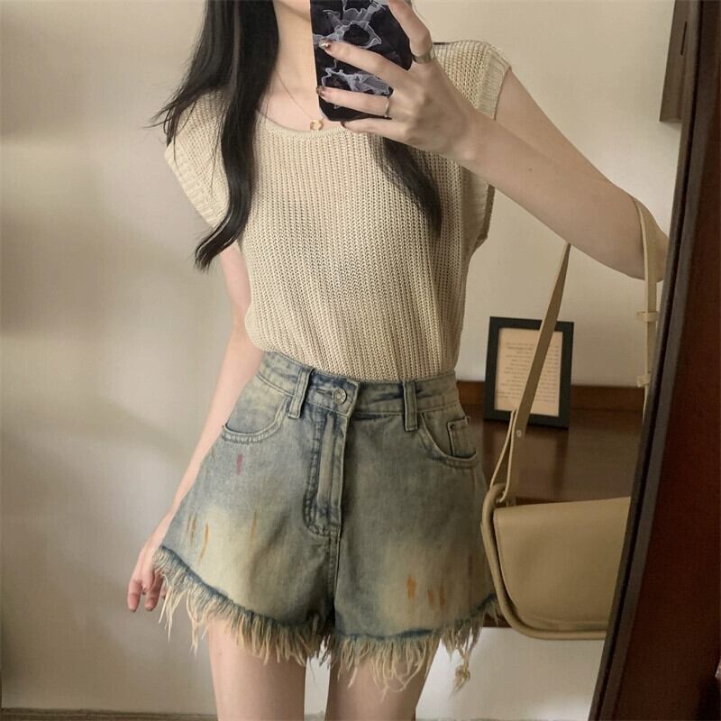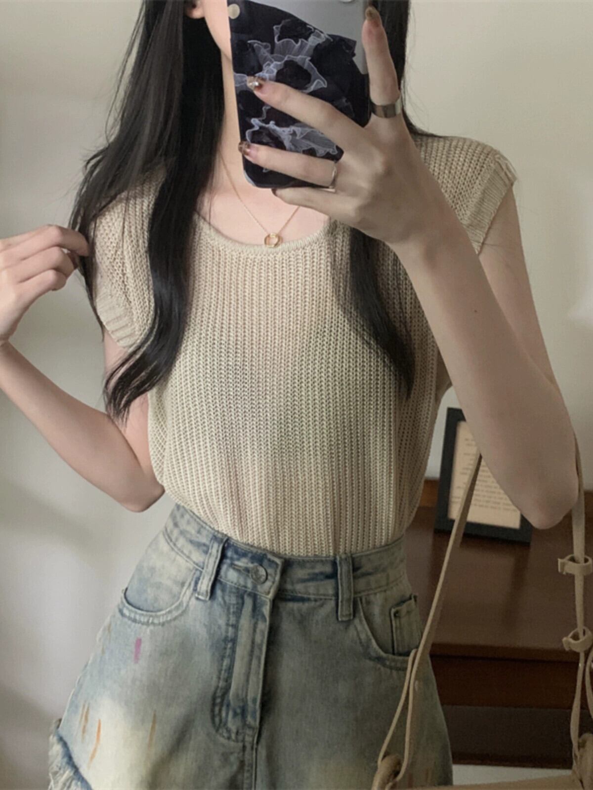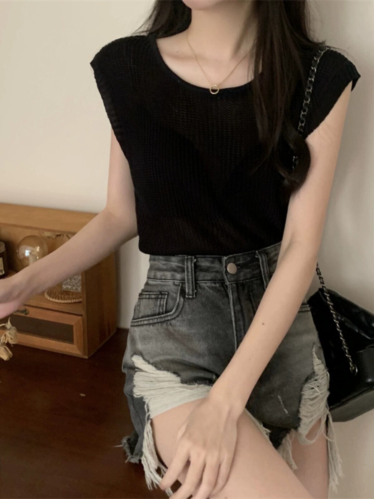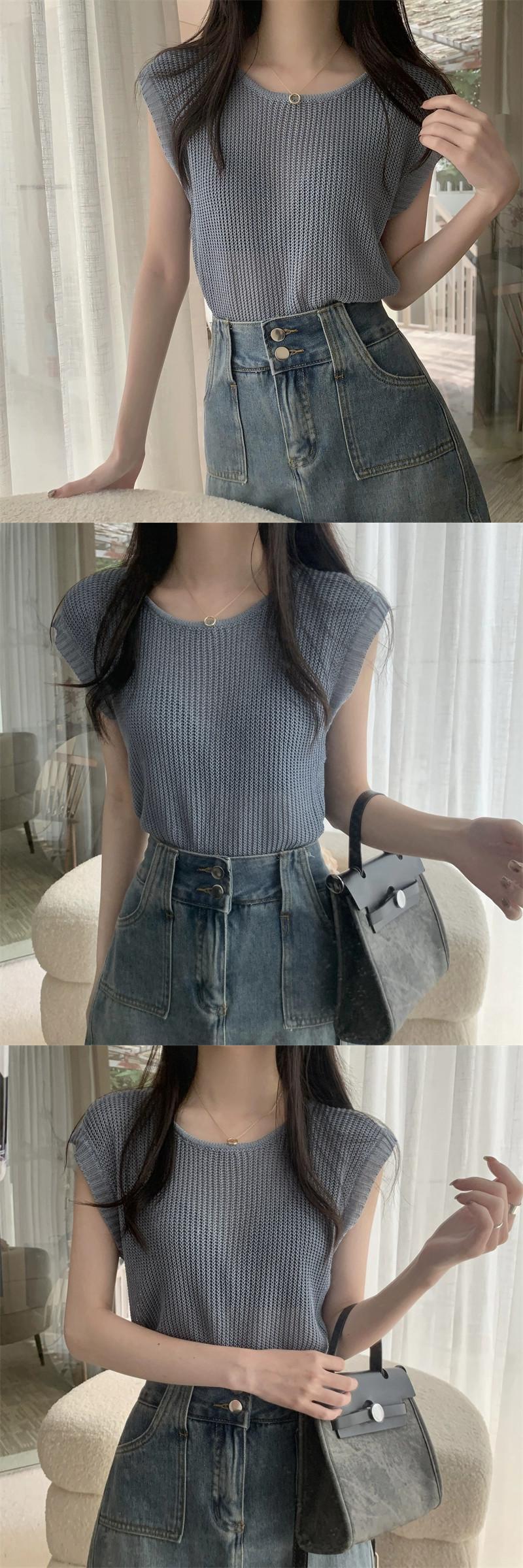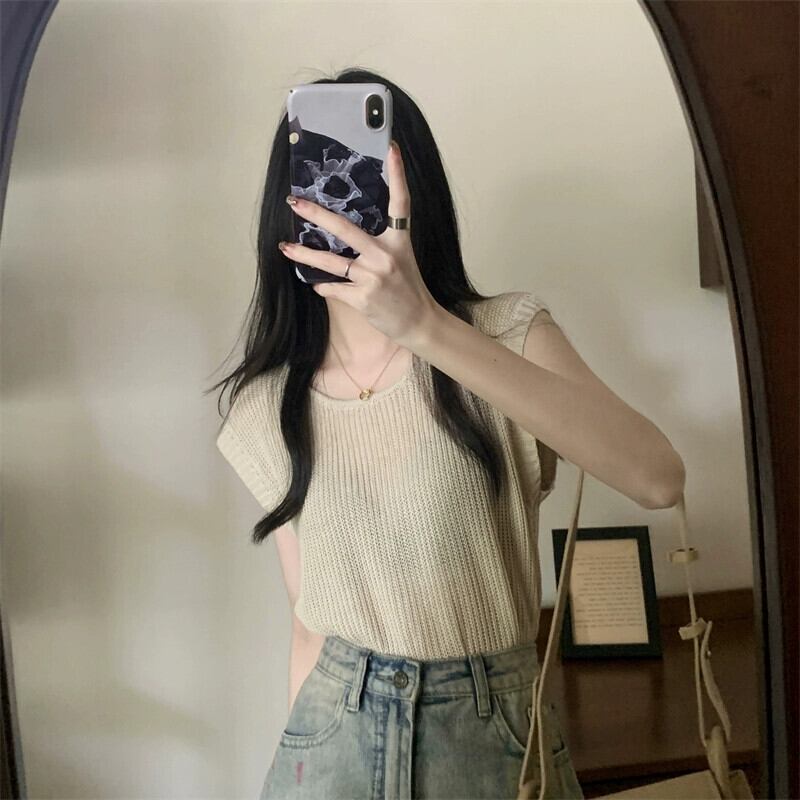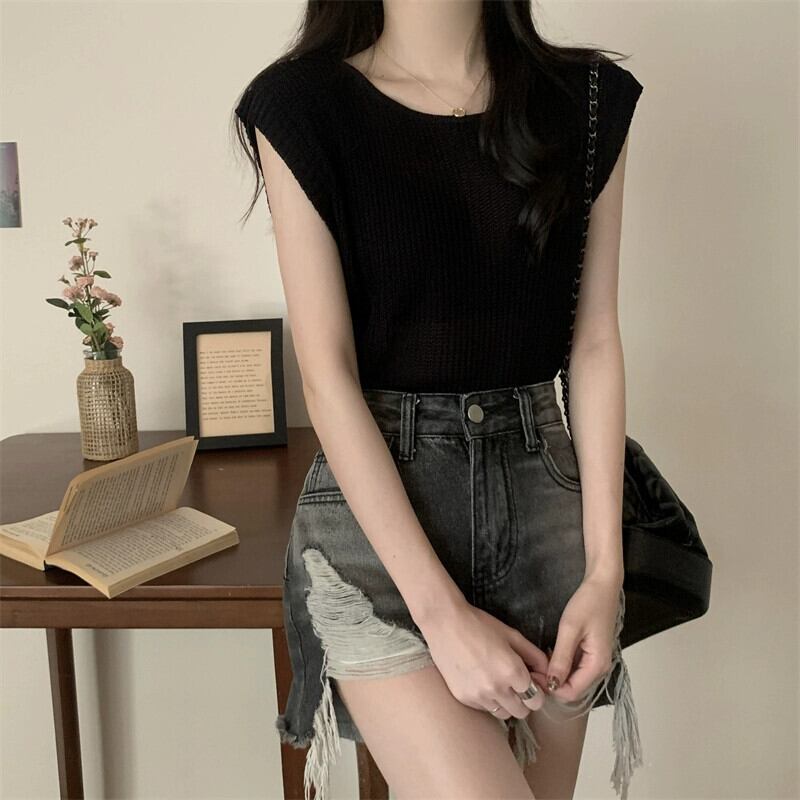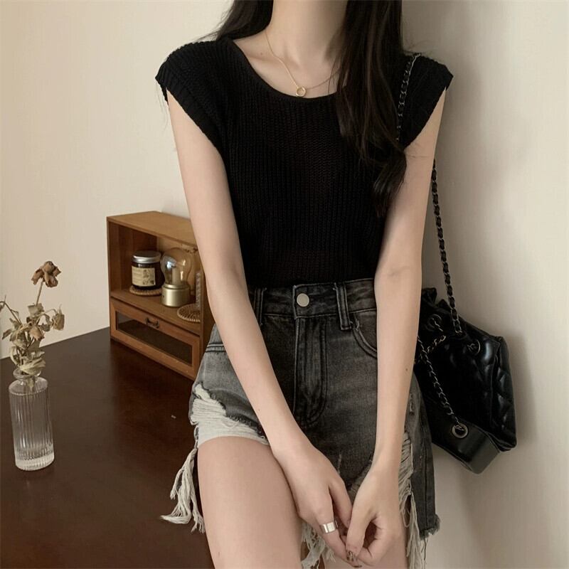 薄いストライプのアイスシルクノースリーブニットセーター女性の夏のデザインセンス緩くて薄いオールマッチショートラウンドネックベストショルダートップ サマー 夏物 Oネック 7460093191864967 | framboise21