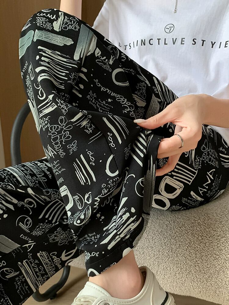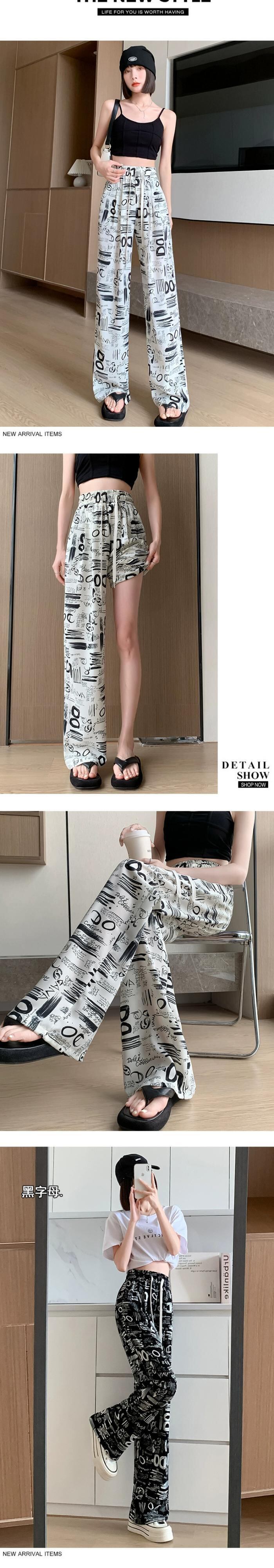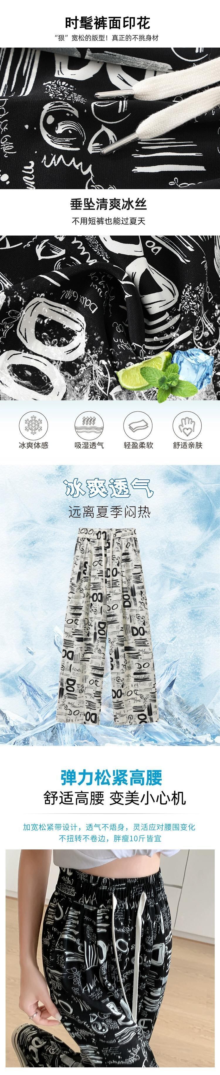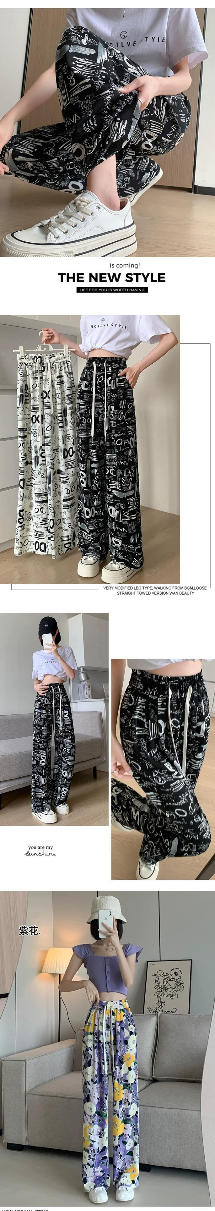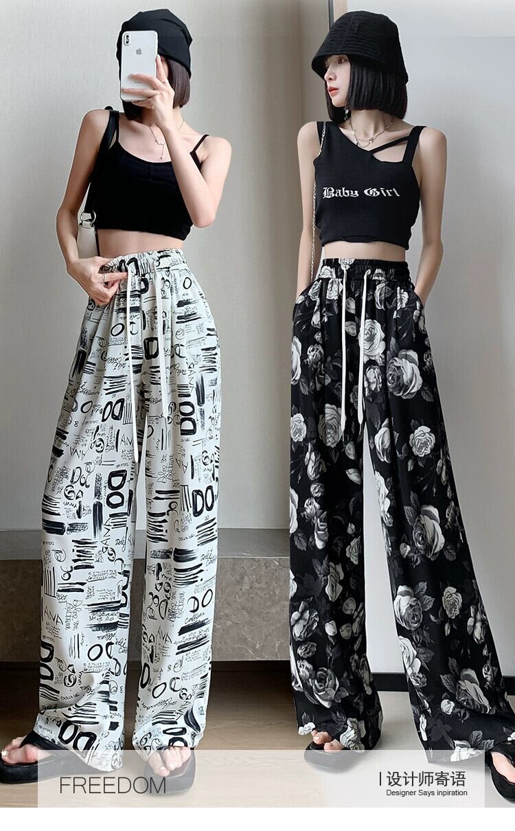 レタープリントアイスシルクワイドレッグパンツ女性の夏の薄いドレープパンツルーズスリムハイウエストモップカジュアルパンツ ハイウェスト サマー 夏物 7460089947422576 | framboise21