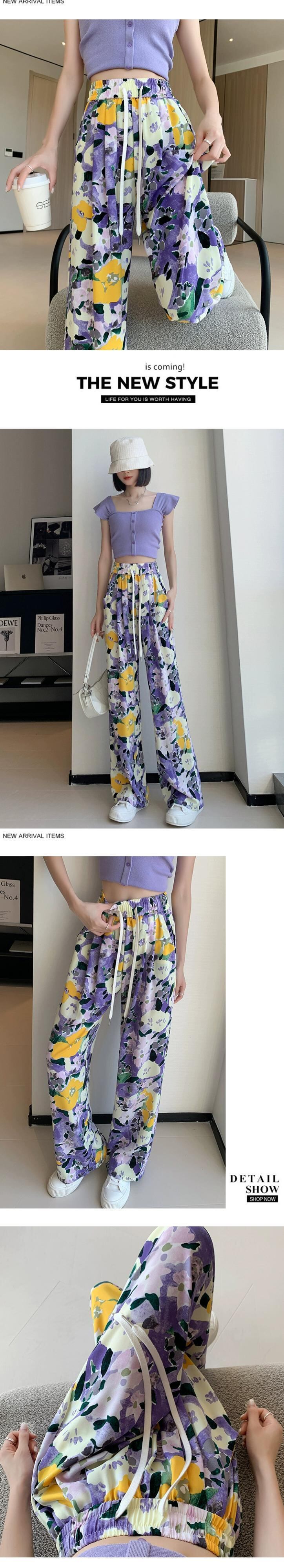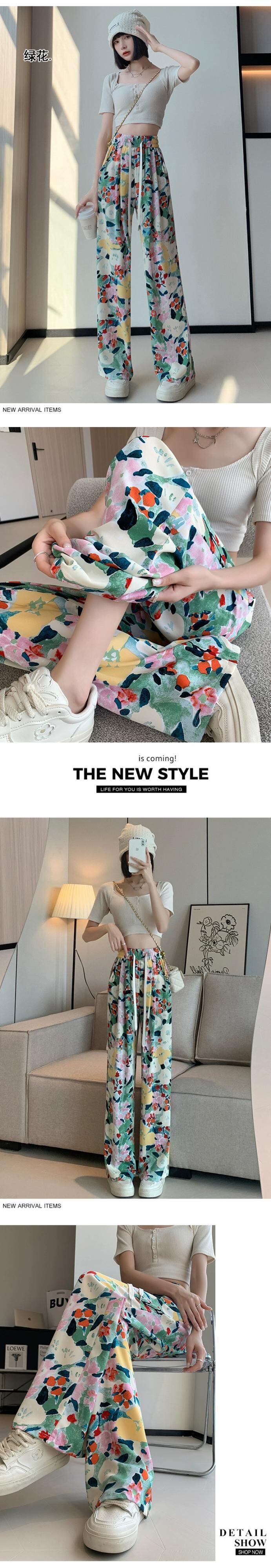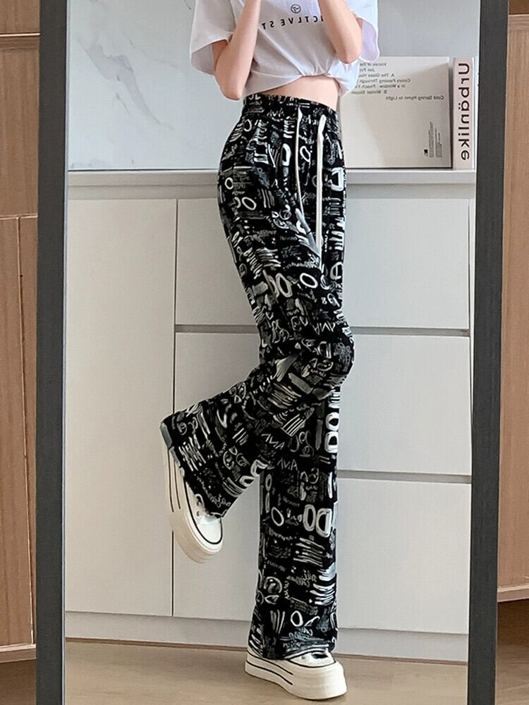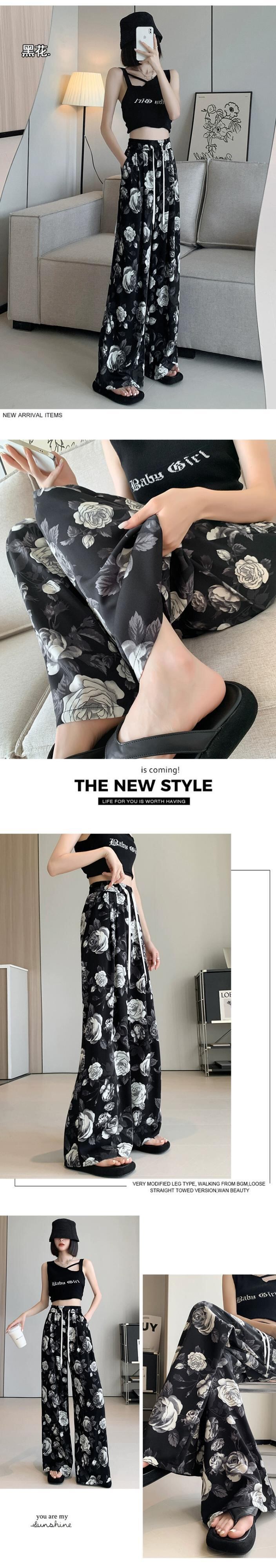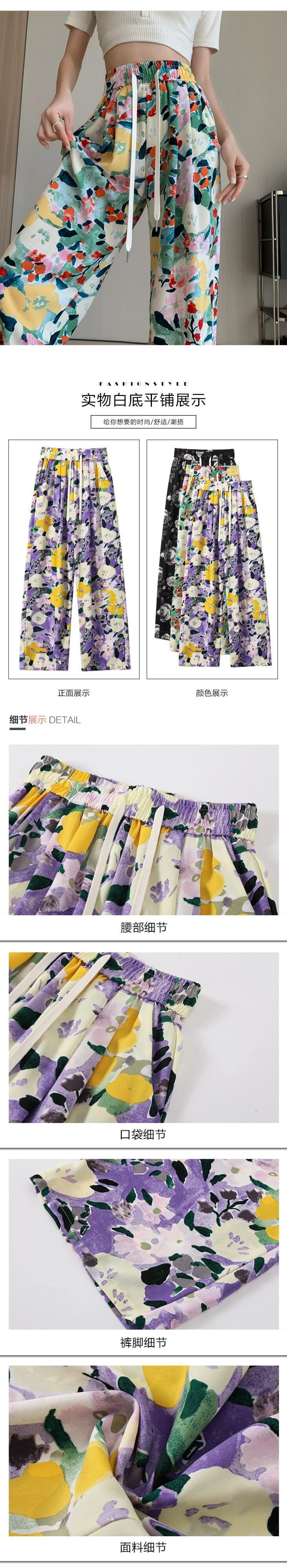 レタープリントアイスシルクワイドレッグパンツ女性の夏の薄いドレープパンツルーズスリムハイウエストモップカジュアルパンツ ハイウェスト サマー 夏物 7460089947422576 | framboise21