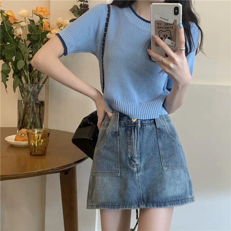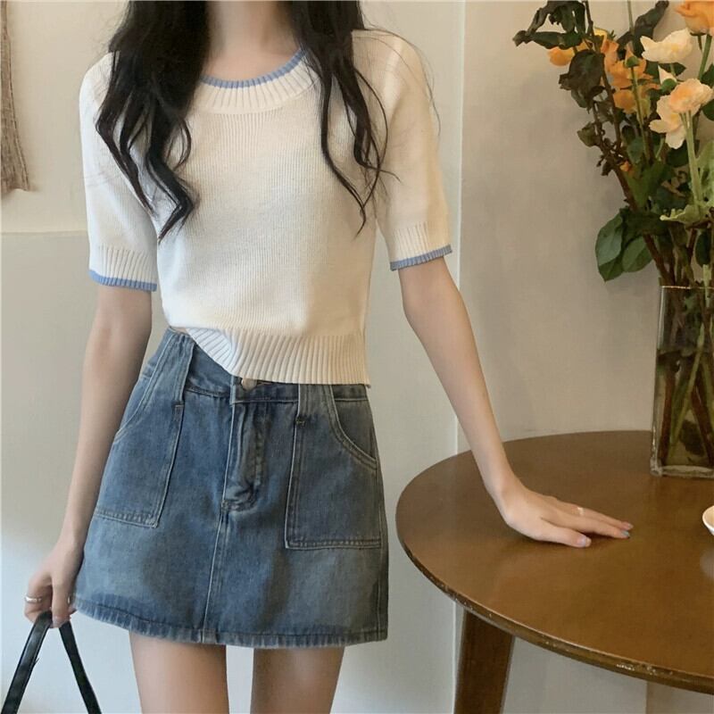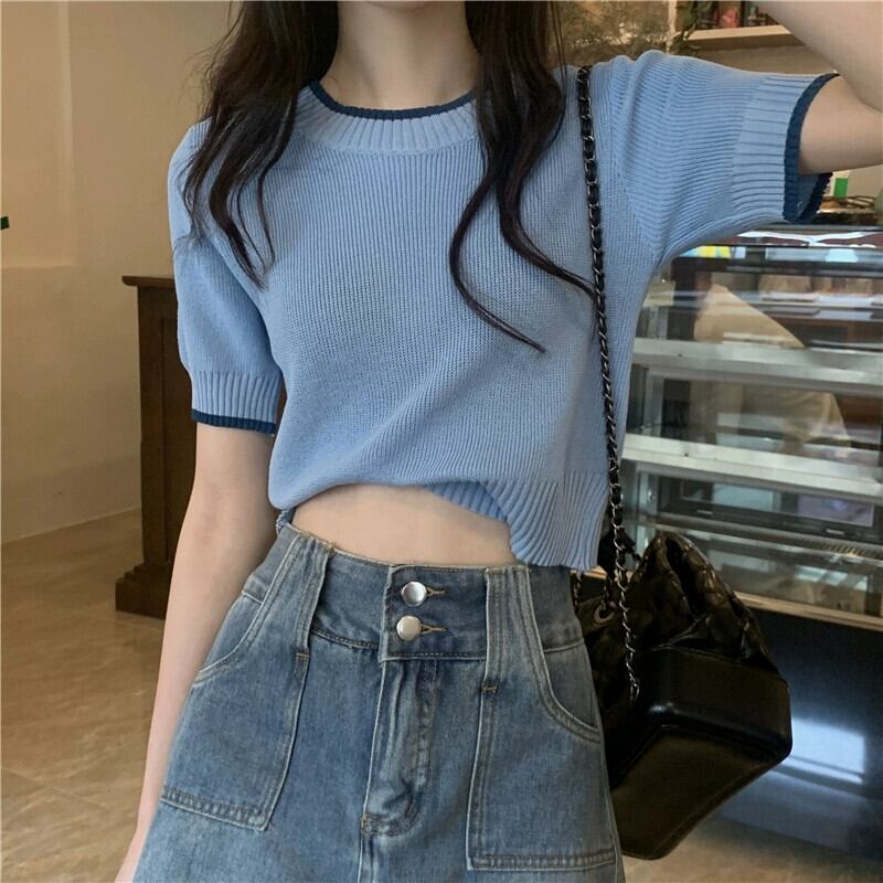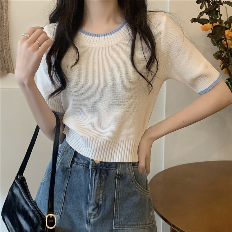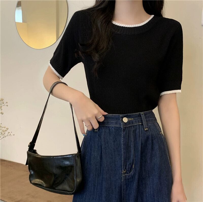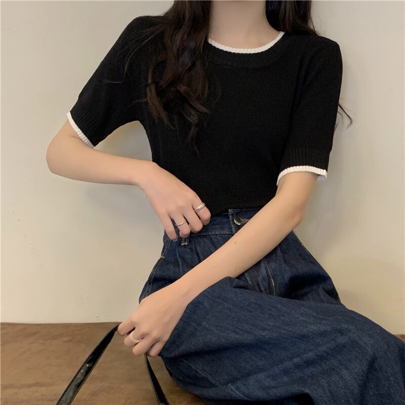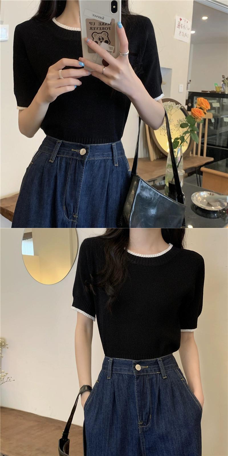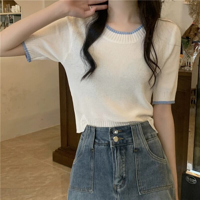 薄氷シルクニット半袖Tシャツレディース2023年夏新デザイン自己修養感覚ショートセクションコントラストカラーラウンドネックトップ サマー 夏物 Oネック 746004331440616 | framboise21