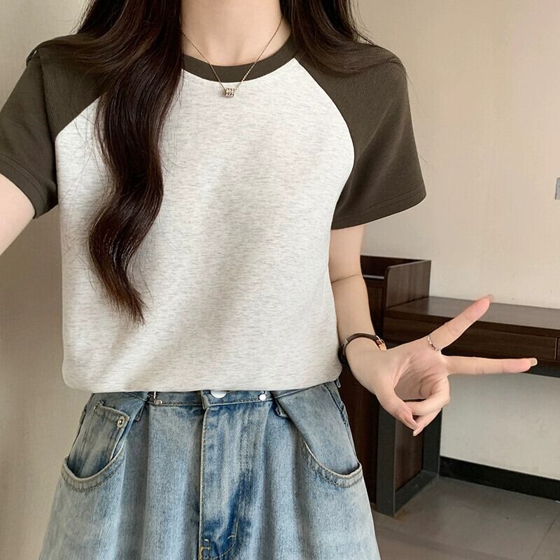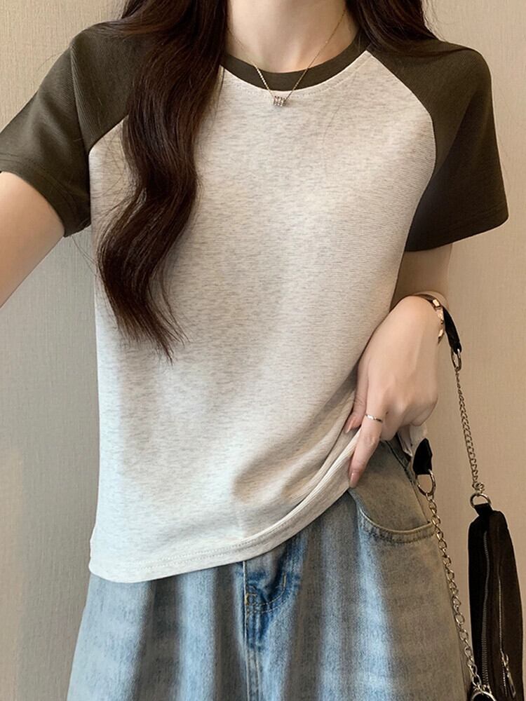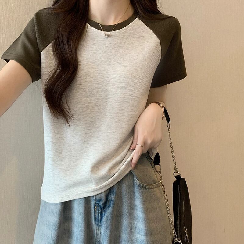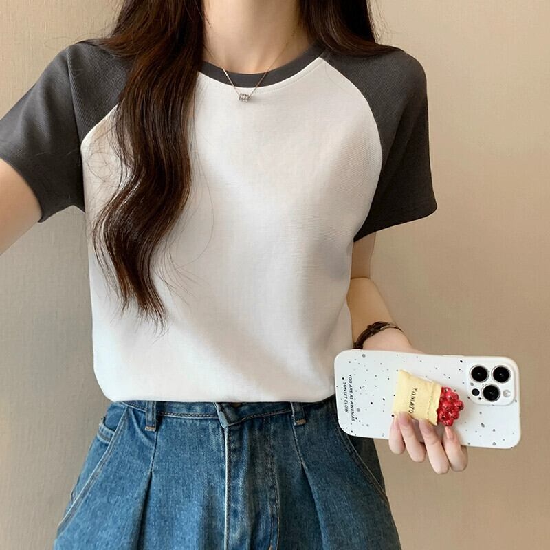 アメリカンスタイルのコントラストカラーのラグランショルダー半袖Tシャツレディース2023年夏新しいレトロなデザイン感覚、ゆったりと万能なラウンドネックトップ サマー 夏物 Oネック 7460058071013929 | framboise21
