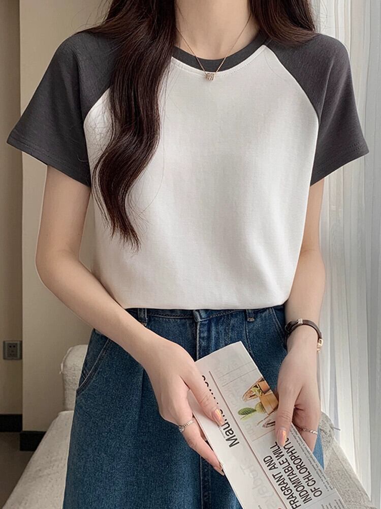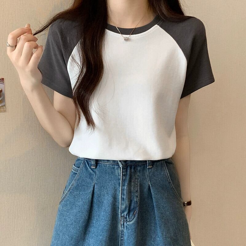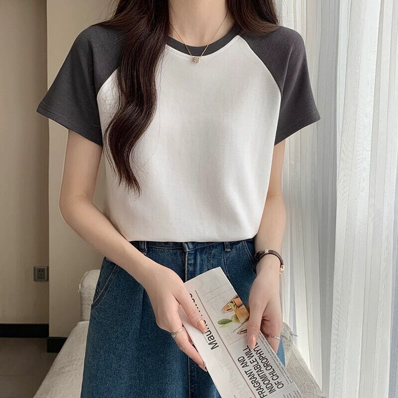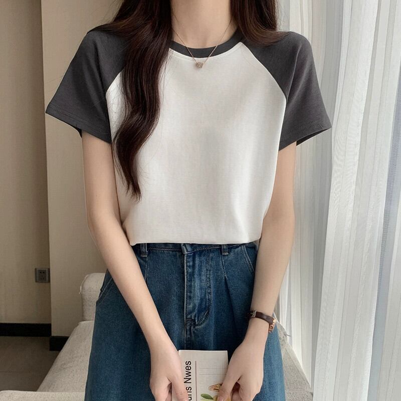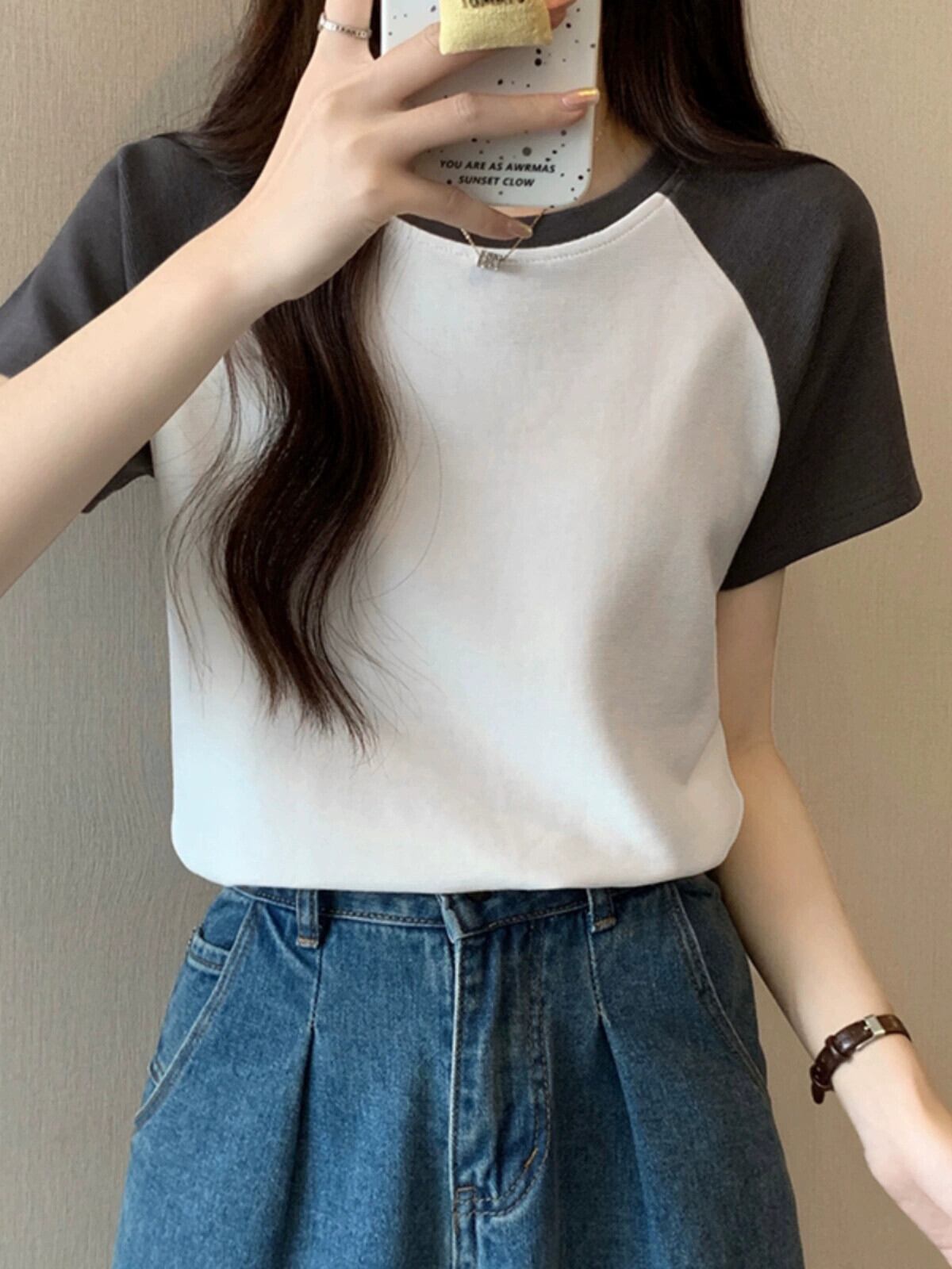 アメリカンスタイルのコントラストカラーのラグランショルダー半袖Tシャツレディース2023年夏新しいレトロなデザイン感覚、ゆったりと万能なラウンドネックトップ サマー 夏物 Oネック 7460058071013929 | framboise21