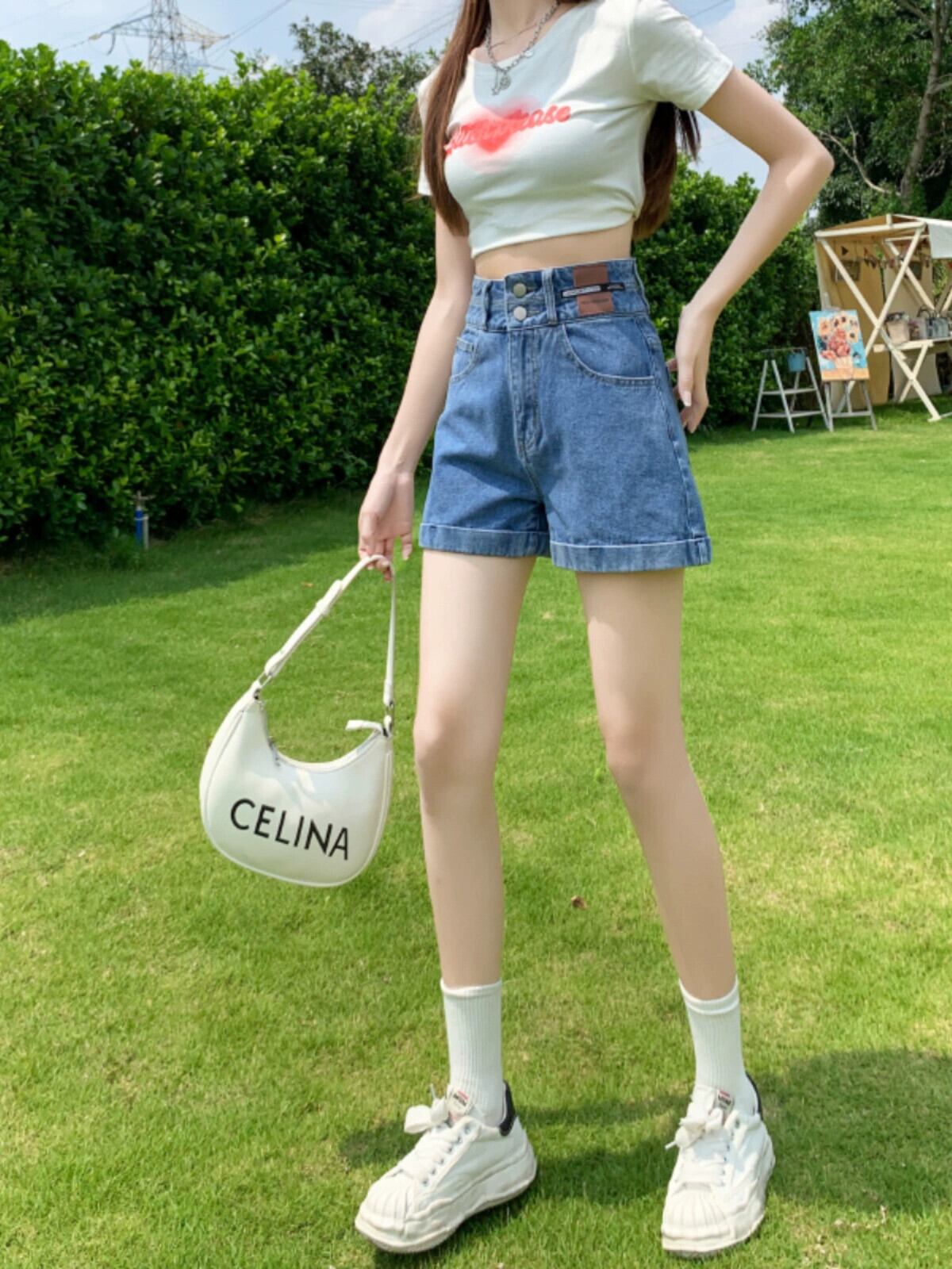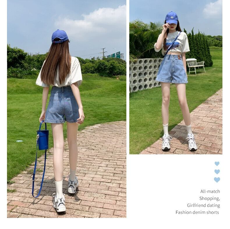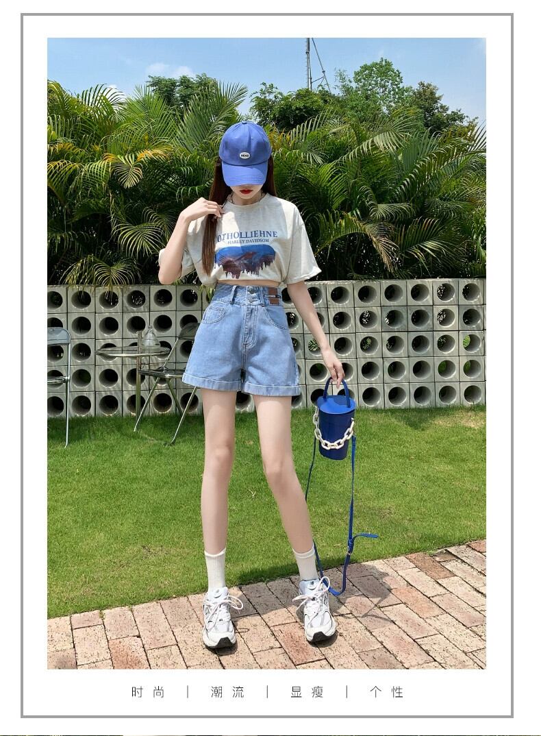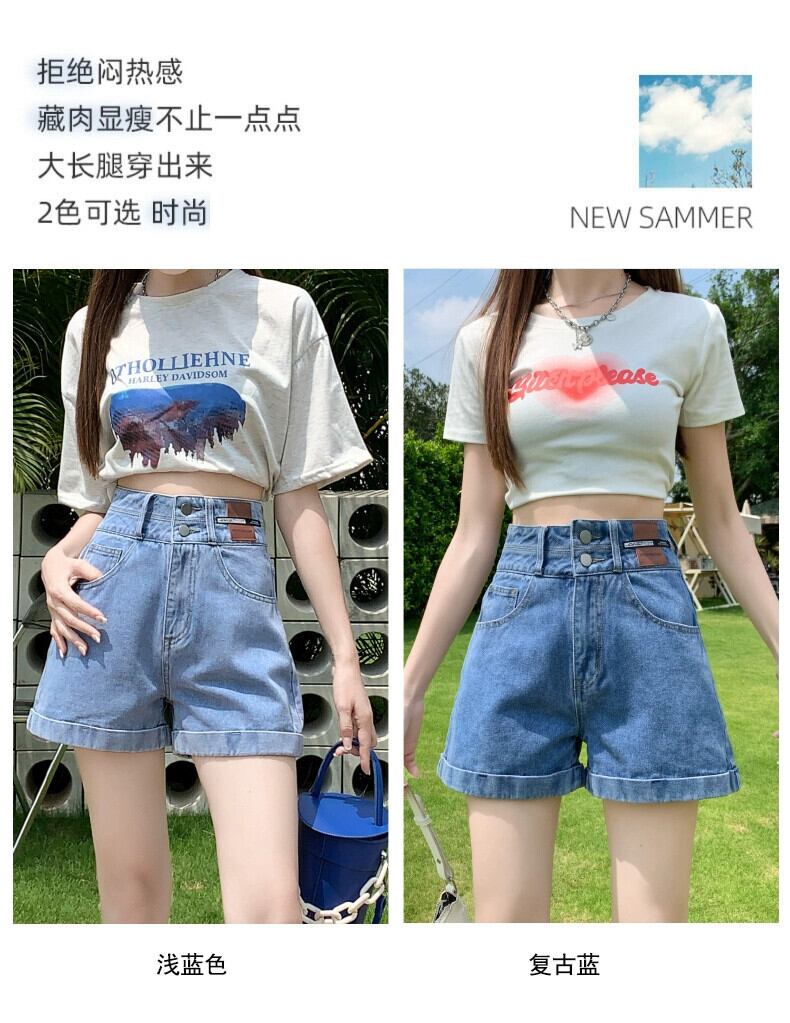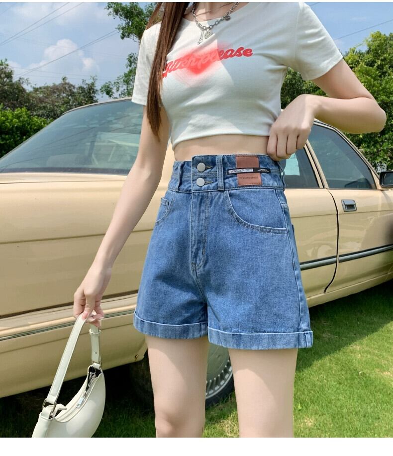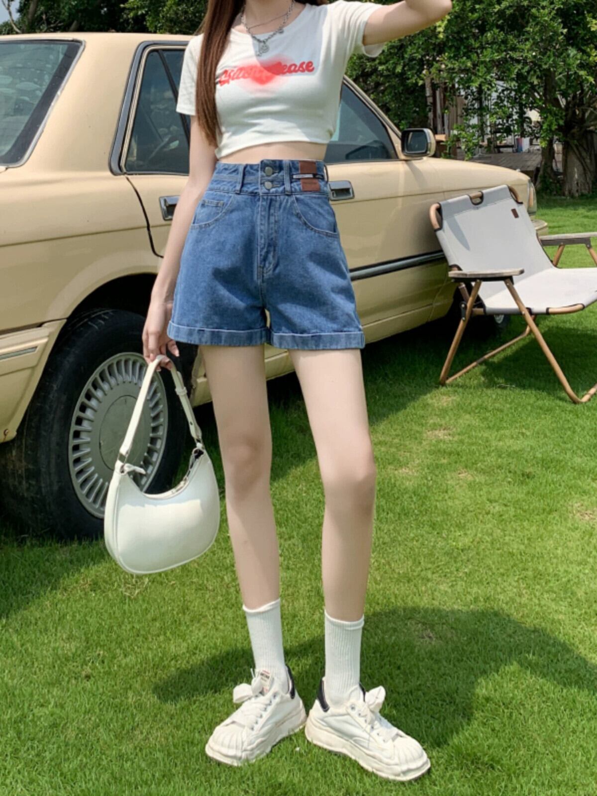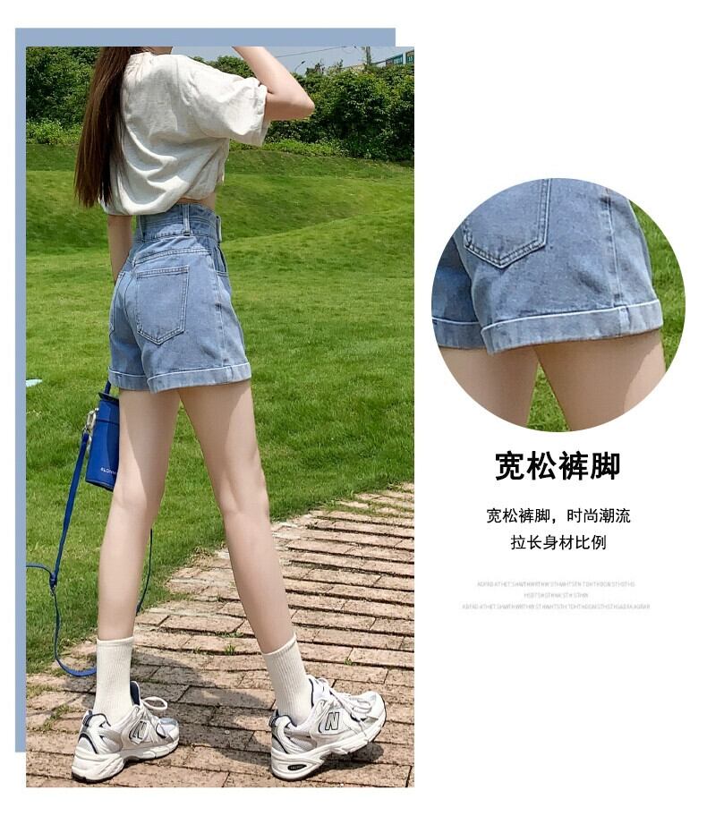 レトロブルーカーリーエッジハイウエストデニムショートパンツレディース夏ゆったり薄手ワイドレッグパンツアウターオールマッチAラインパンツ ハイウェスト サマー 夏物 ショーツ ブルマー 746001498896649 | framboise21