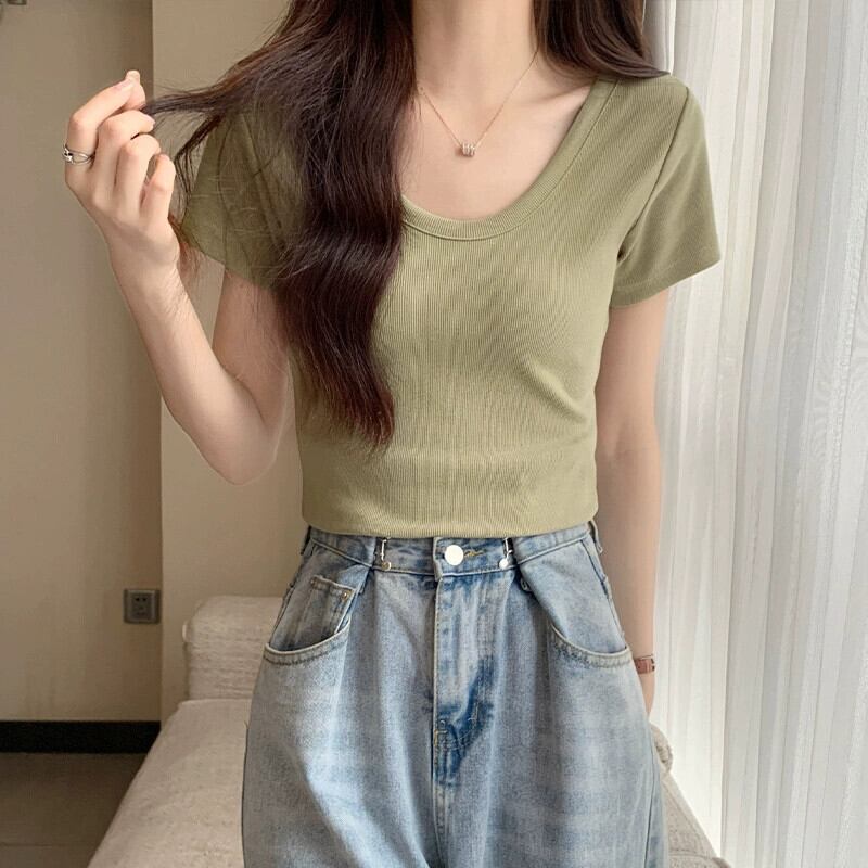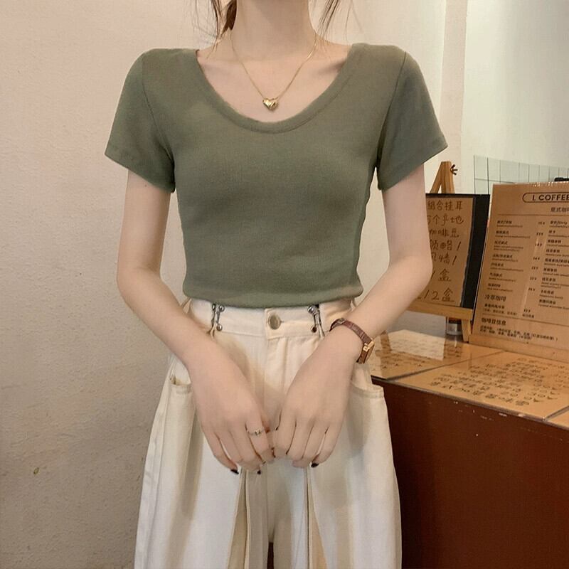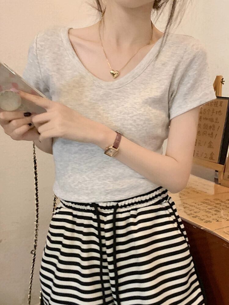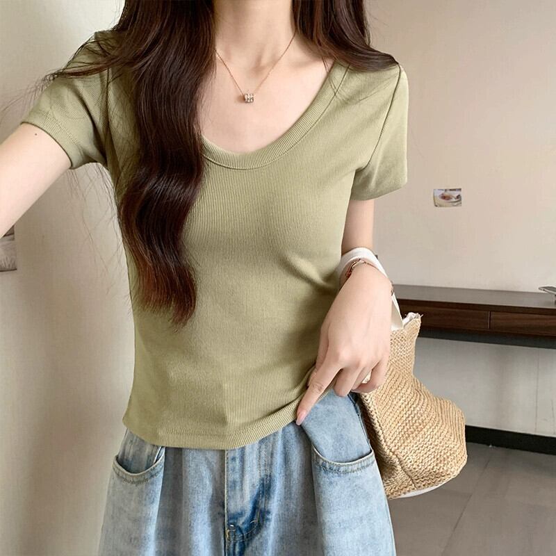 フロントショルダースレッド半袖 Tシャツ女性の夏の 2023 新しいフレンチレトロスリムスリムショート鎖骨 V ネックトップ サマー 夏物 Vネック 7460075469639416 | framboise21