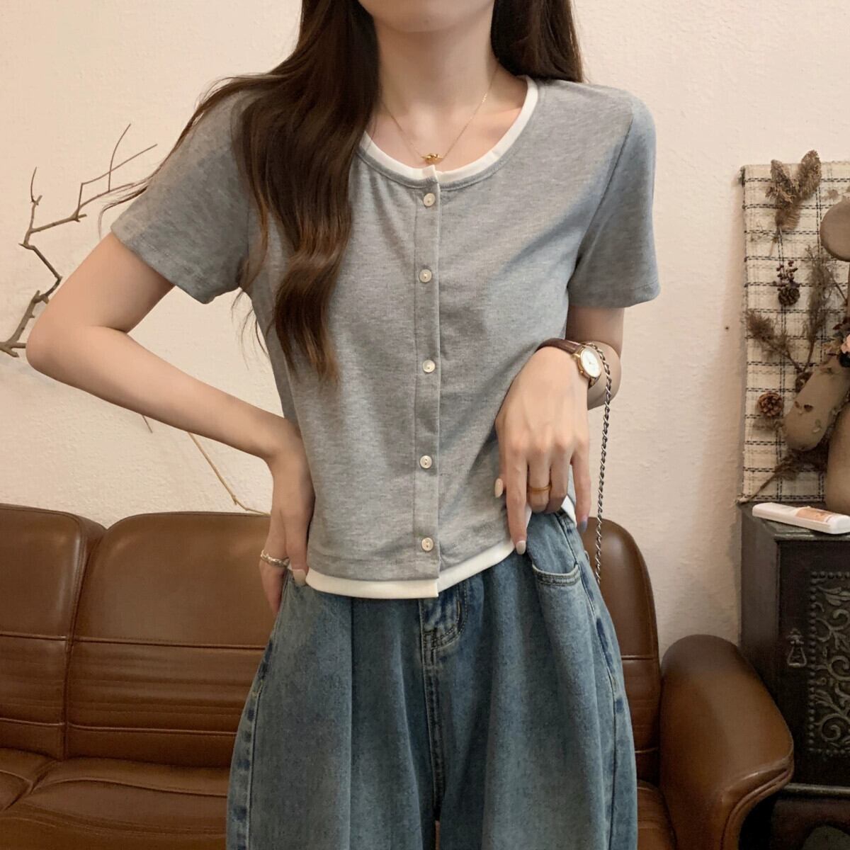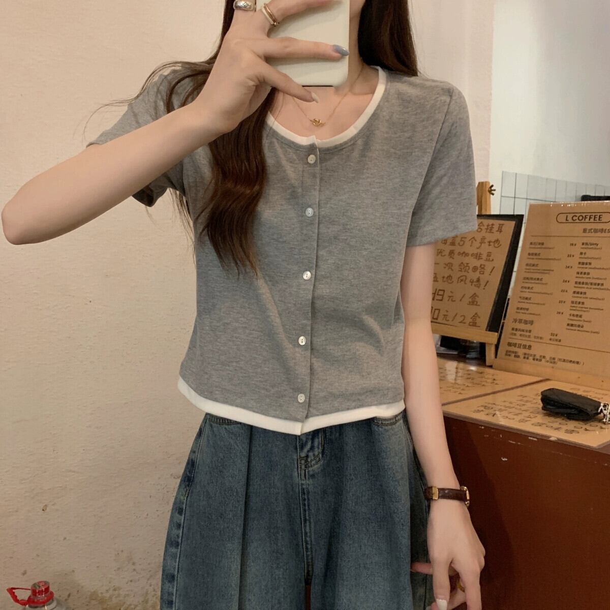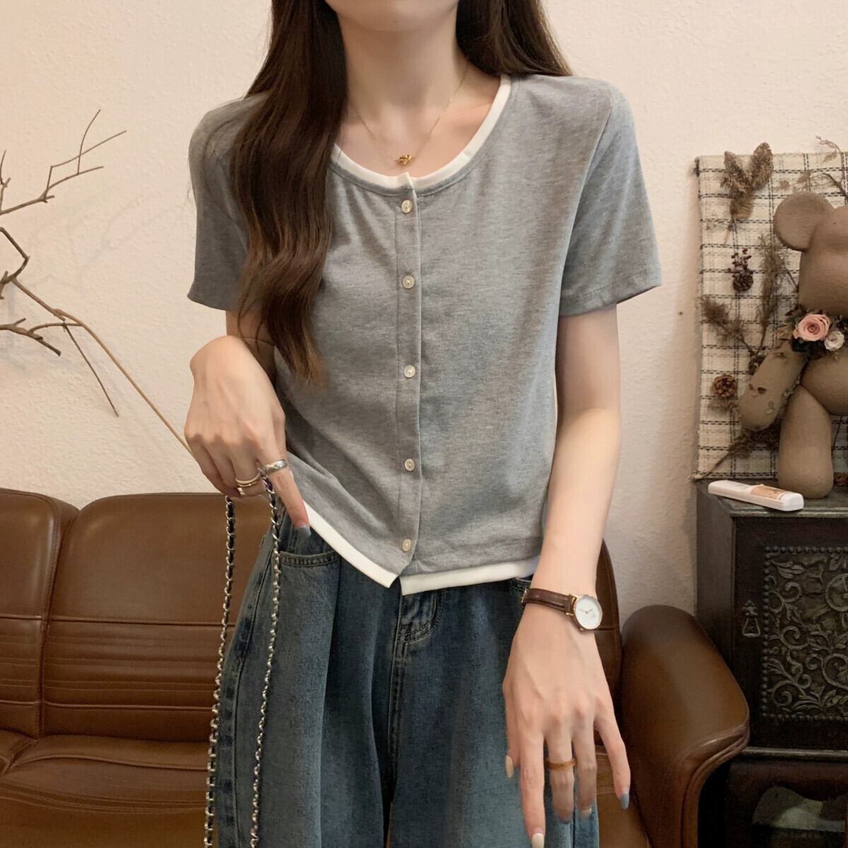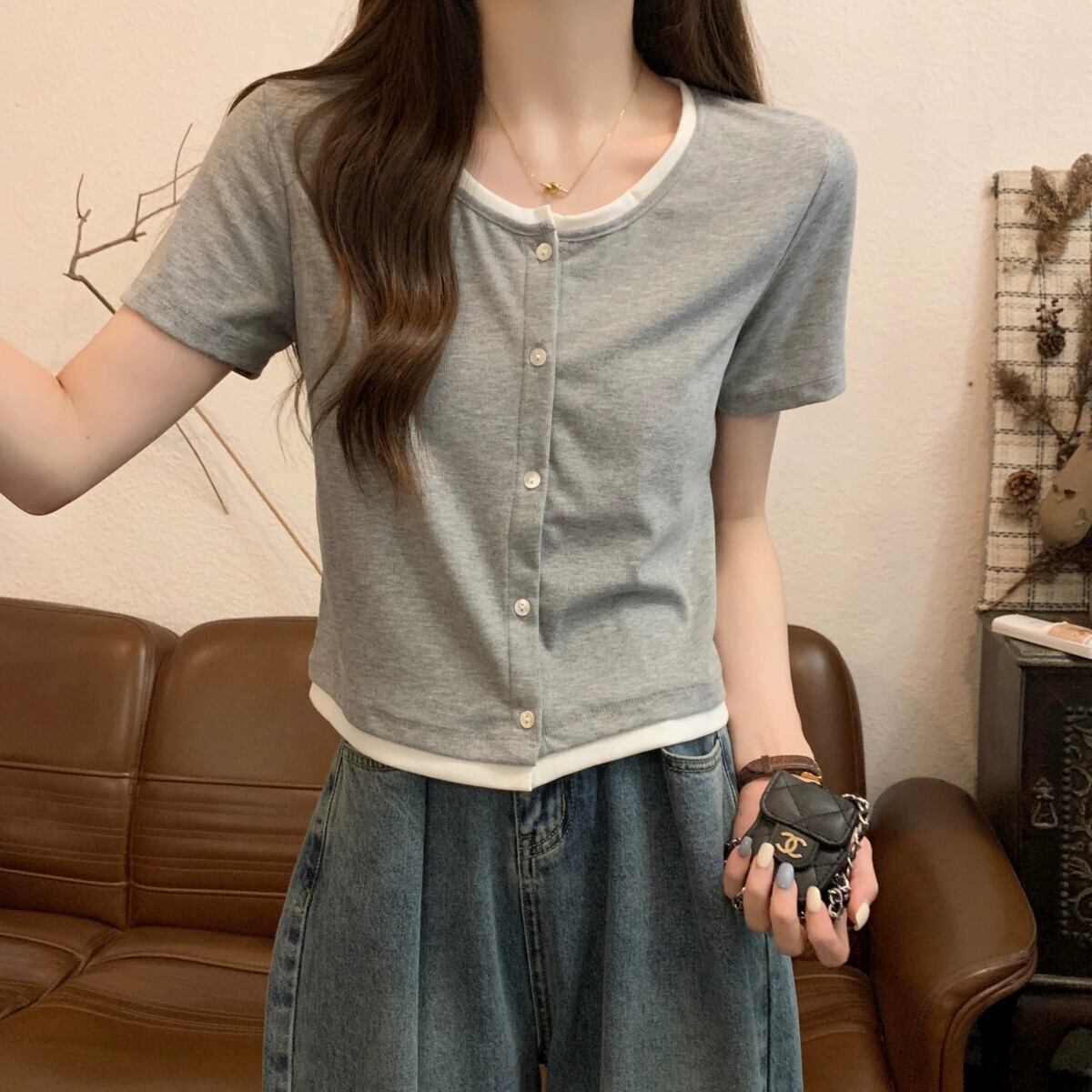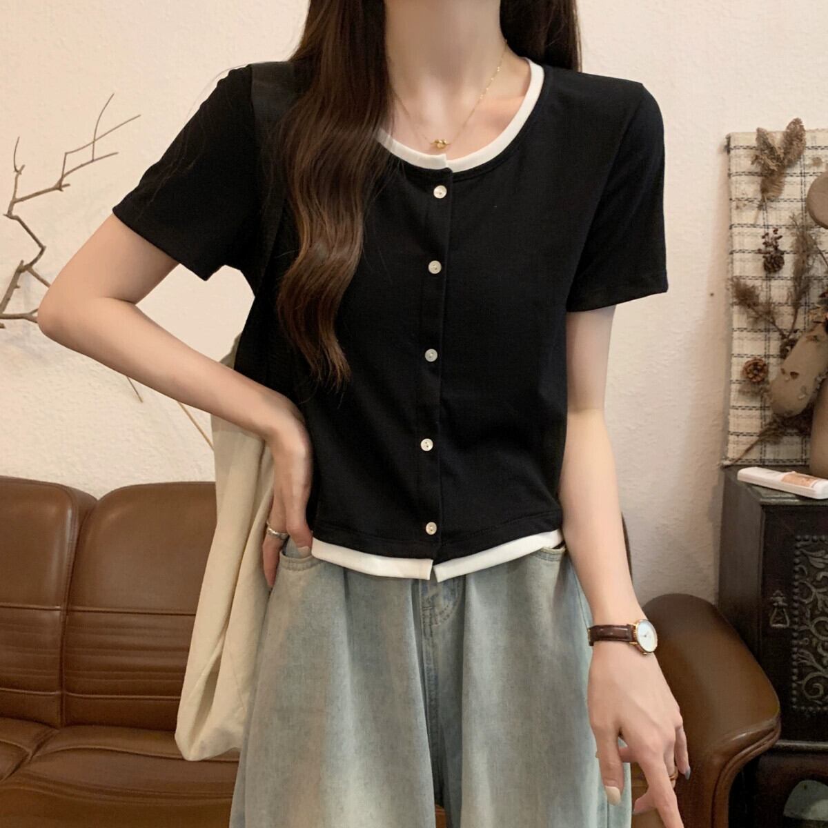 フェイク純綿半袖Tシャツ2枚レディース夏のファッションシックなデザイン肩感薄い短いセクションコントラストカラーラウンドネックトップ ショート コットン サマー 夏物 Oネック ピュア 7460045204318812 | framboise21