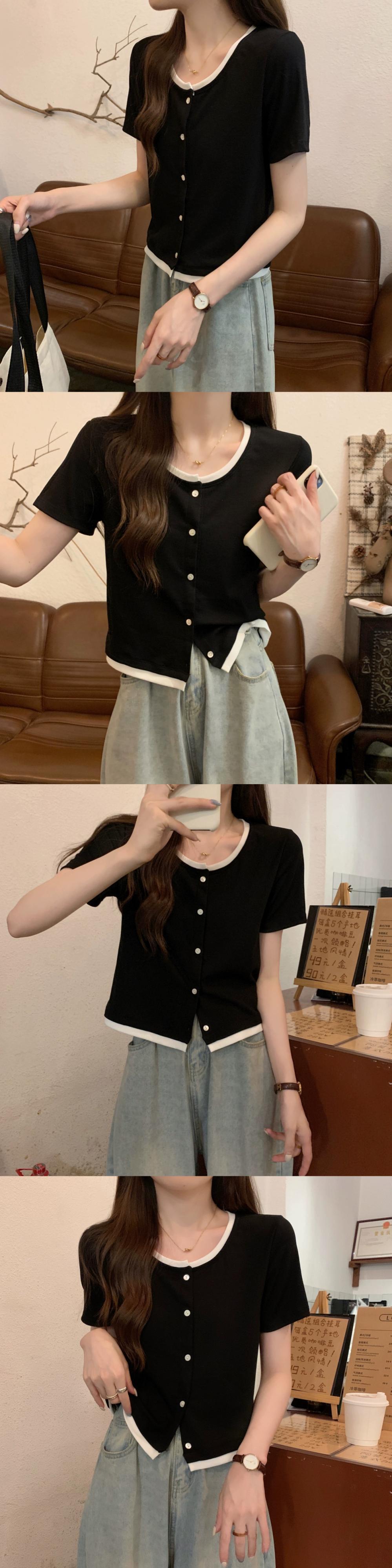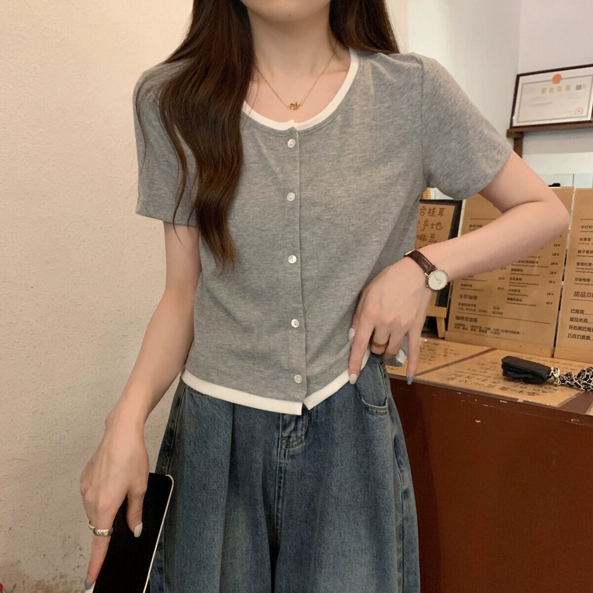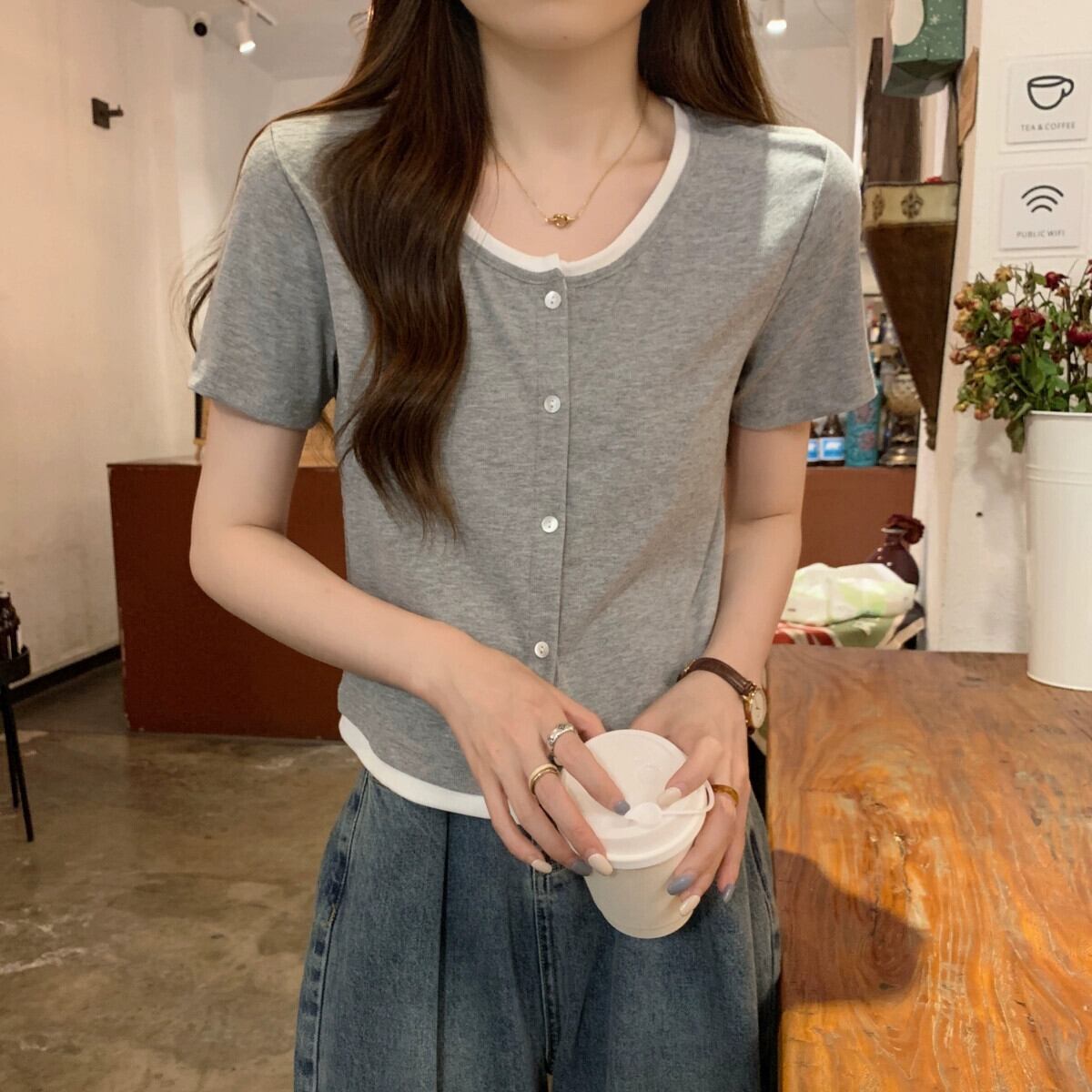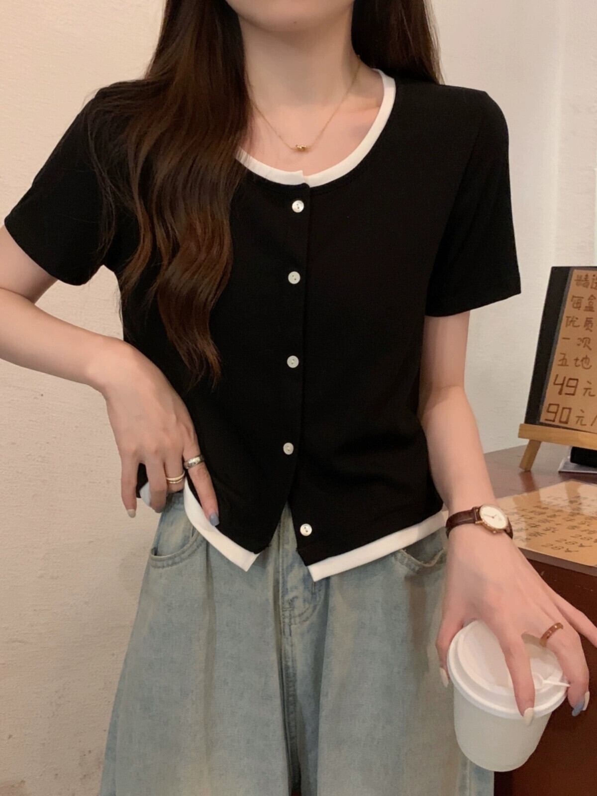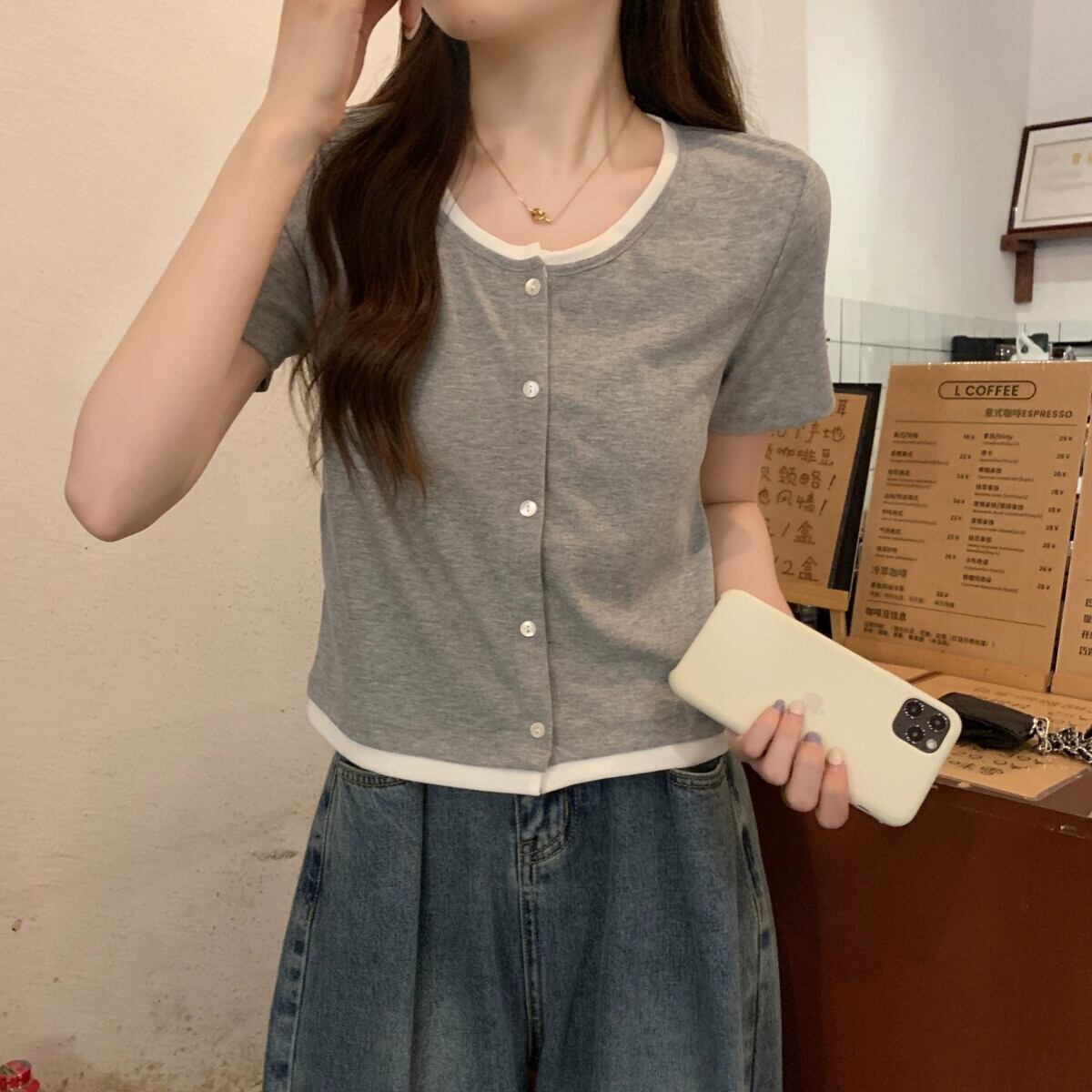 フェイク純綿半袖Tシャツ2枚レディース夏のファッションシックなデザイン肩感薄い短いセクションコントラストカラーラウンドネックトップ ショート コットン サマー 夏物 Oネック ピュア 7460045204318812 | framboise21