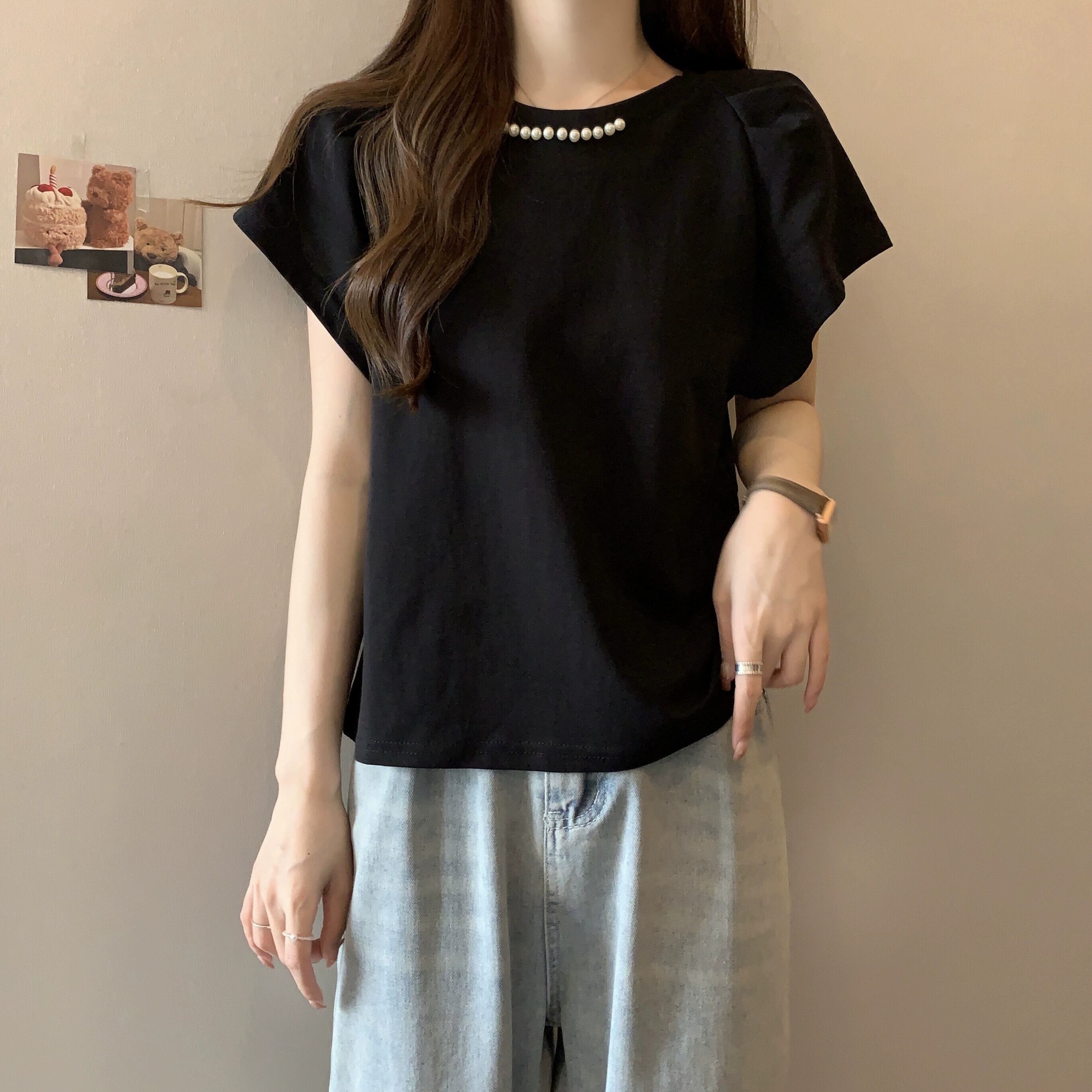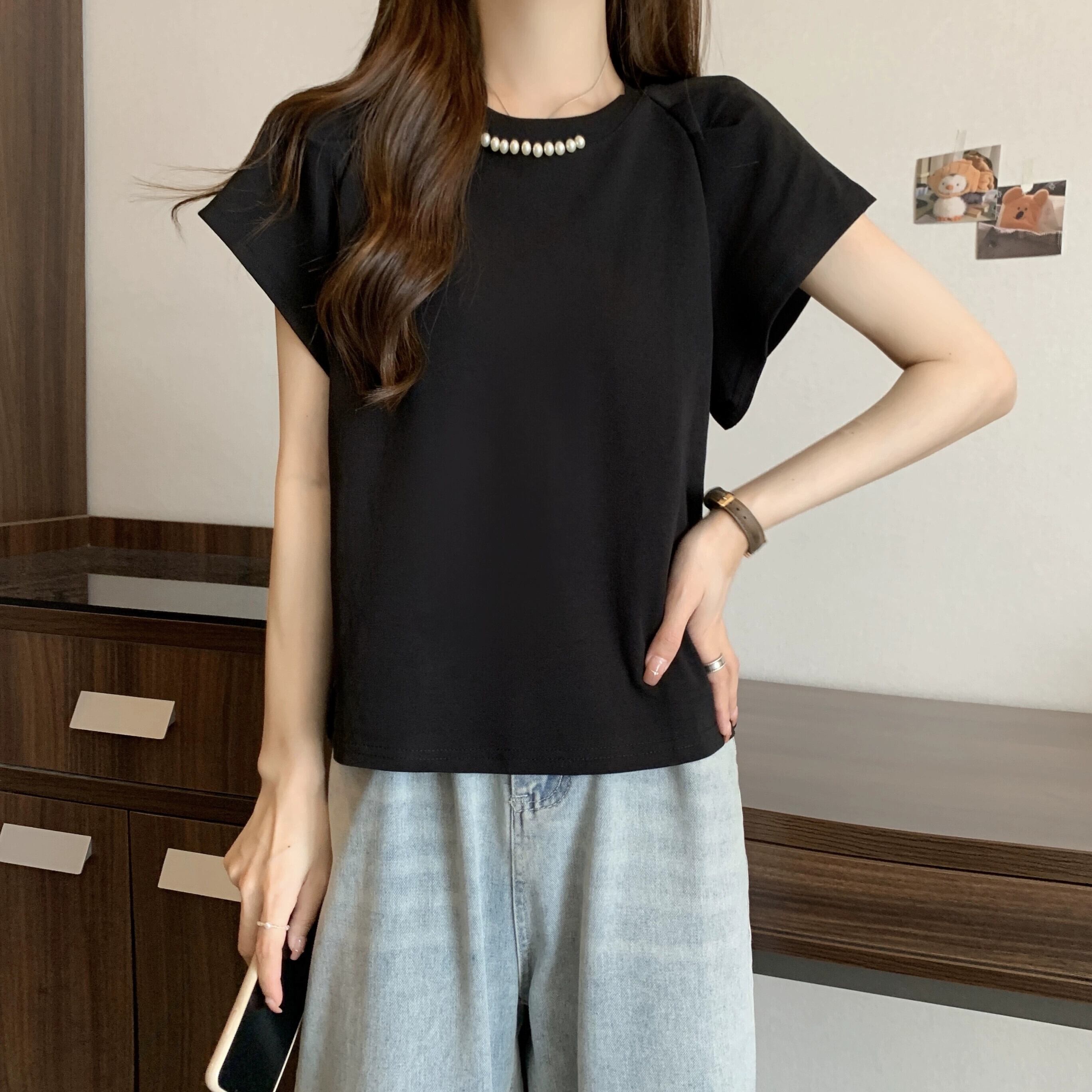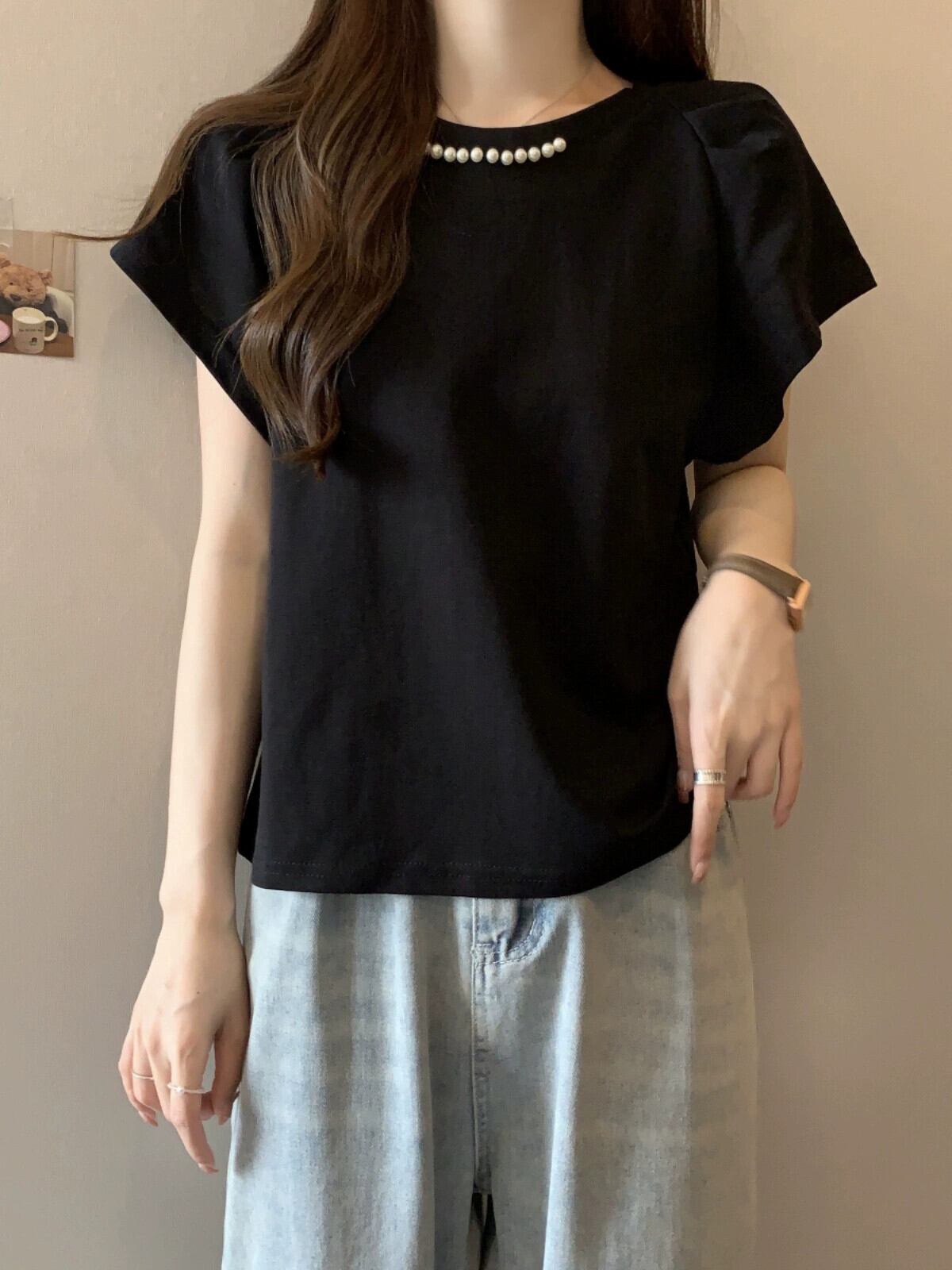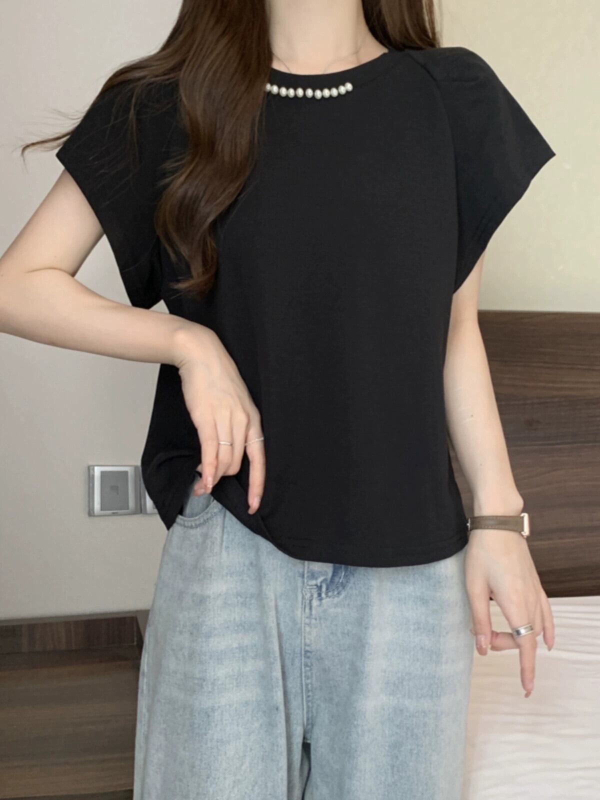 黒の半袖 T シャツの女性の 2023 夏の新バージョンのニッチなデザイン、緩くて薄いオールマッチ ラウンド ネック トップス イン ブラック サマー 夏物 Oネック Tシャツ 7460068134620672 | framboise21