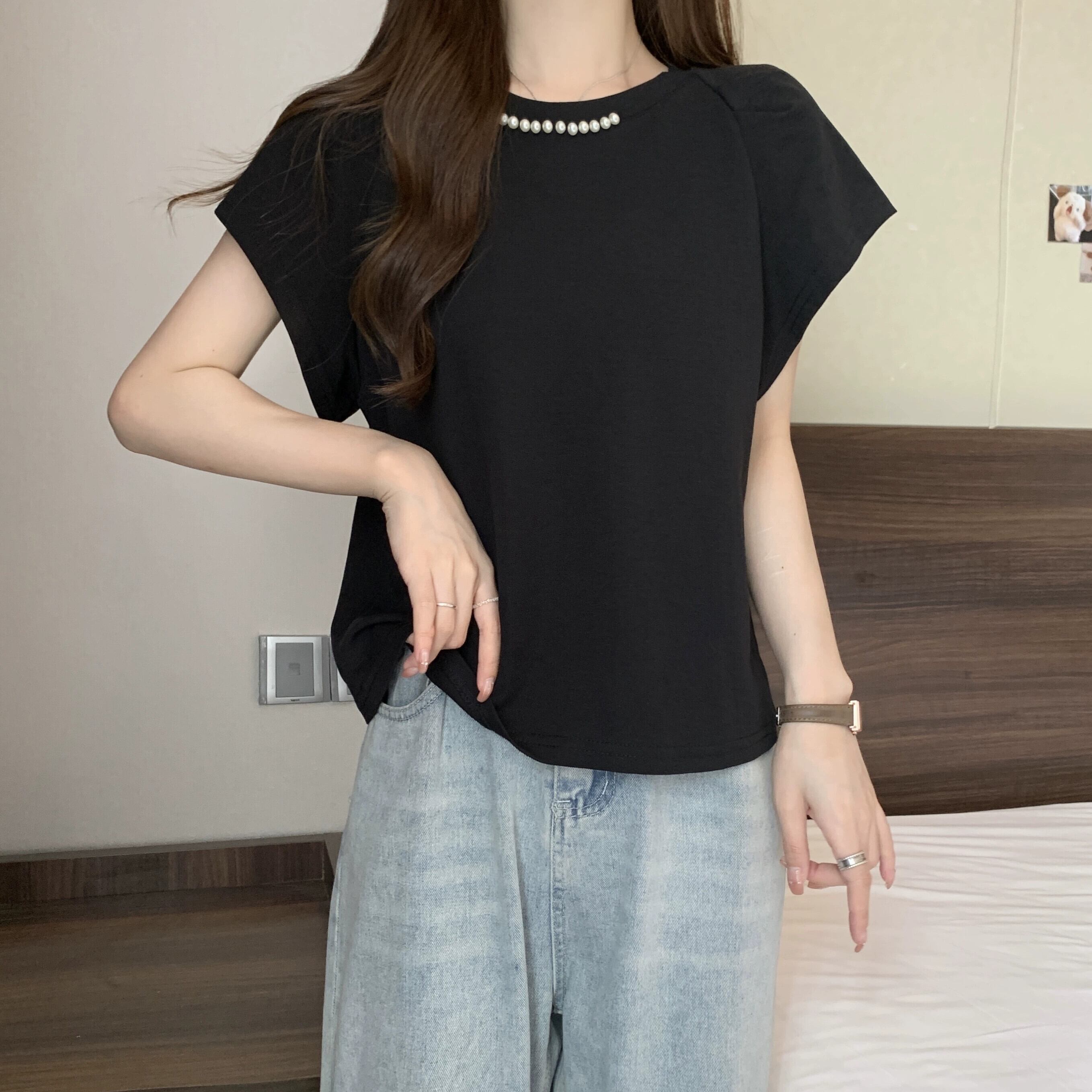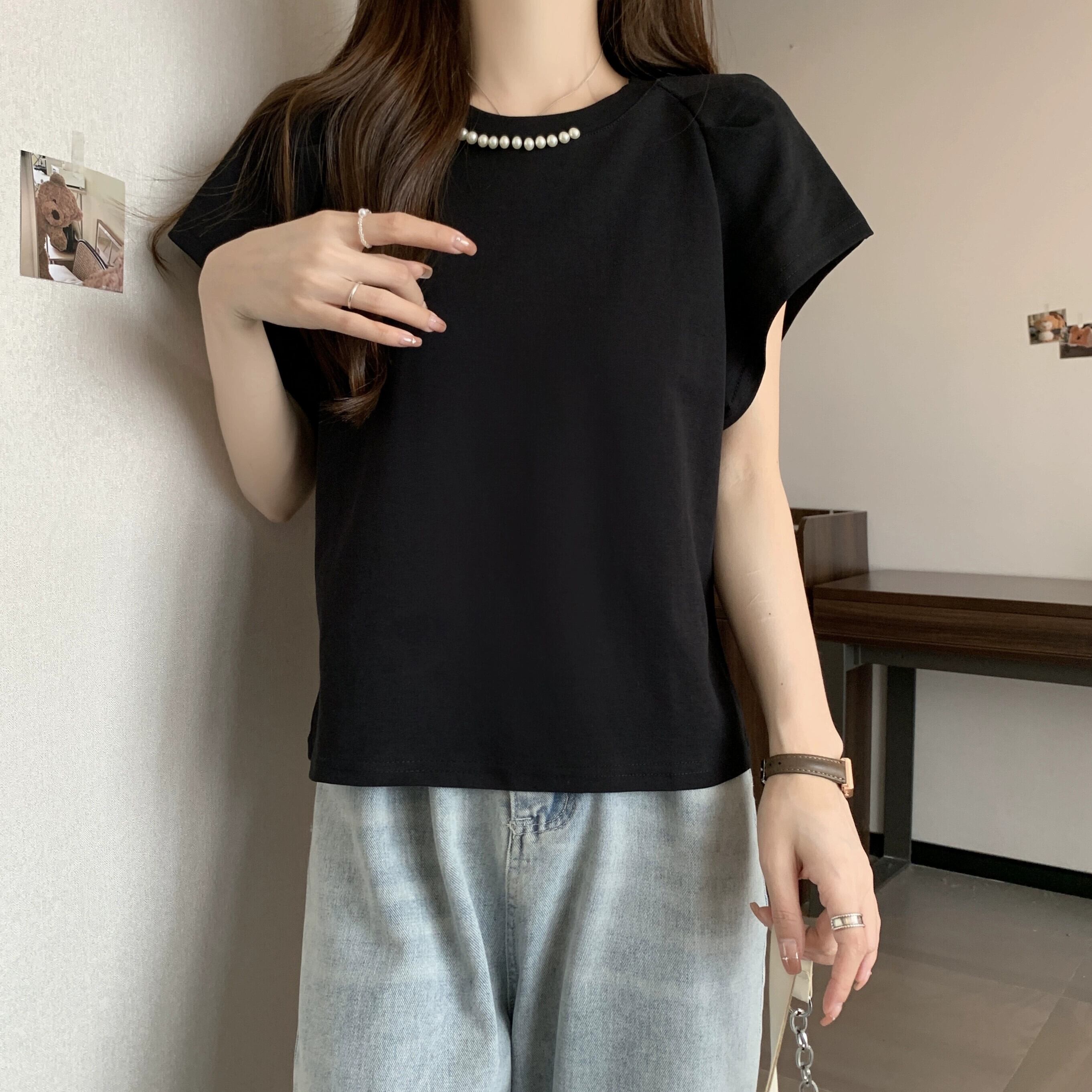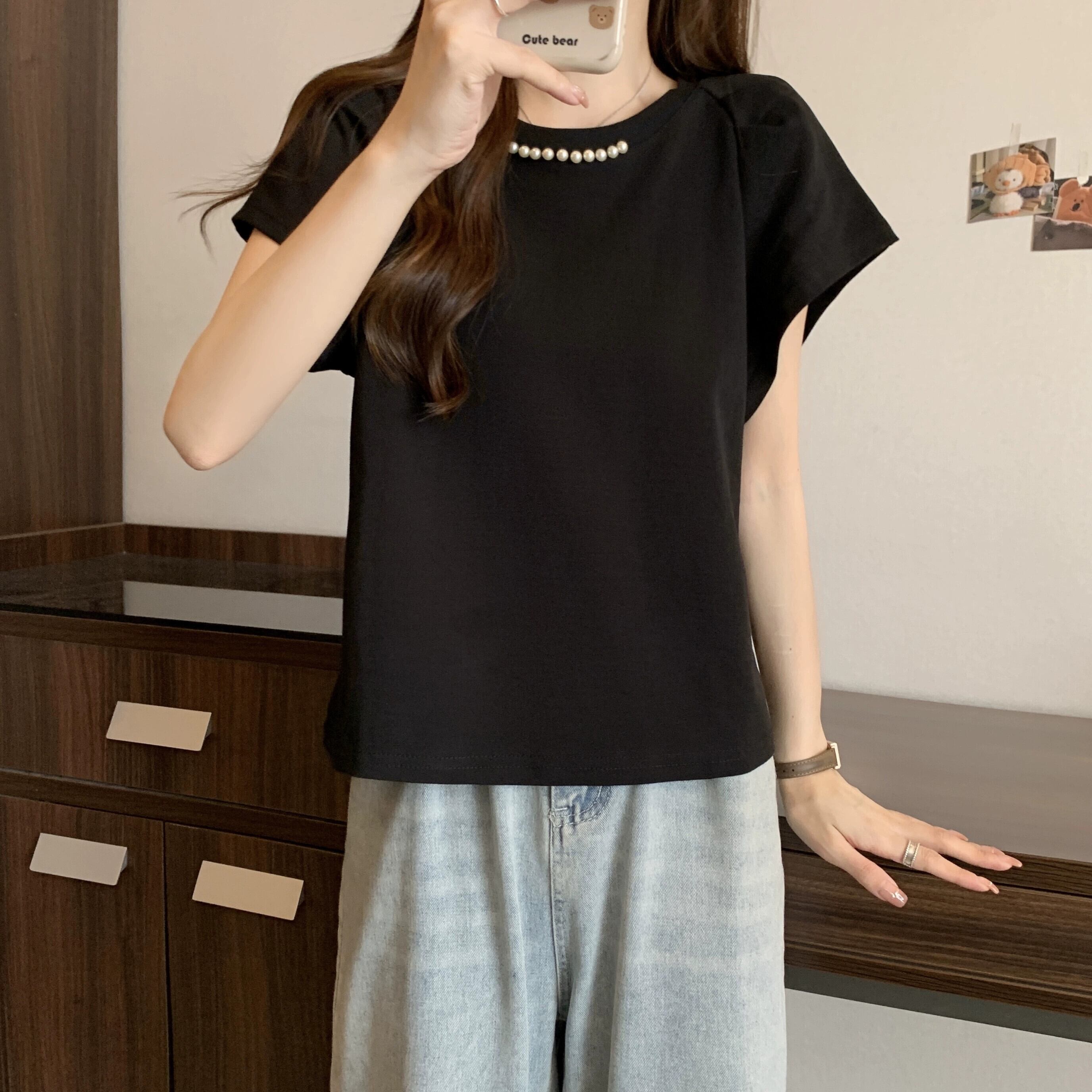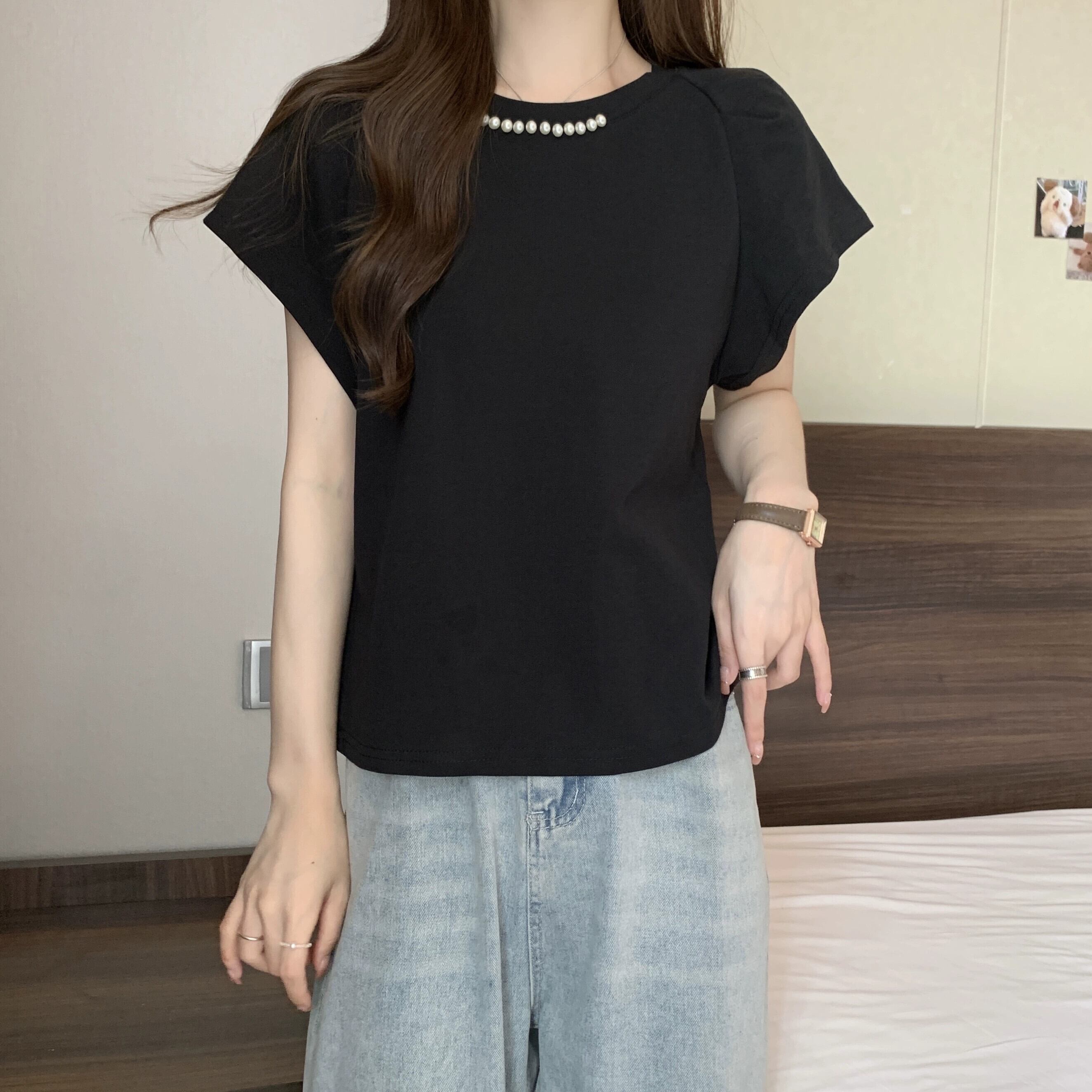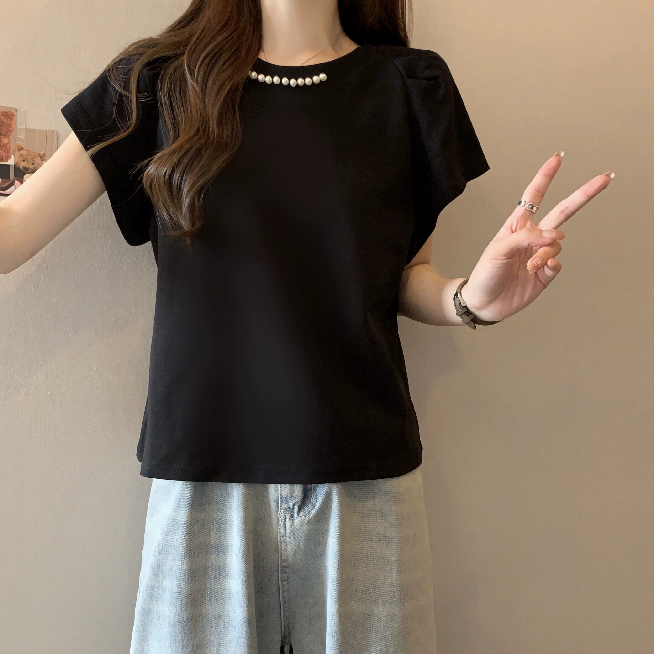 黒の半袖 T シャツの女性の 2023 夏の新バージョンのニッチなデザイン、緩くて薄いオールマッチ ラウンド ネック トップス イン ブラック サマー 夏物 Oネック Tシャツ 7460068134620672 | framboise21