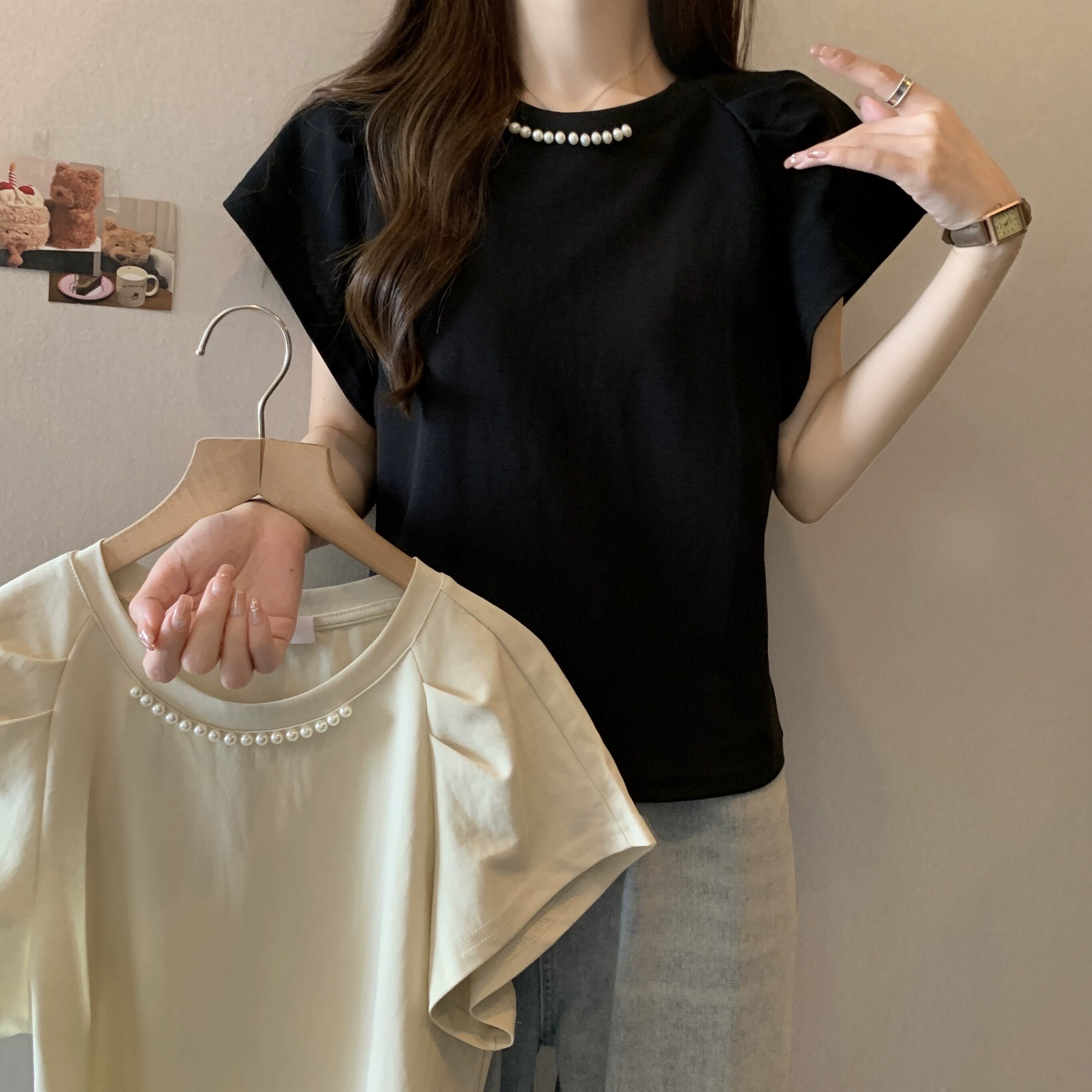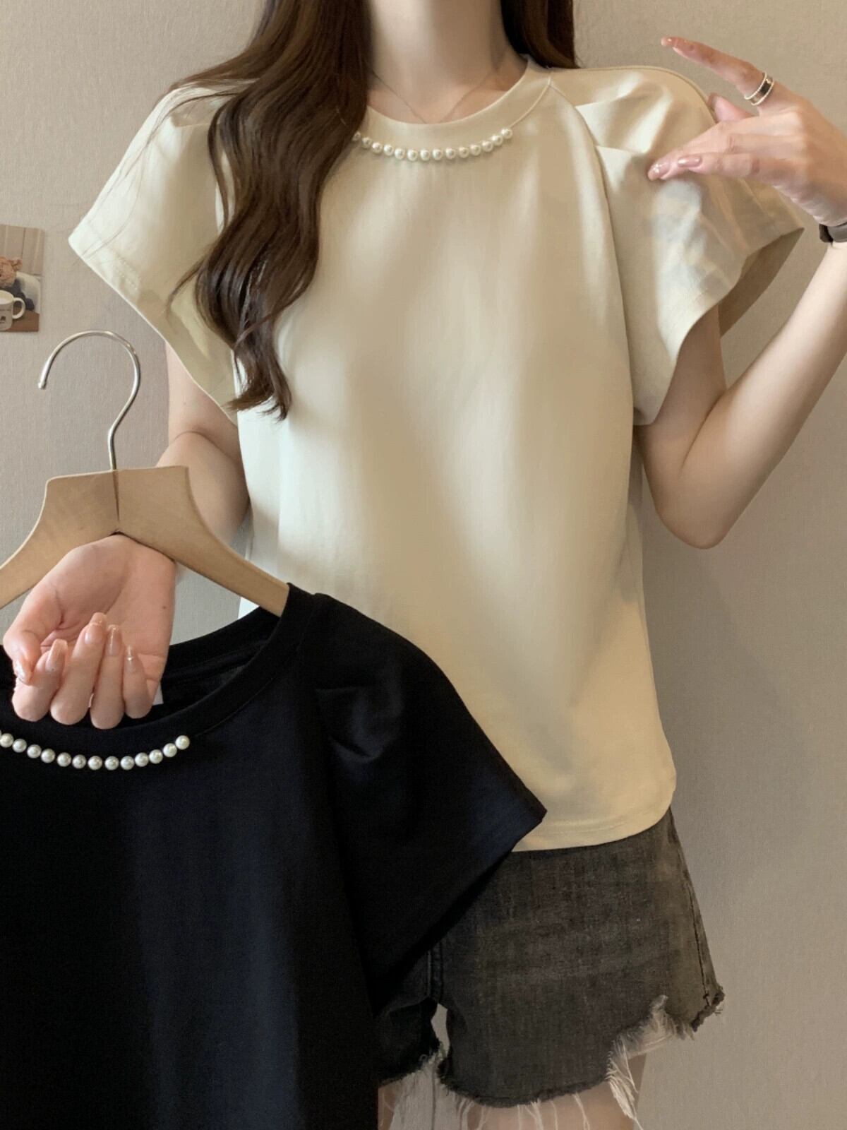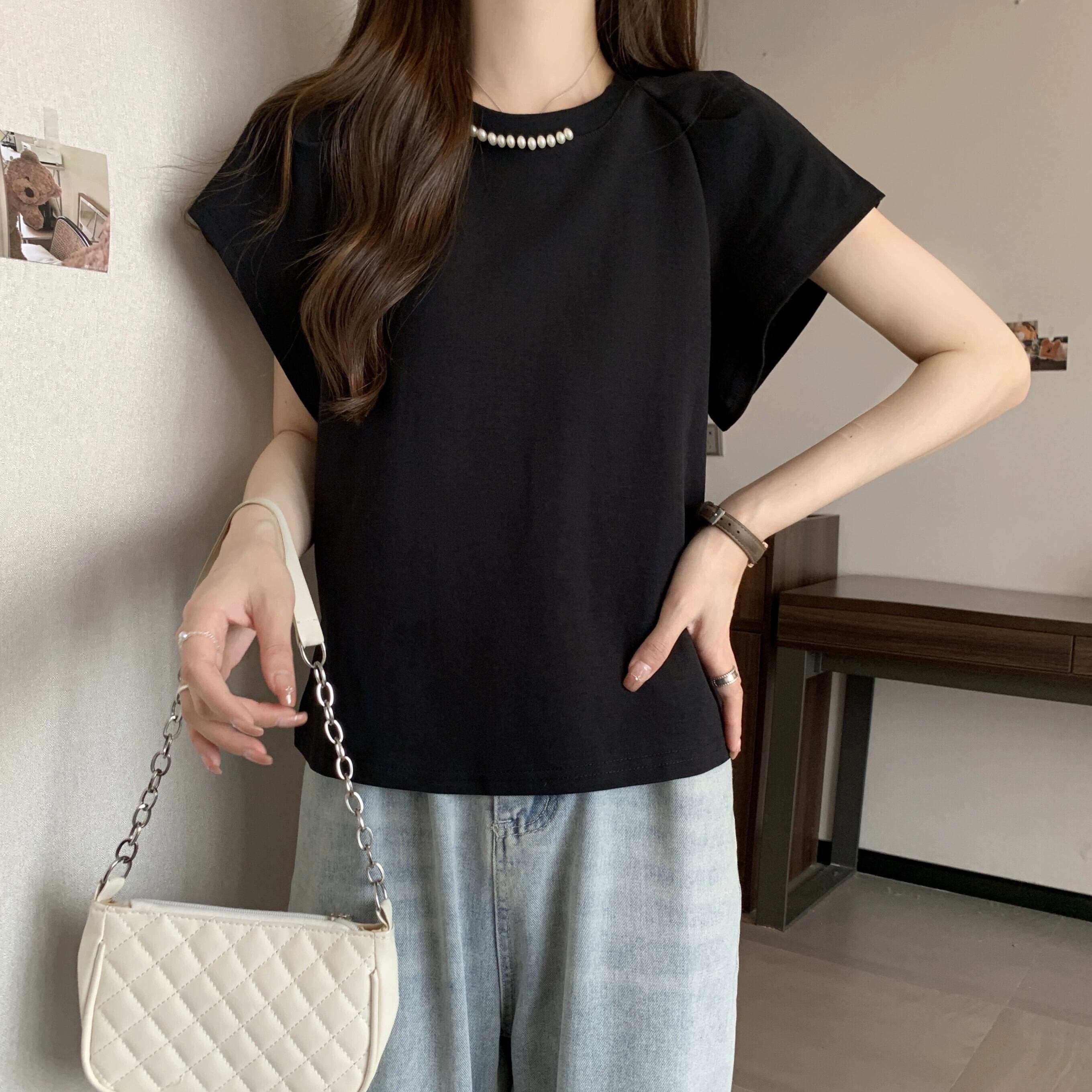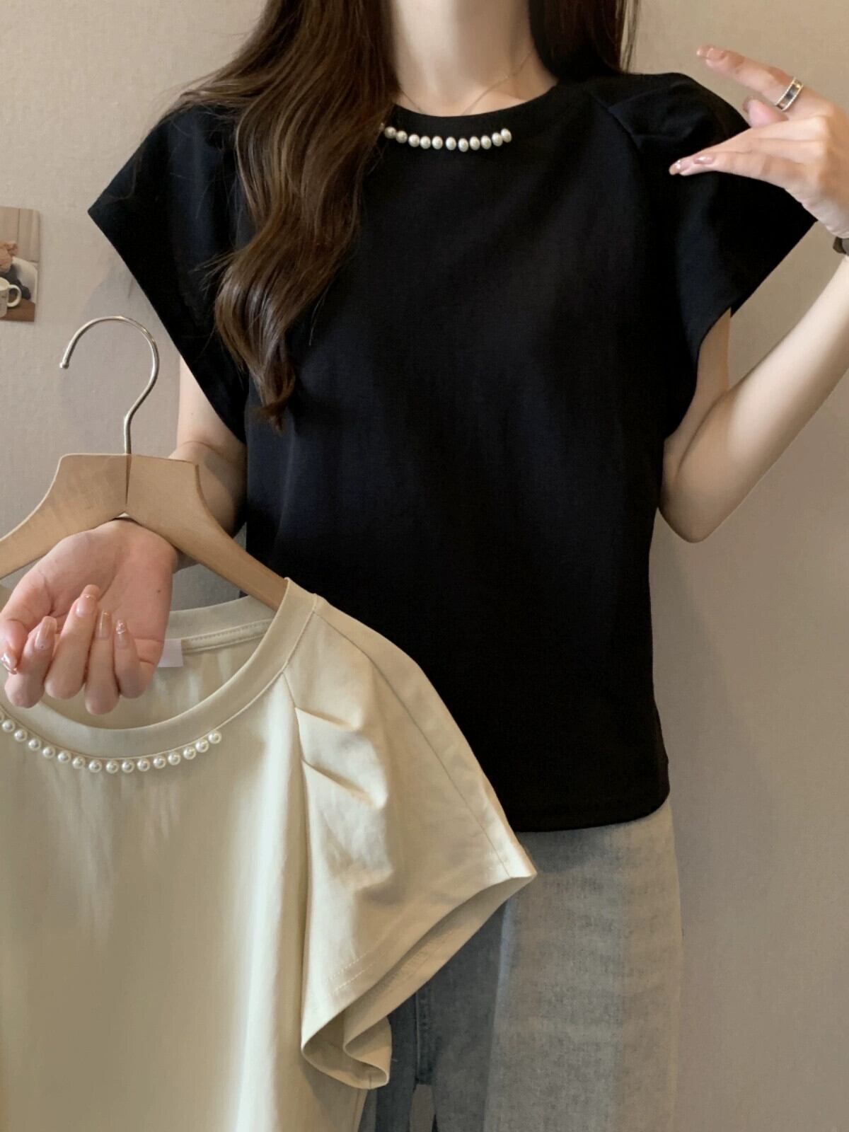 黒の半袖 T シャツの女性の 2023 夏の新バージョンのニッチなデザイン、緩くて薄いオールマッチ ラウンド ネック トップス イン ブラック サマー 夏物 Oネック Tシャツ 7460068134620672 | framboise21