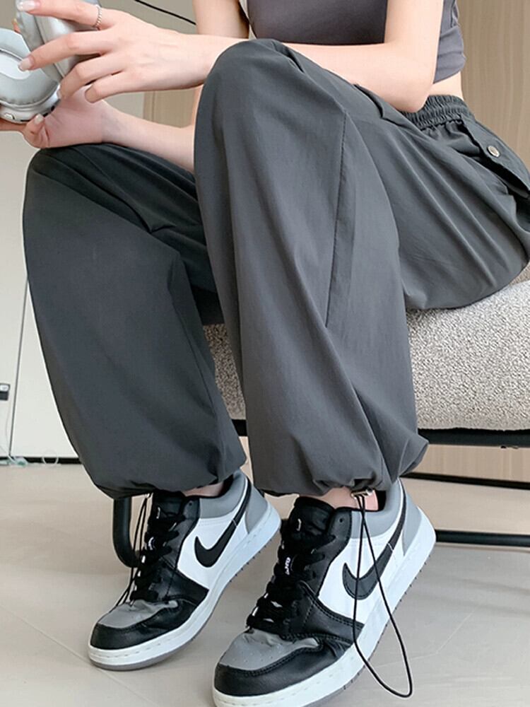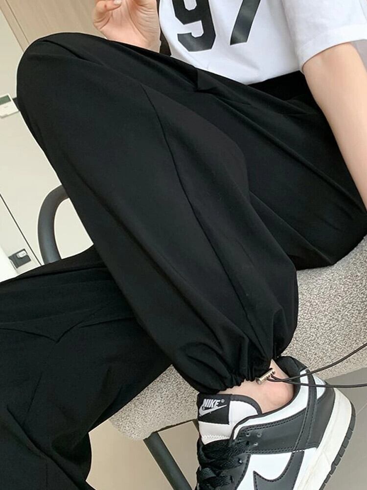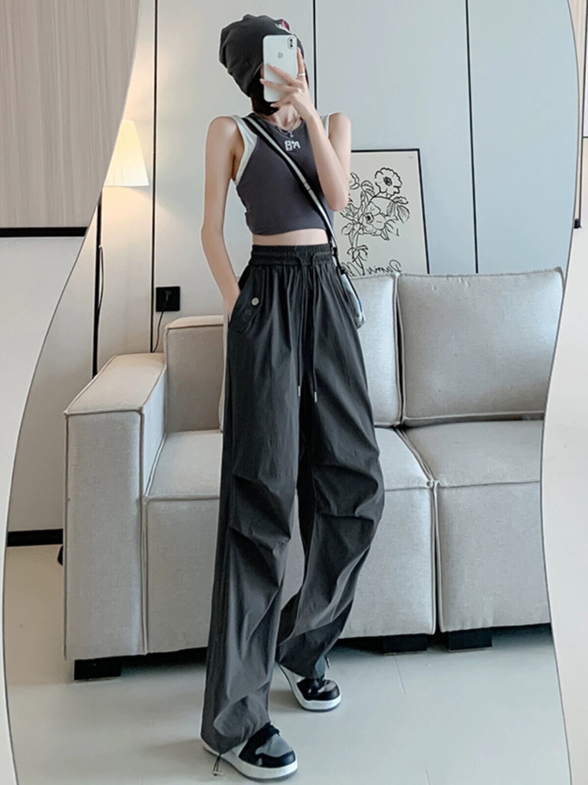 黒の巾着速乾オーバーオール女性の夏の薄いセクションドレープアイスシルクワイドレッグパンツカジュアルハイウエストパンツトレンディ ブラック サマー 夏物 7460042561051081 | framboise21