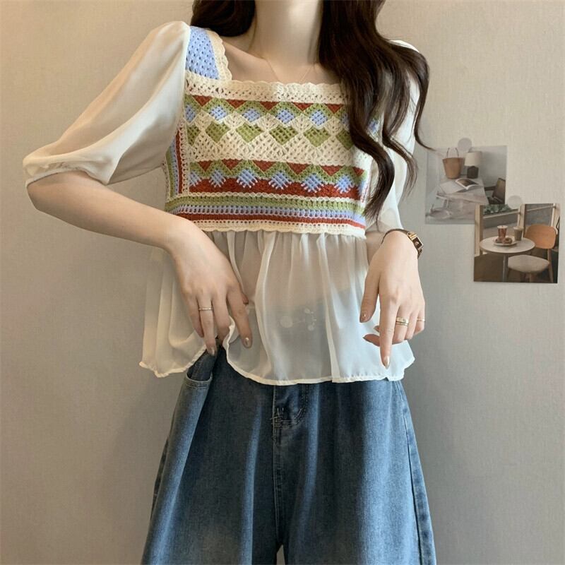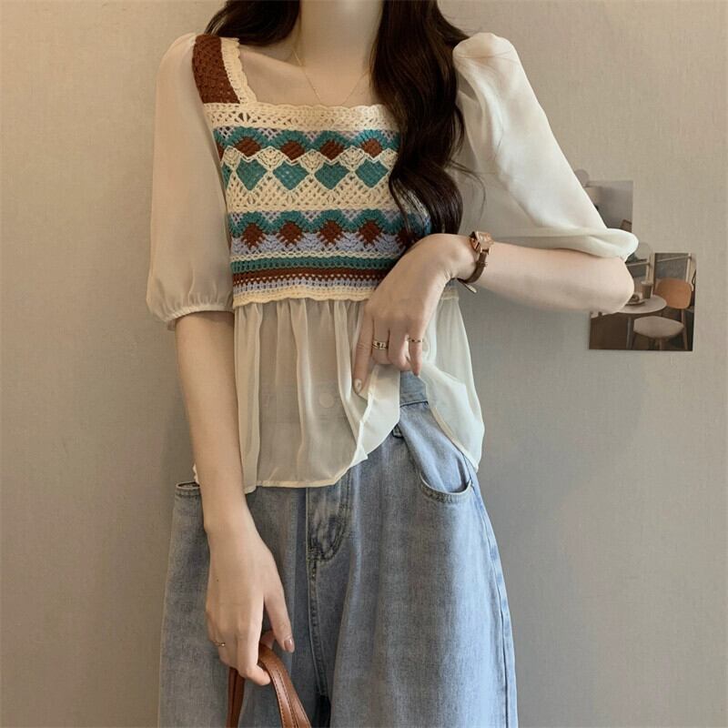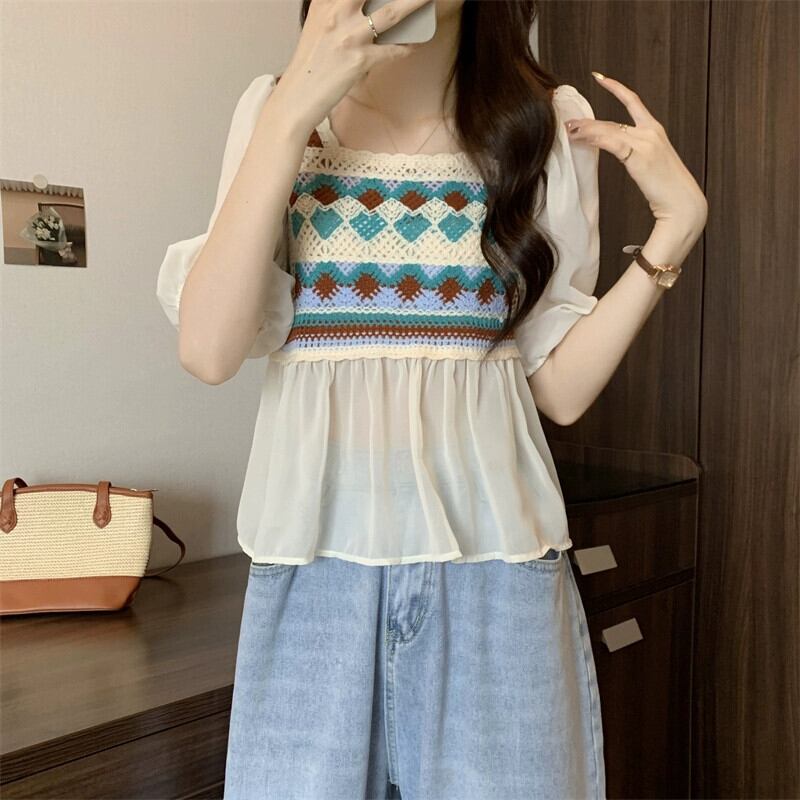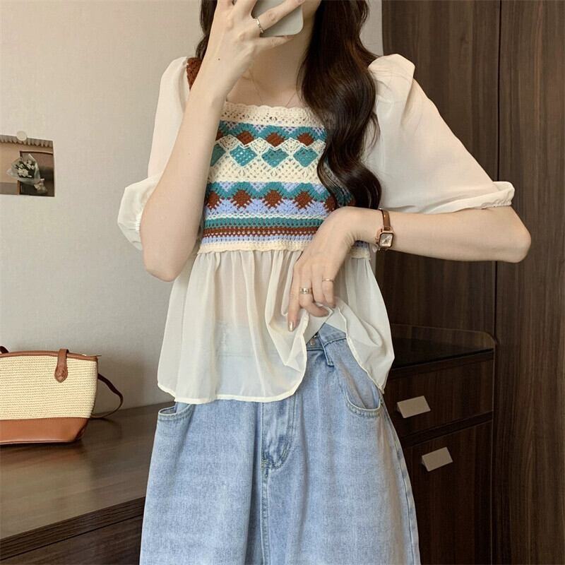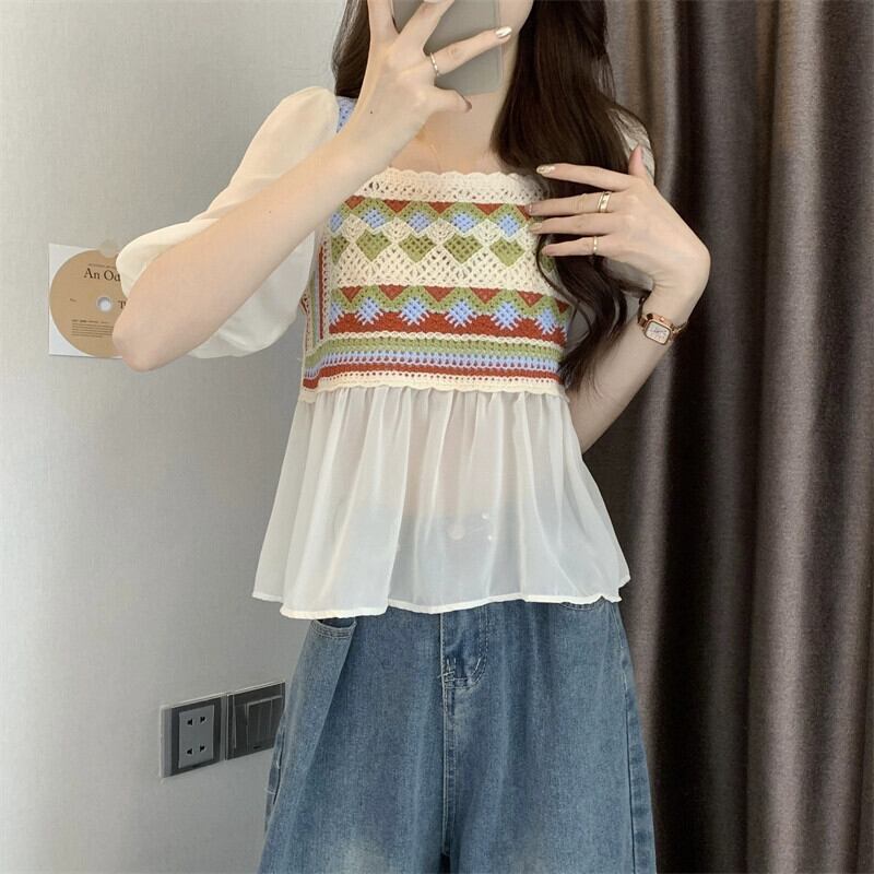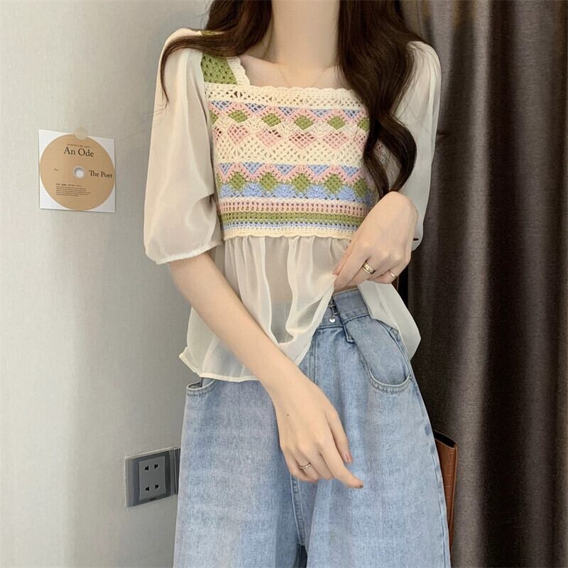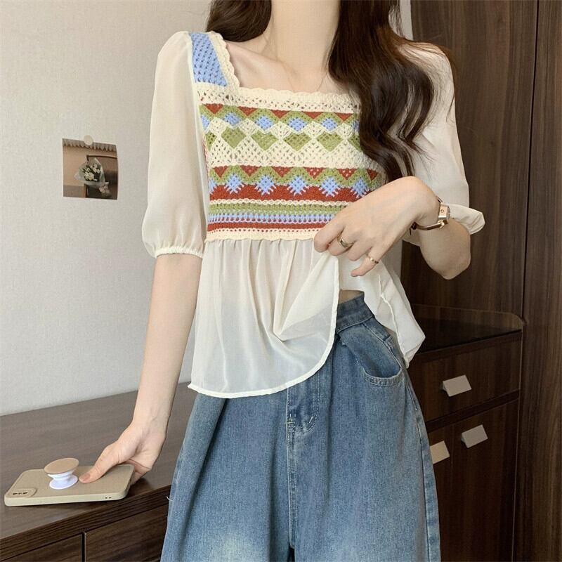 薄手の半袖シフォンシャツ女性の夏フレンチニッチシックルーズスモールシャツニットスプライシングショートスクエアカラートップ サマー 夏物 スクウェア 7460037242243808 | framboise21