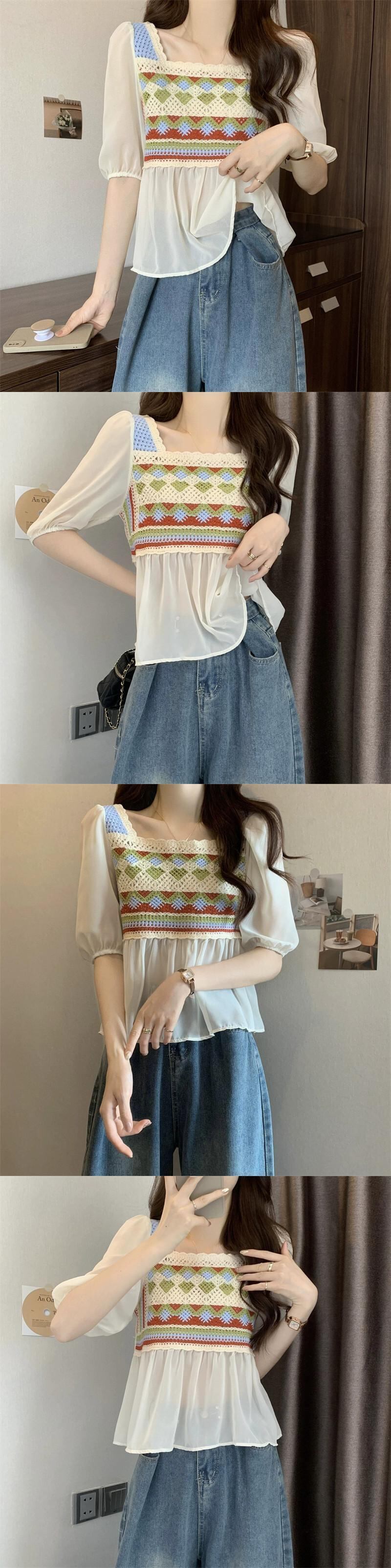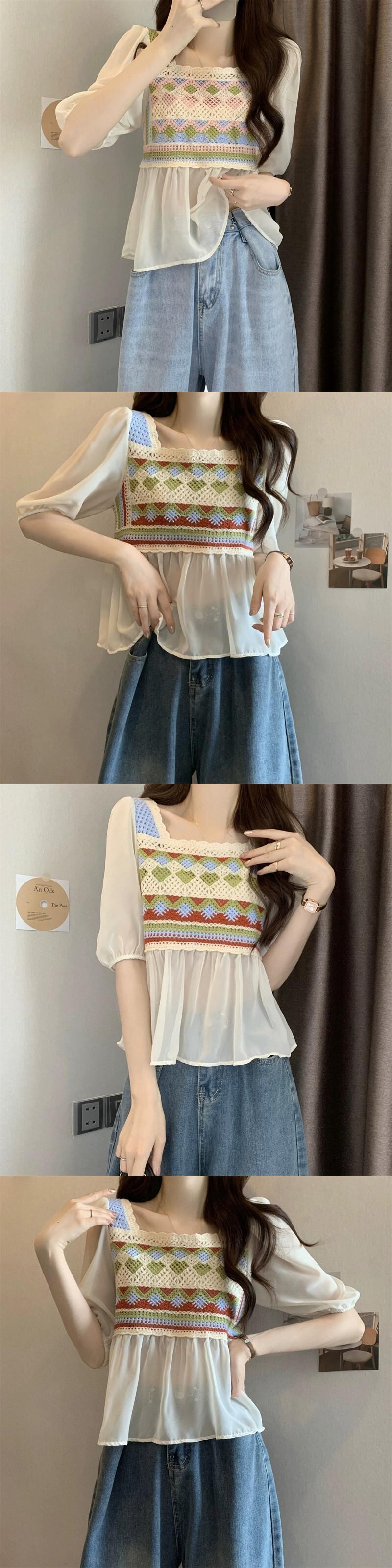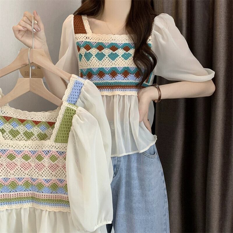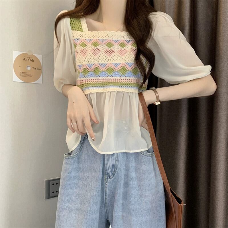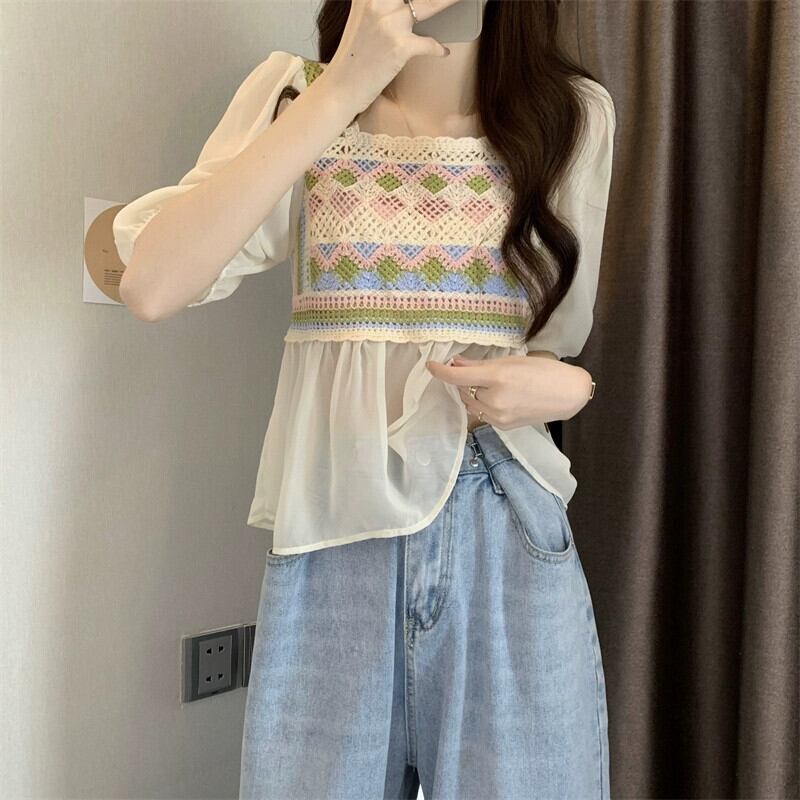 薄手の半袖シフォンシャツ女性の夏フレンチニッチシックルーズスモールシャツニットスプライシングショートスクエアカラートップ サマー 夏物 スクウェア 7460037242243808 | framboise21