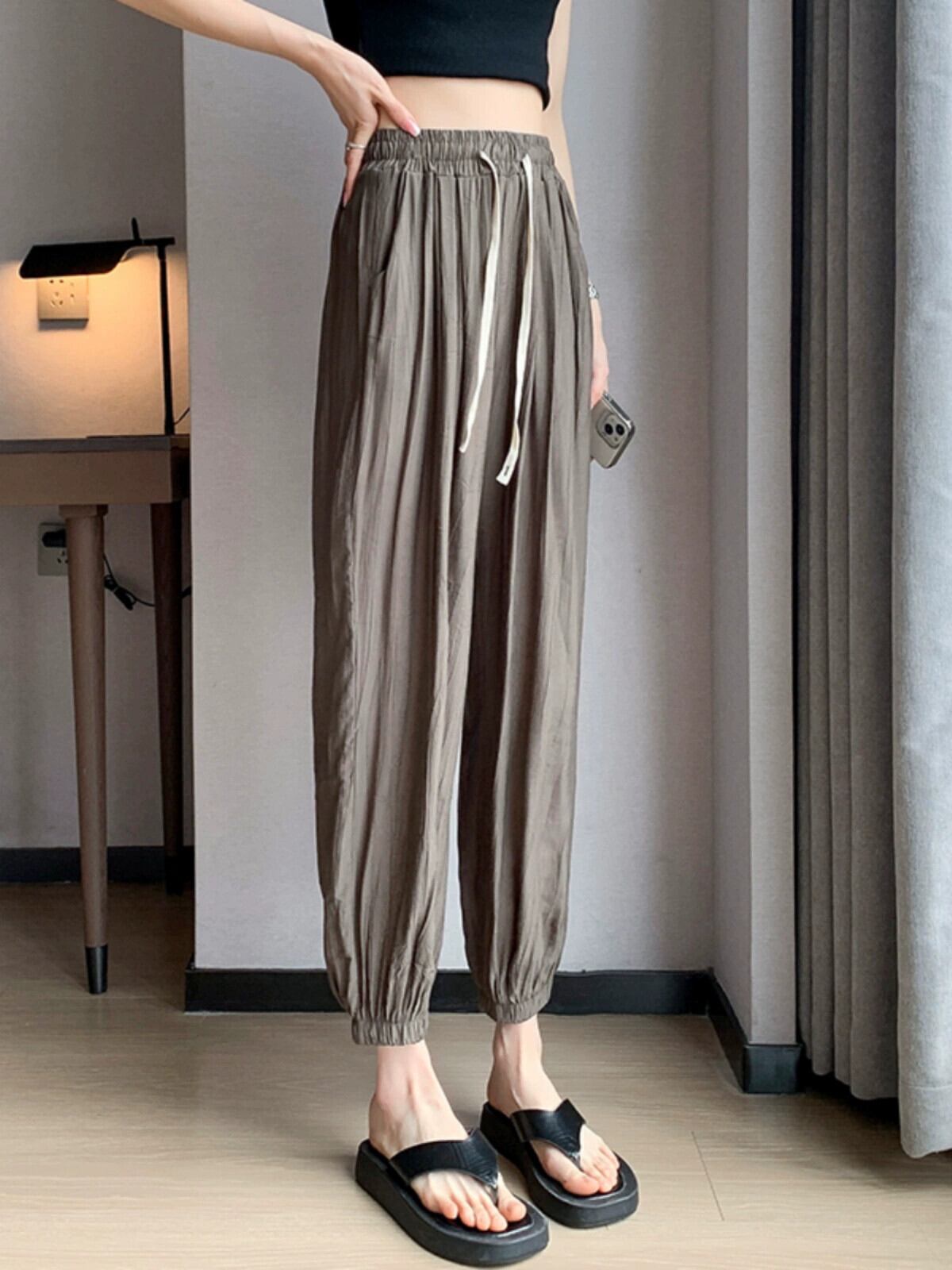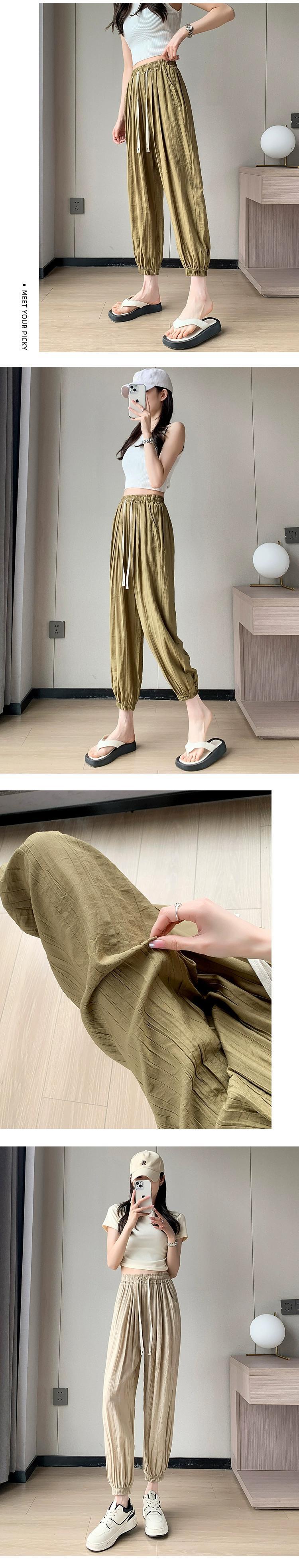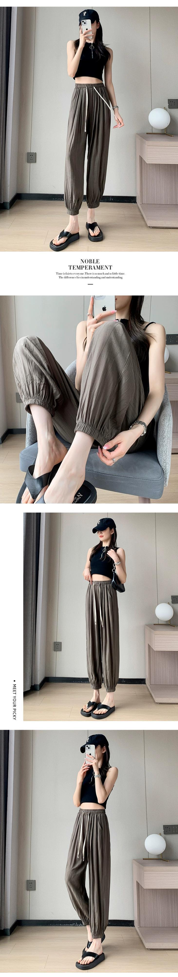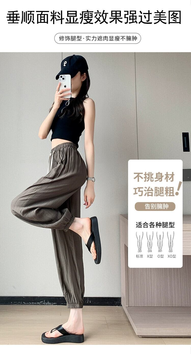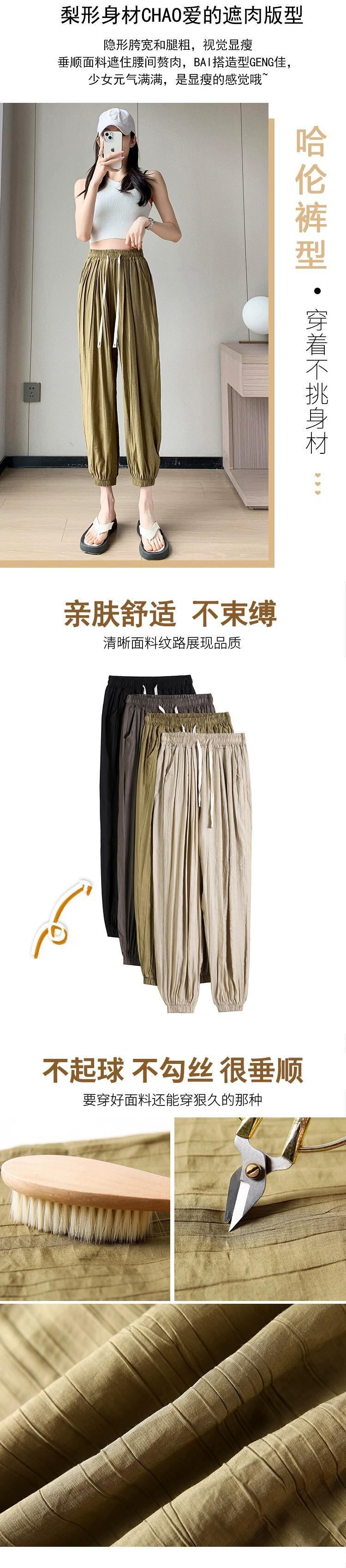 折り足アイスシルクパンツ女性の夏の薄いセクション弾性ウエストハーレムパンツスリムハイウエスト 9 ポイントストレートカジュアルパンツ ハイウェスト エラスティック 伸縮 サマー 夏物 746002931837021 | framboise21