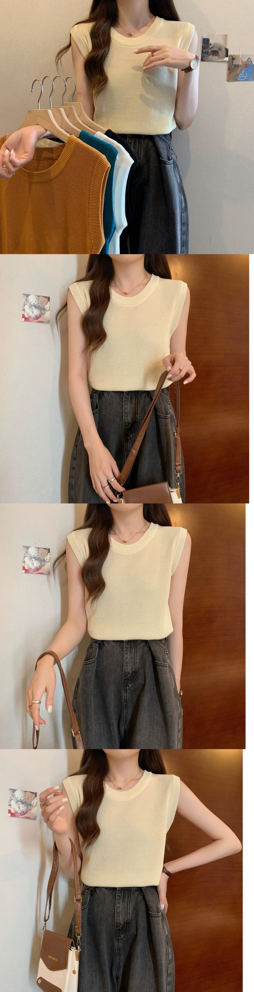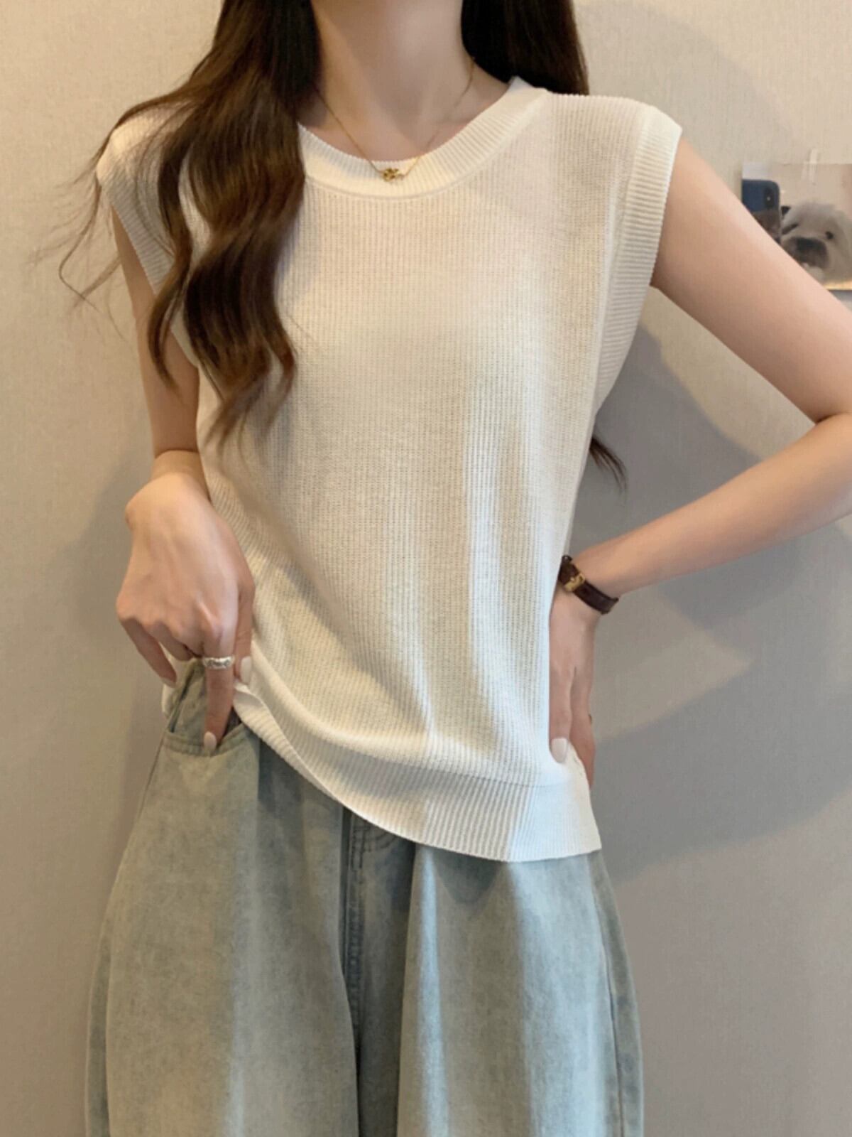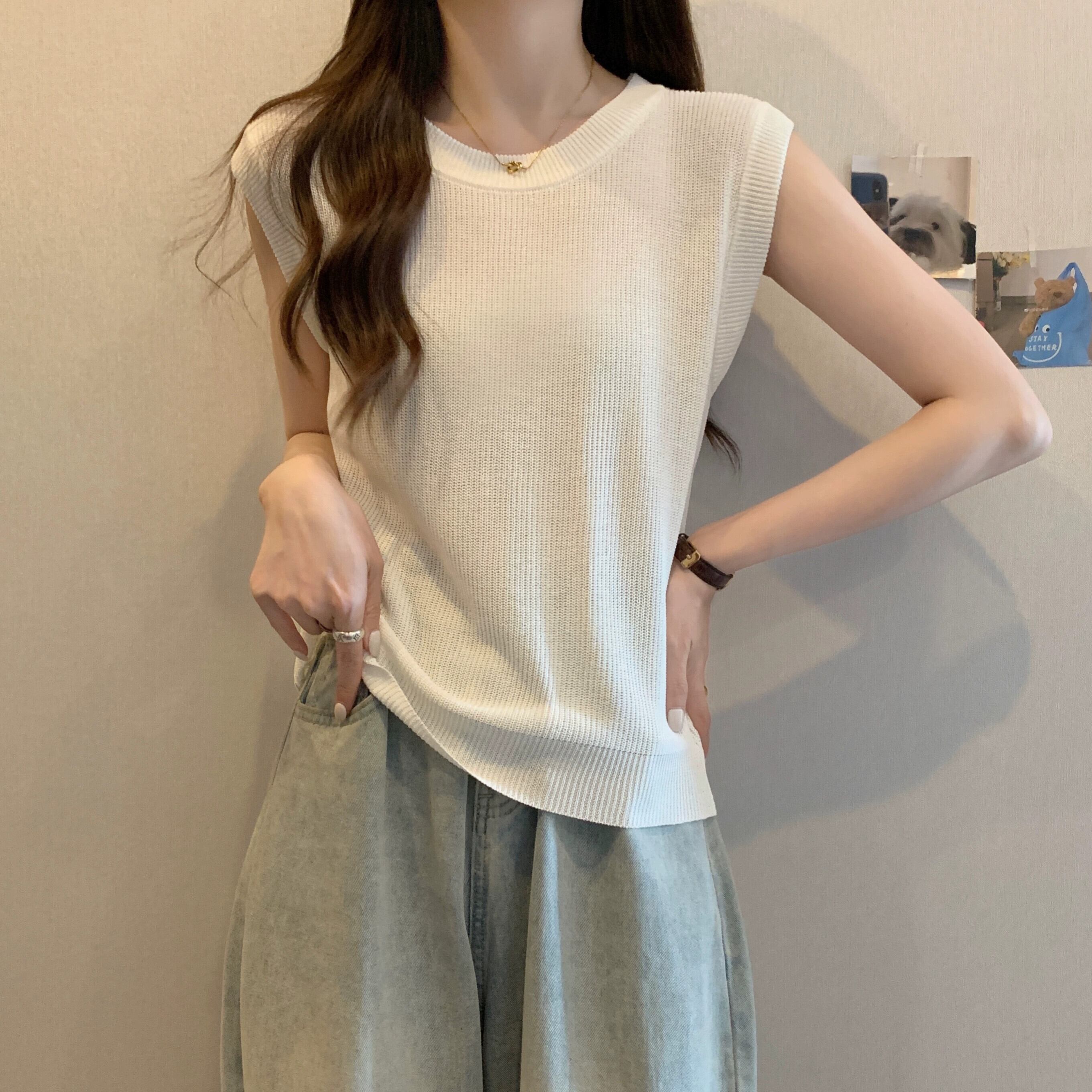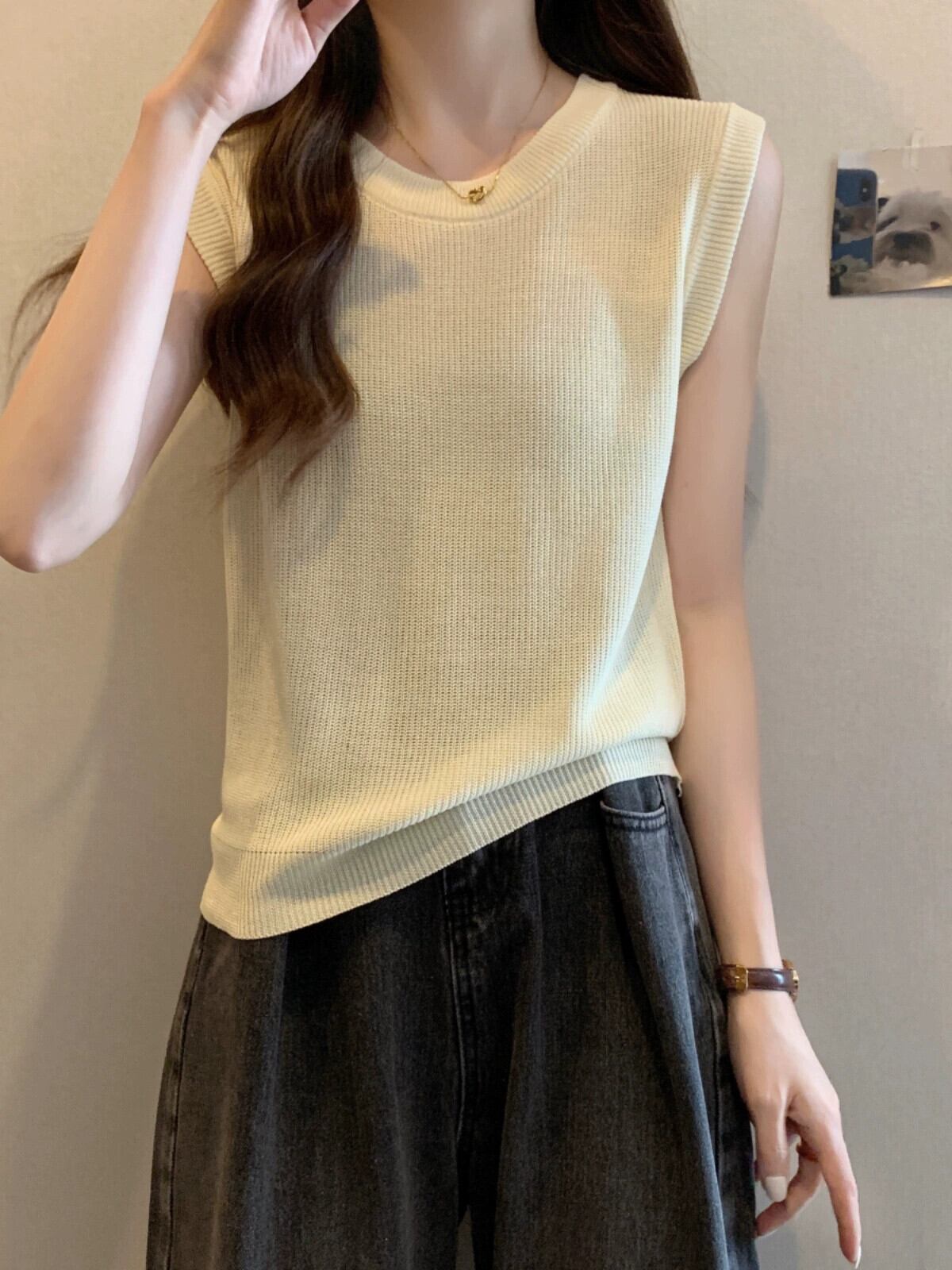 薄氷シルクニットノースリーブ tシャツ女性の夏の 2023 新しい eign スタイルファッションルーズオールマッチショートラウンドネックトップ サマー 夏物 Oネック 7460094764041771 | framboise21