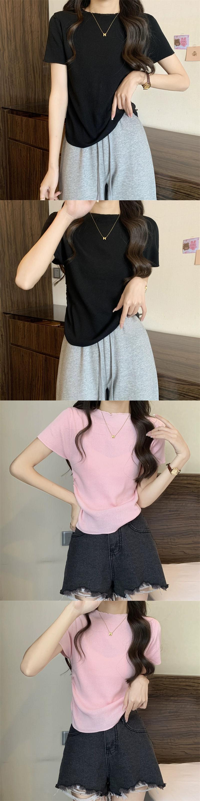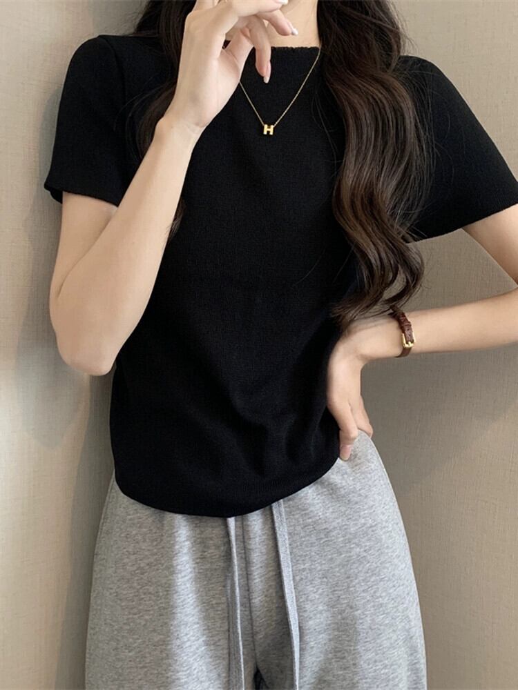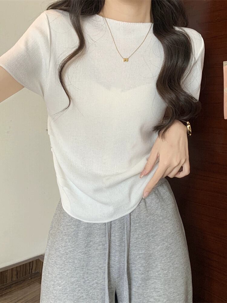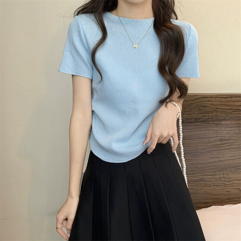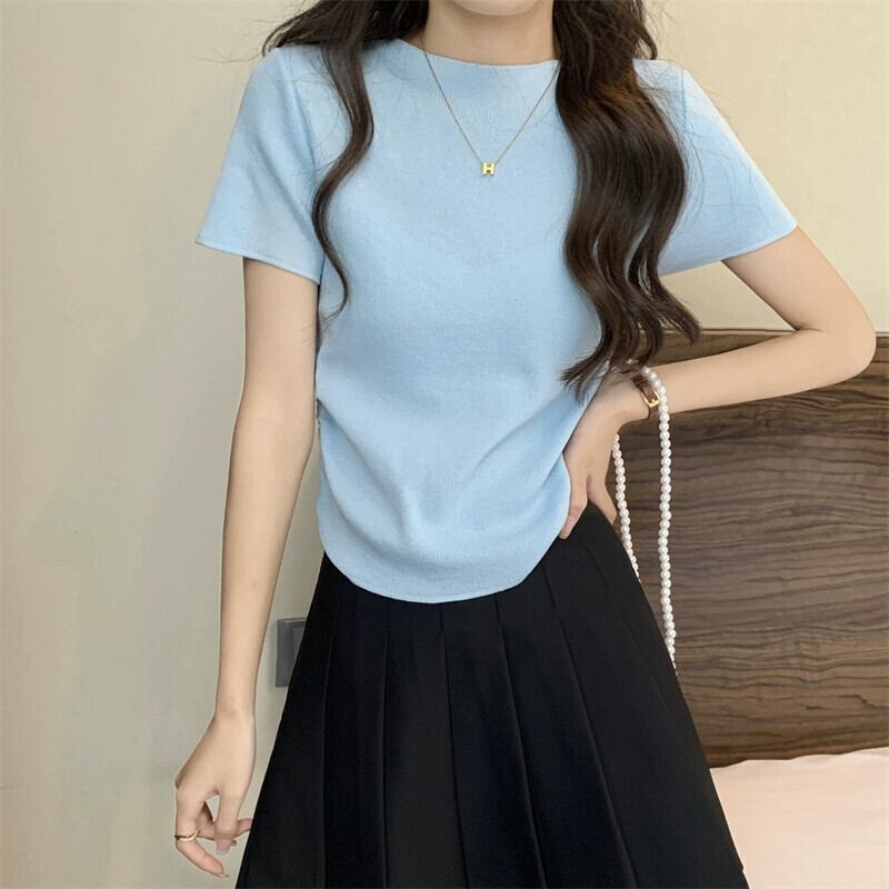 アイスシルクニットフロントショルダー半袖 Tシャツ女性の夏スリムフィット不規則な裾ラウンドネックショートトップ ハーフスリーブ サマー 夏物 Oネック 7460078204812901 | framboise21