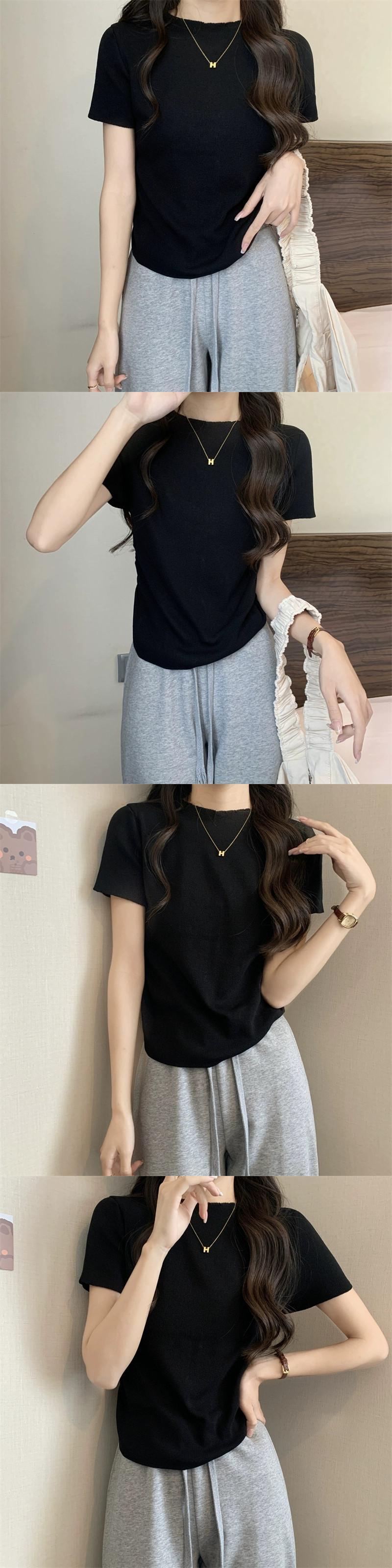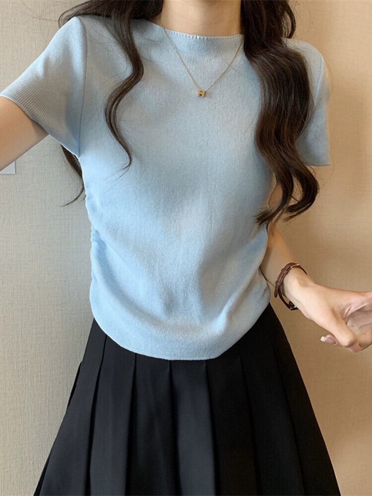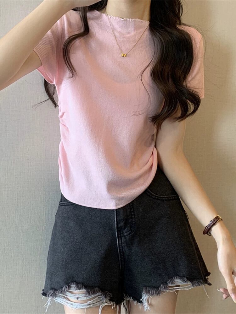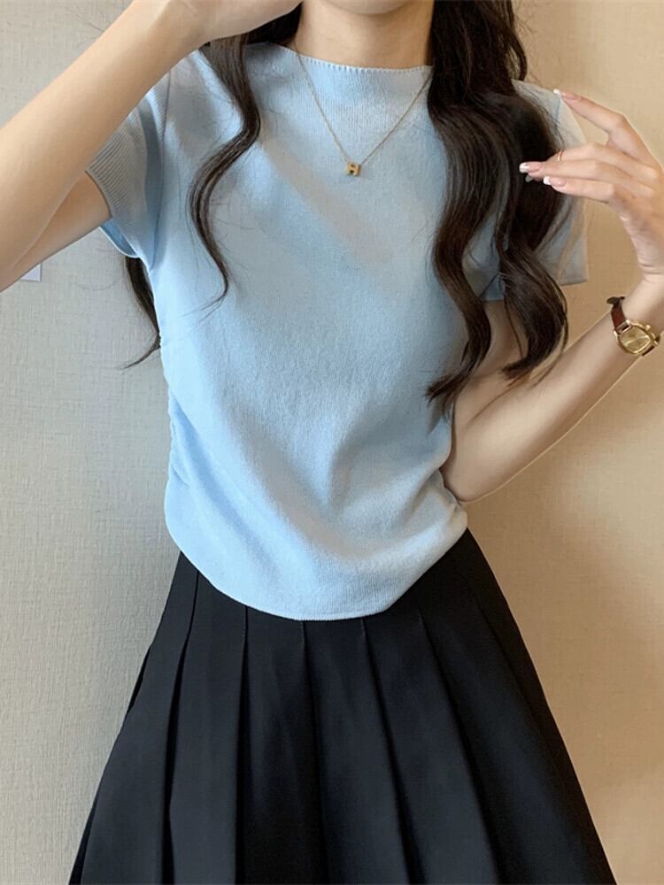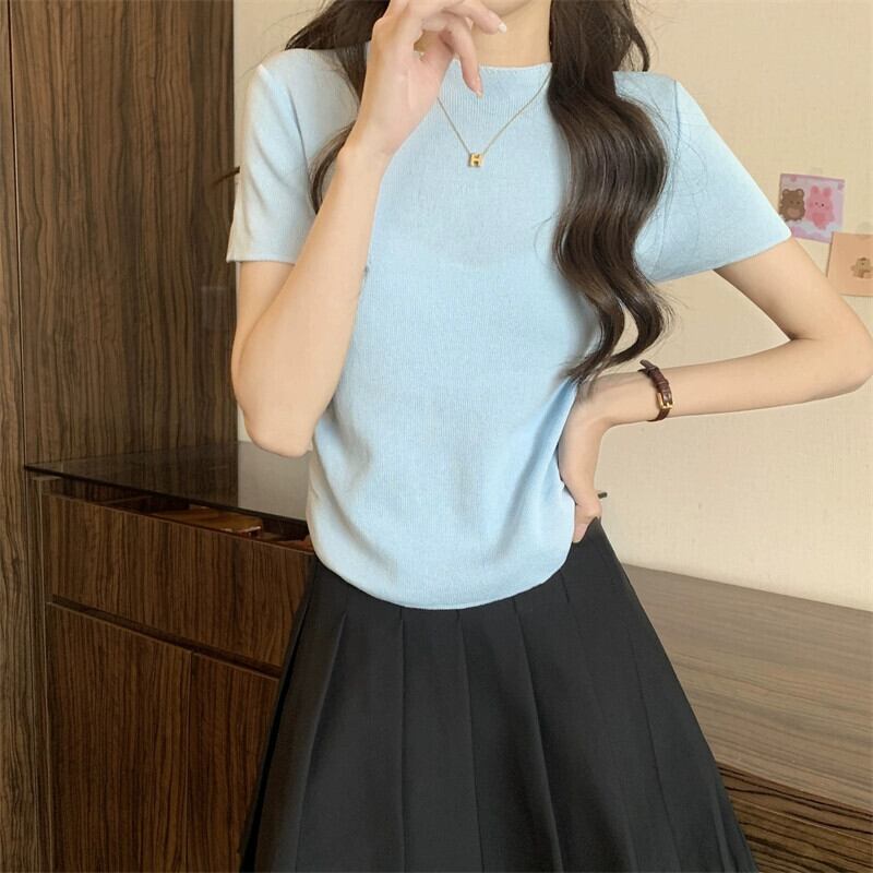 アイスシルクニットフロントショルダー半袖 Tシャツ女性の夏スリムフィット不規則な裾ラウンドネックショートトップ ハーフスリーブ サマー 夏物 Oネック 7460078204812901 | framboise21