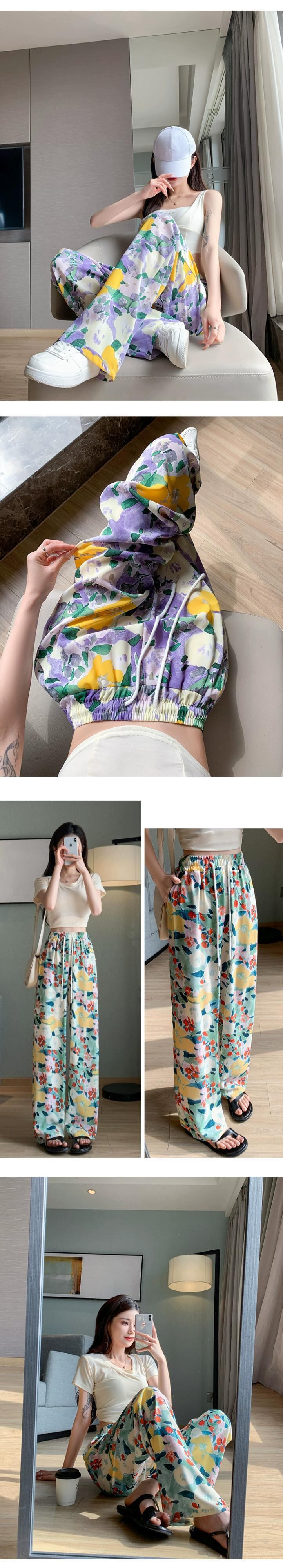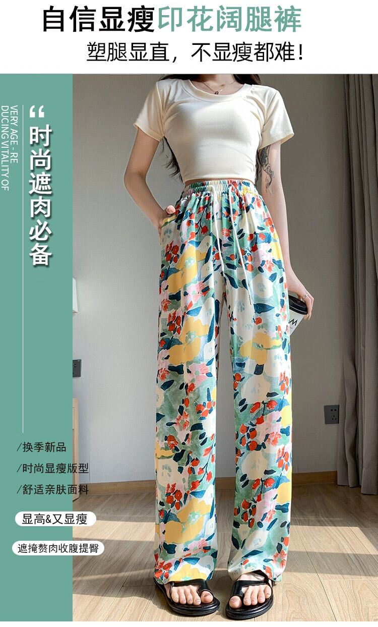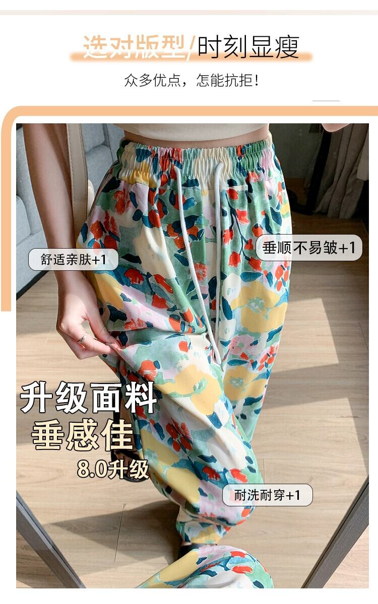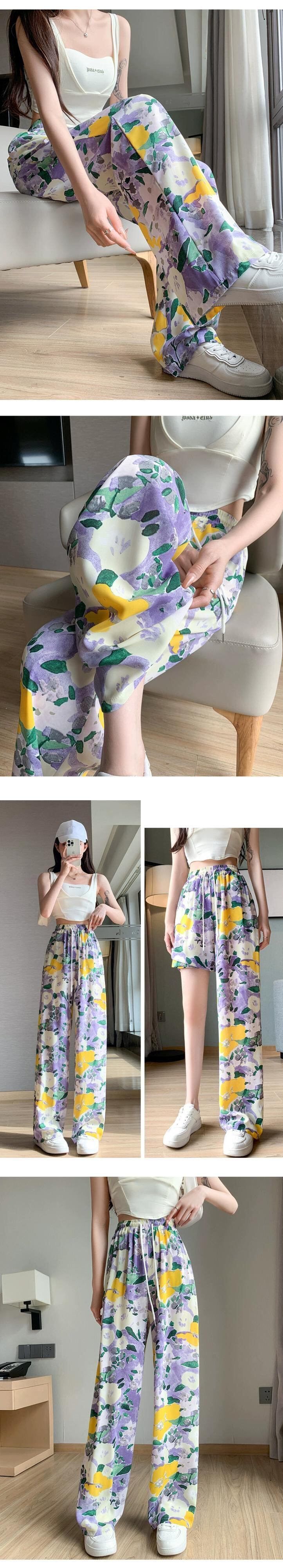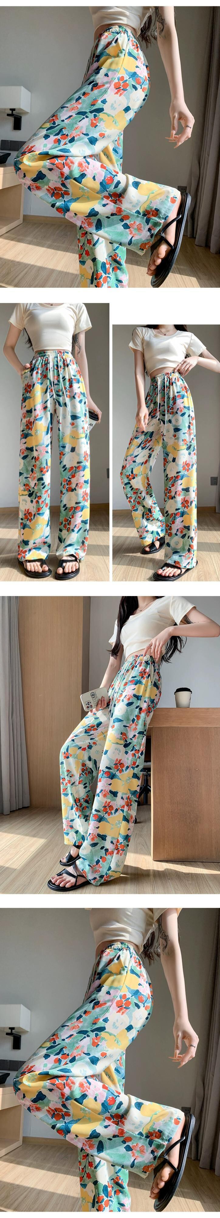 弾性ウエスト花日焼け止めパンツ女性の夏の薄いセクションアイスシルクプリントワイドレッグパンツカジュアルストレートハイウエストモップパンツ エラスティック 伸縮 サマー 夏物 花柄 7460086315056600 | framboise21