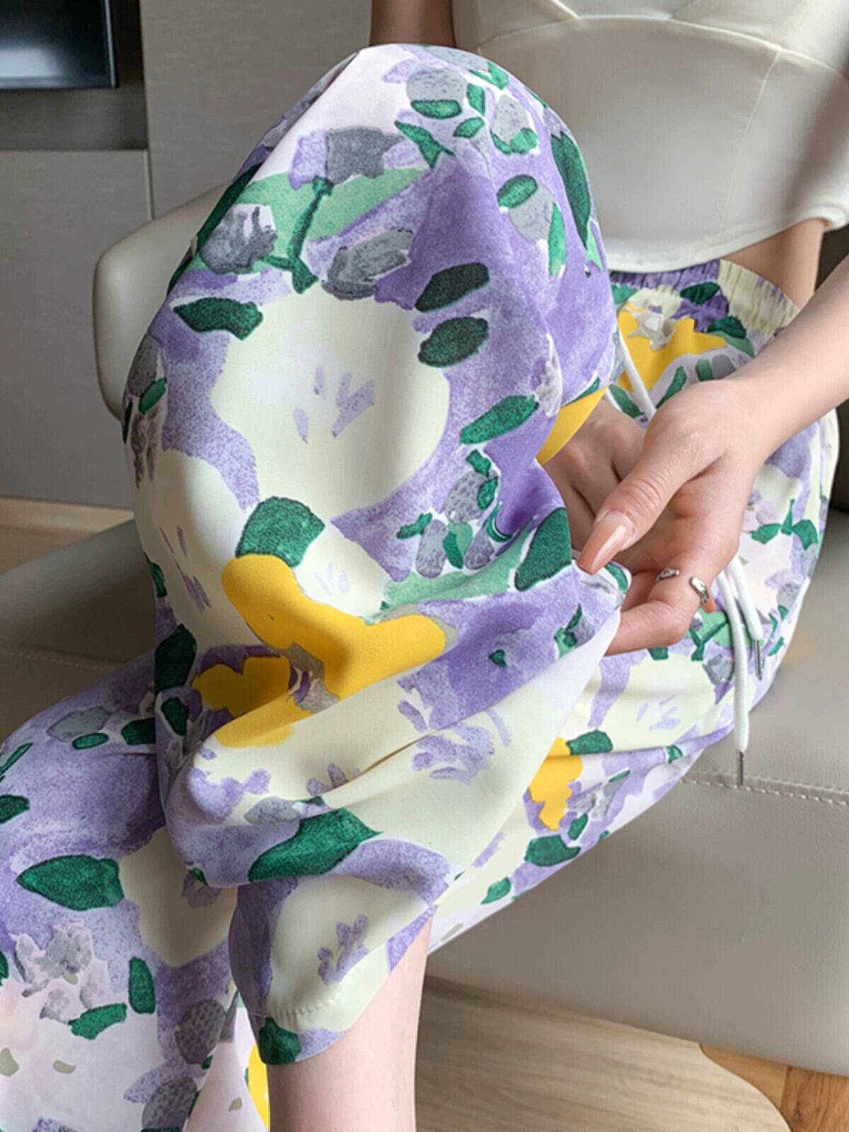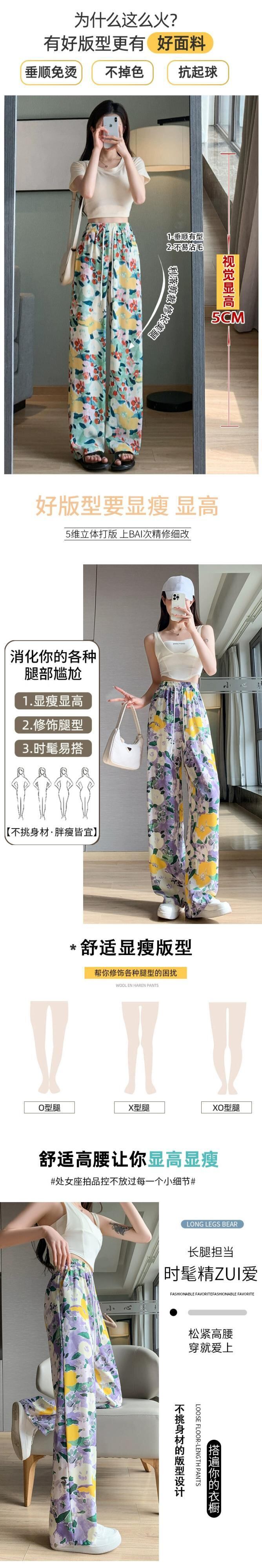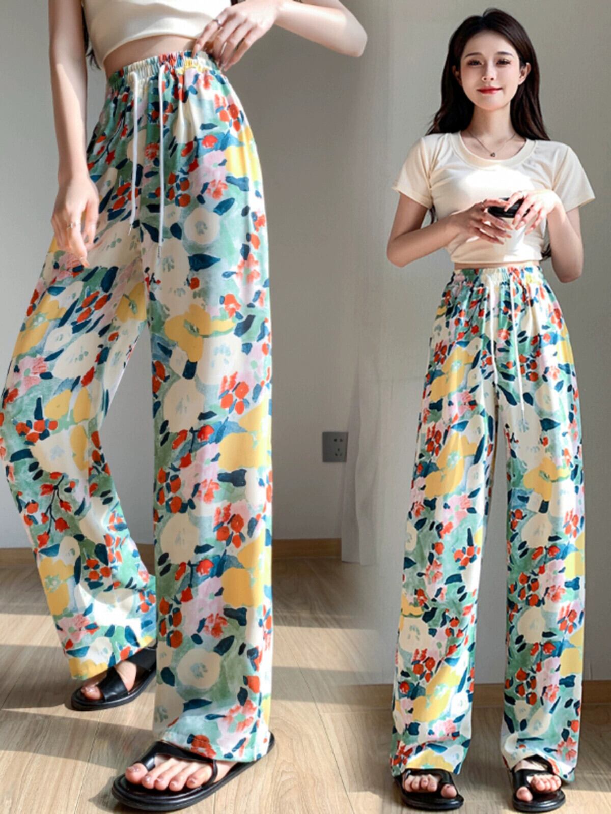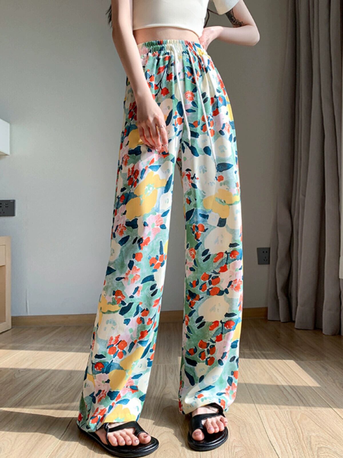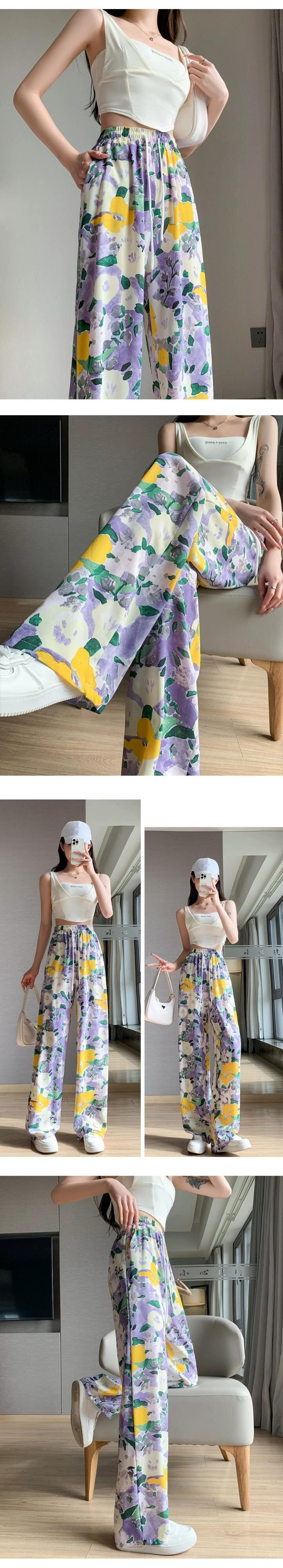 弾性ウエスト花日焼け止めパンツ女性の夏の薄いセクションアイスシルクプリントワイドレッグパンツカジュアルストレートハイウエストモップパンツ エラスティック 伸縮 サマー 夏物 花柄 7460086315056600 | framboise21