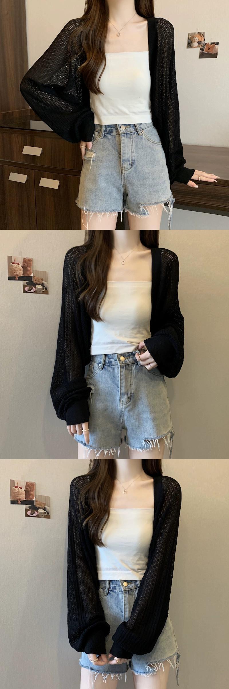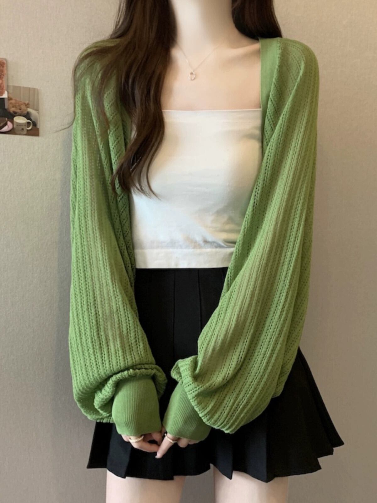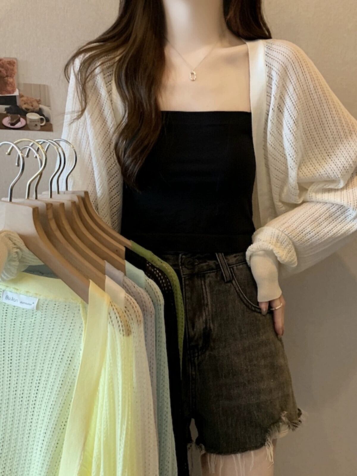 アイスシルク日焼け止めカーディガン女性の薄い夏サスペンダー小さなベストショルダーショールブラウス中空長袖ニットトップ ロング サマー 夏物 7460090673238473 | framboise21