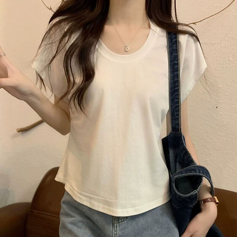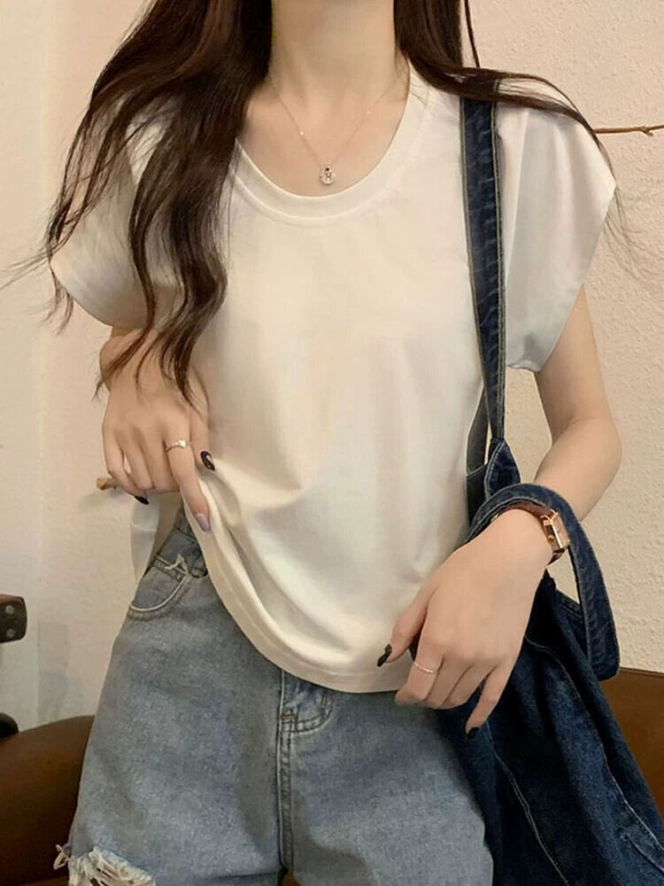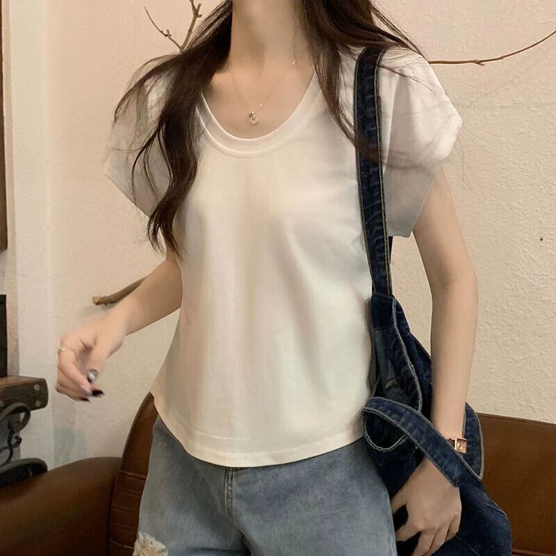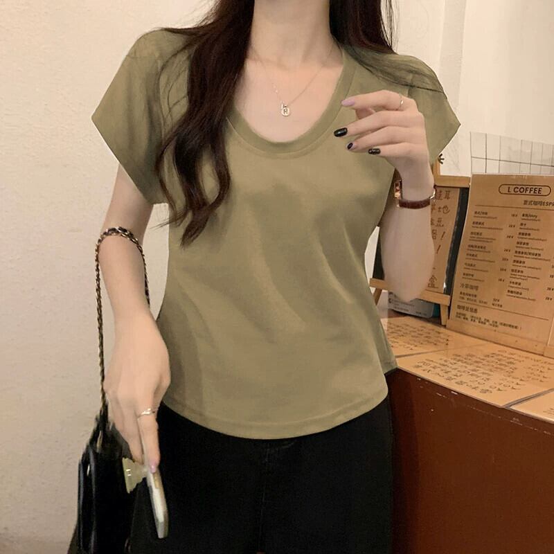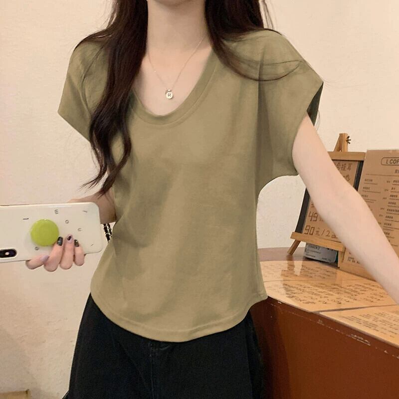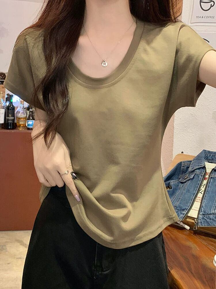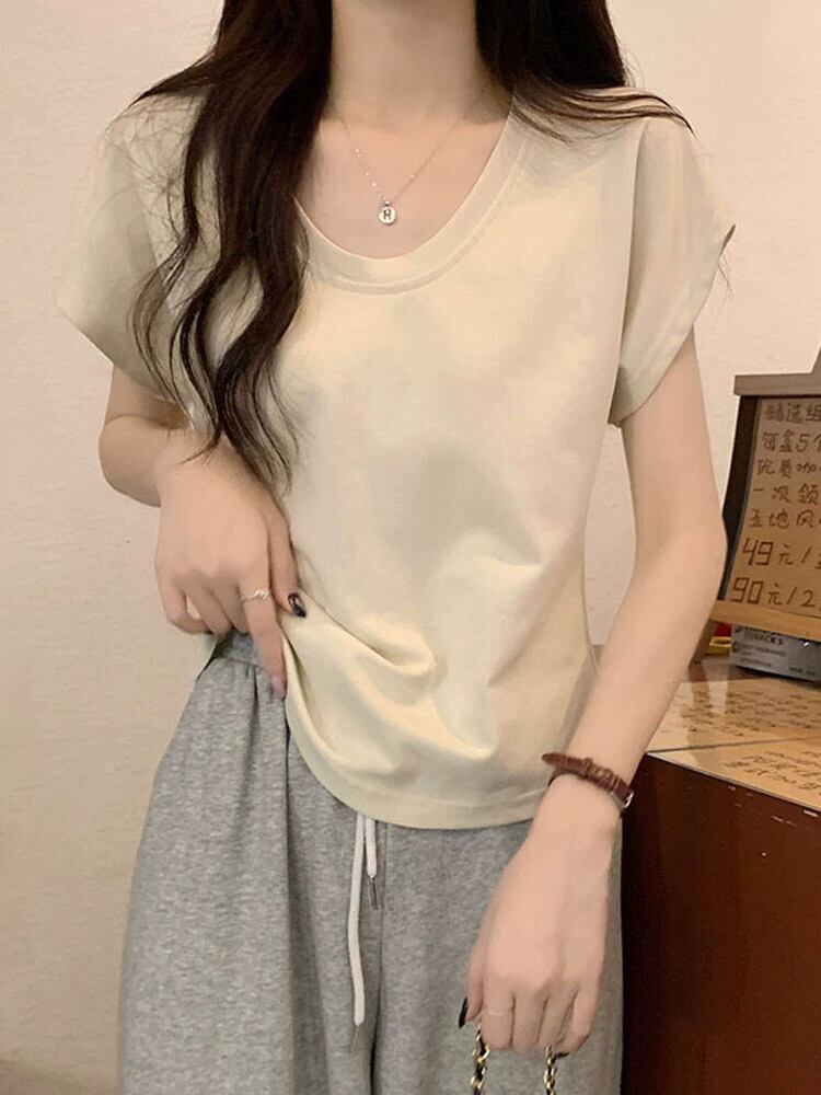 純綿ショルダー U ネック半袖 Tシャツレディース 2023 夏の新しいスタイルルーズスリム不規則なショートトップアプリコット コットン サマー 夏物 7460010645325700 | framboise21