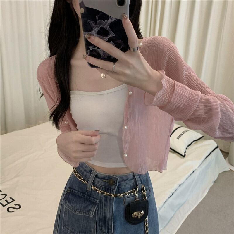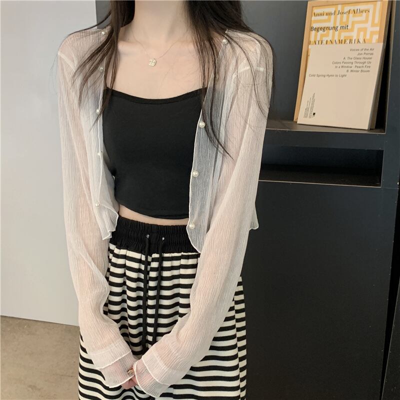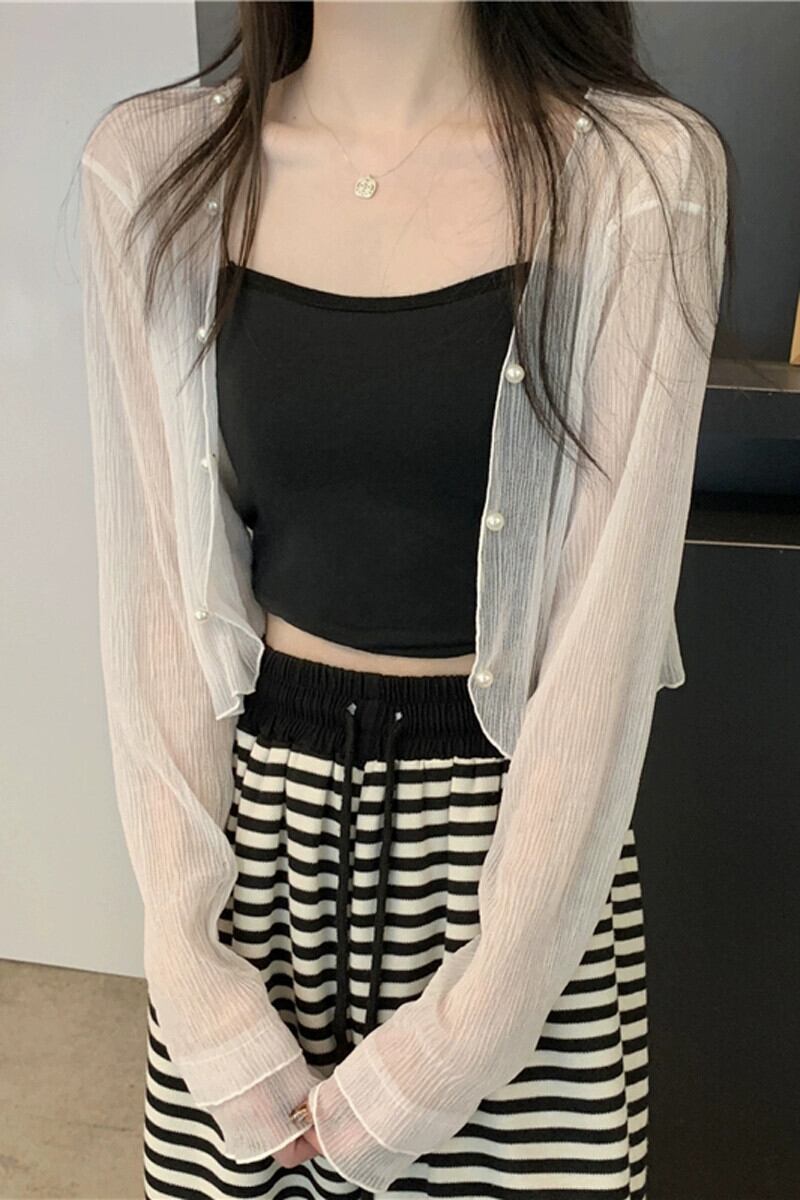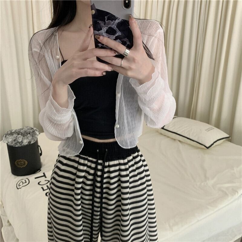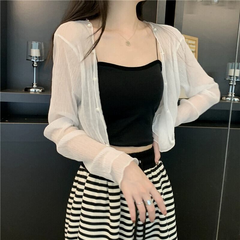 ホワイトシフォン日焼け止めカーディガン女性の薄いセクション夏のファッションサスペンダー、短いセクション微透過性小さなチョッキ長袖トップ ショート ロング サマー 夏物 7460055238569859 | framboise21