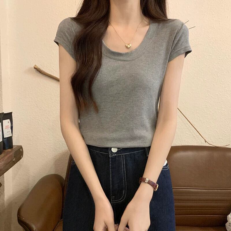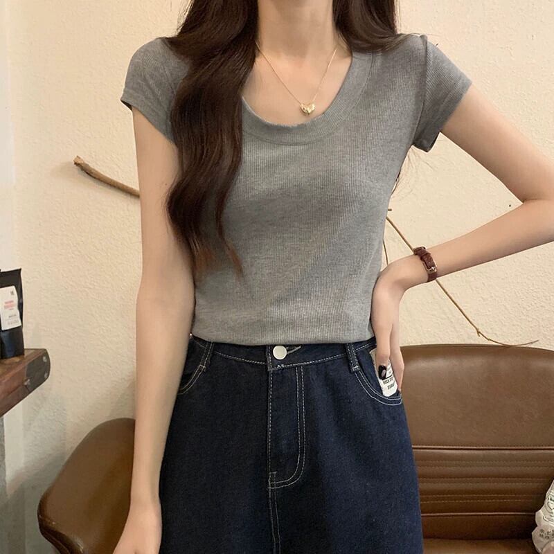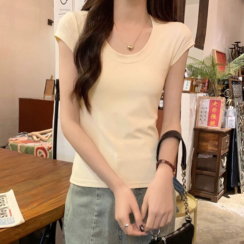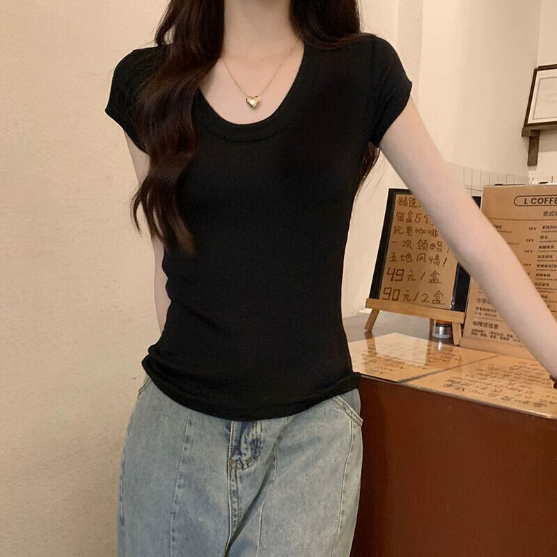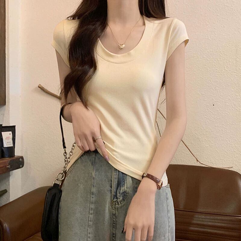 ベーシックフロントショルダー半袖Tシャツレディース2023年夏新スタイルファッションスリムスリムショートラウンドネックトップ サマー 夏物 Oネック 7460026264768616 | framboise21