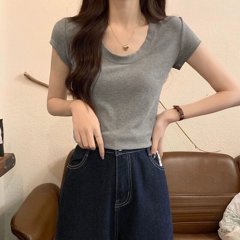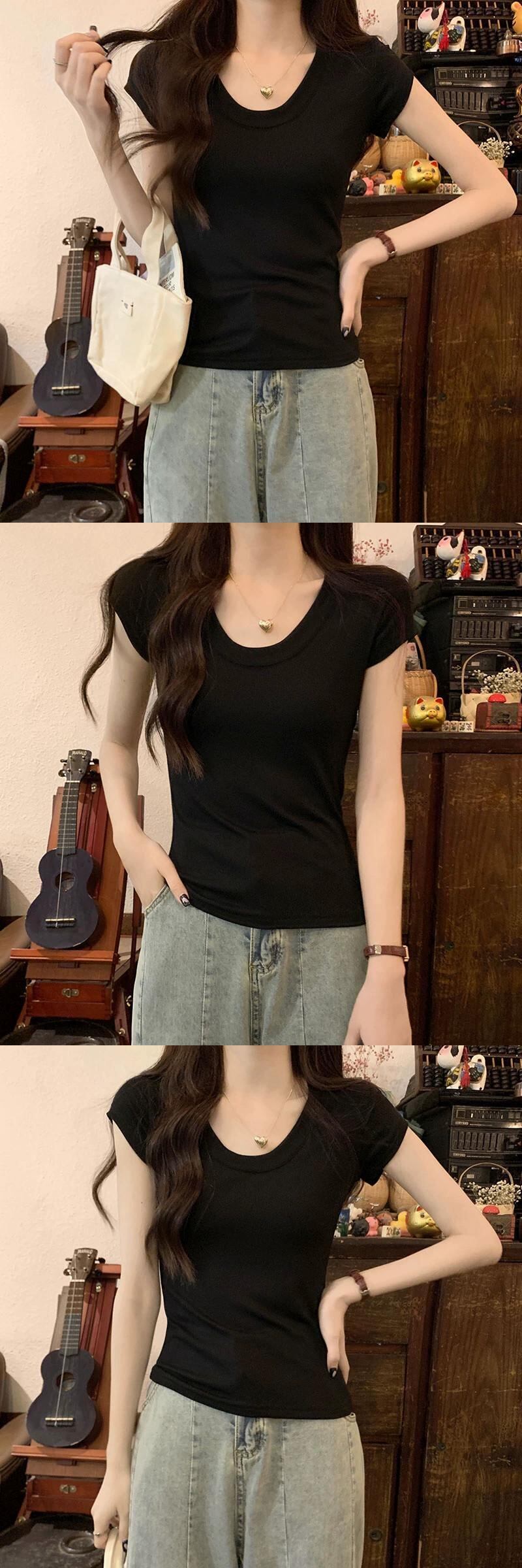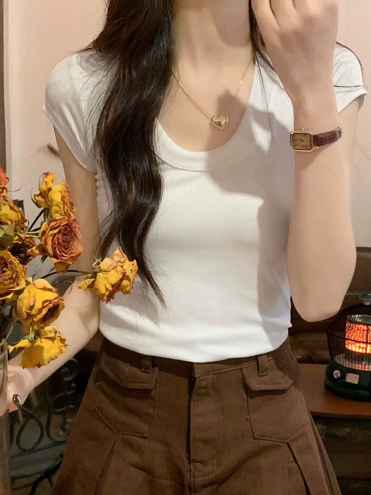 ベーシックフロントショルダー半袖Tシャツレディース2023年夏新スタイルファッションスリムスリムショートラウンドネックトップ サマー 夏物 Oネック 7460026264768616 | framboise21