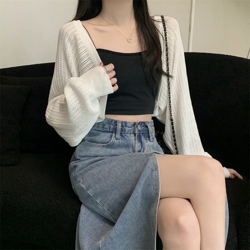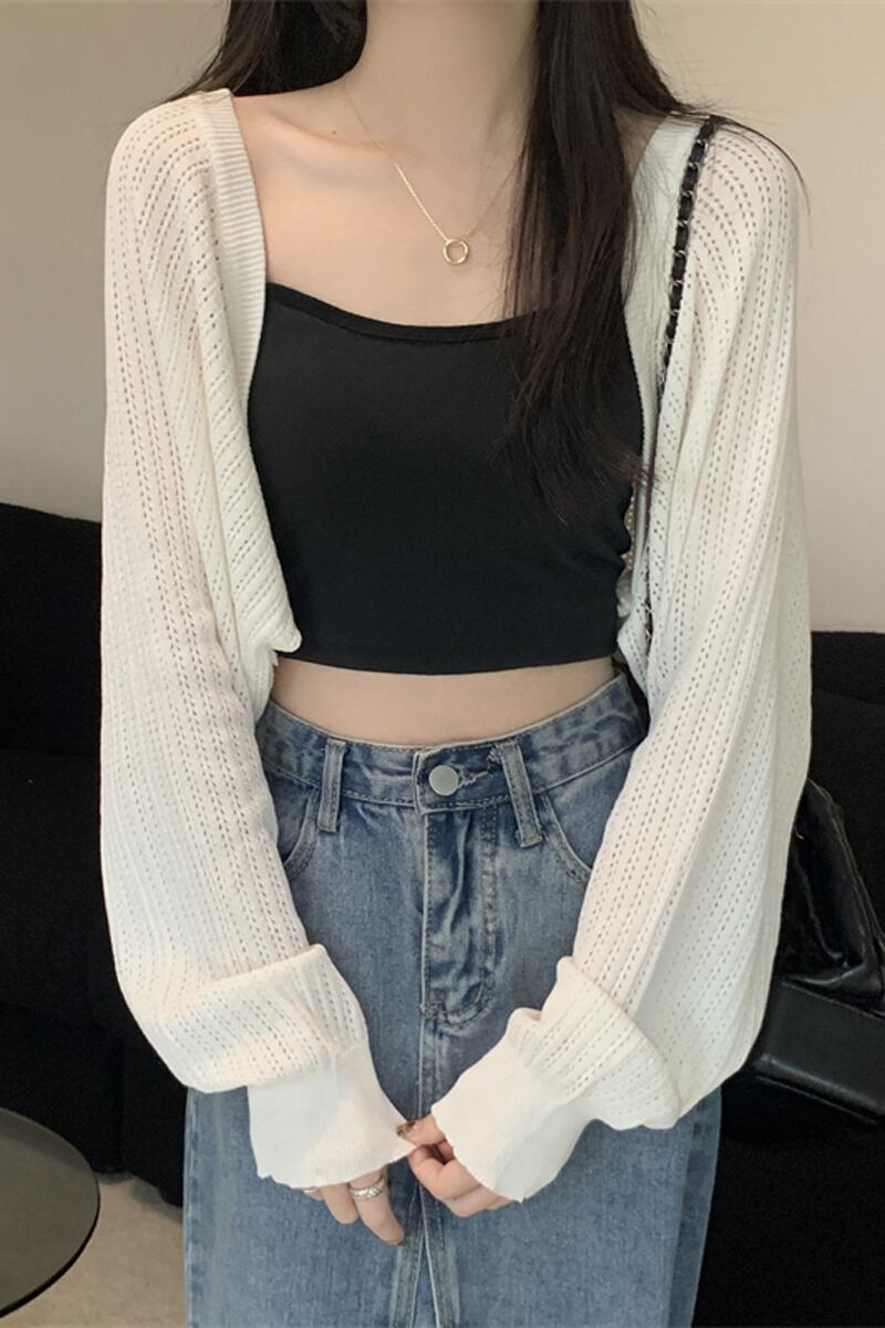 白いショール ニット日焼け止めカーディガン女性の夏のサスペンダー スカート小さなベスト付きハーフカット ブラウス薄いセクション アイス シルク トップ ホワイト サマー 夏物 7460083481987186 | framboise21