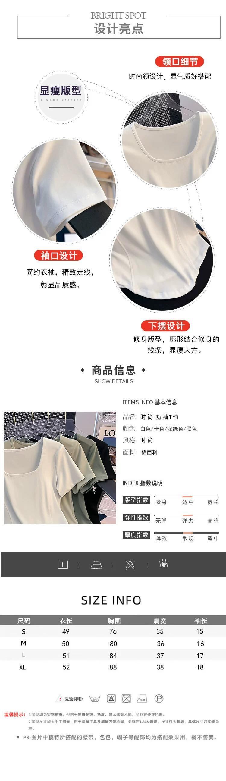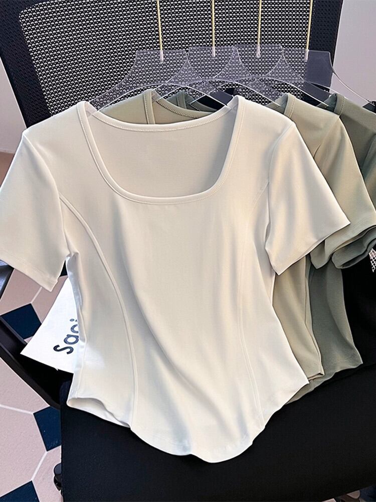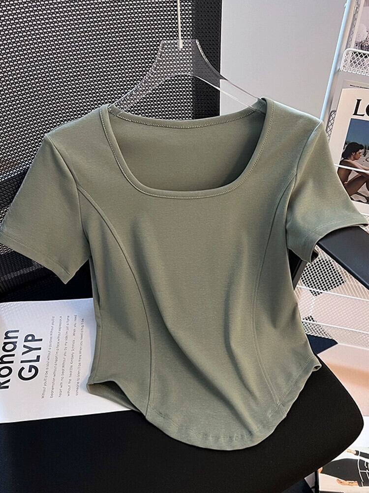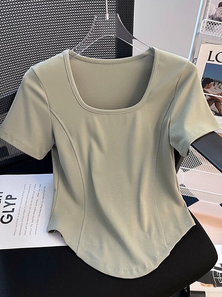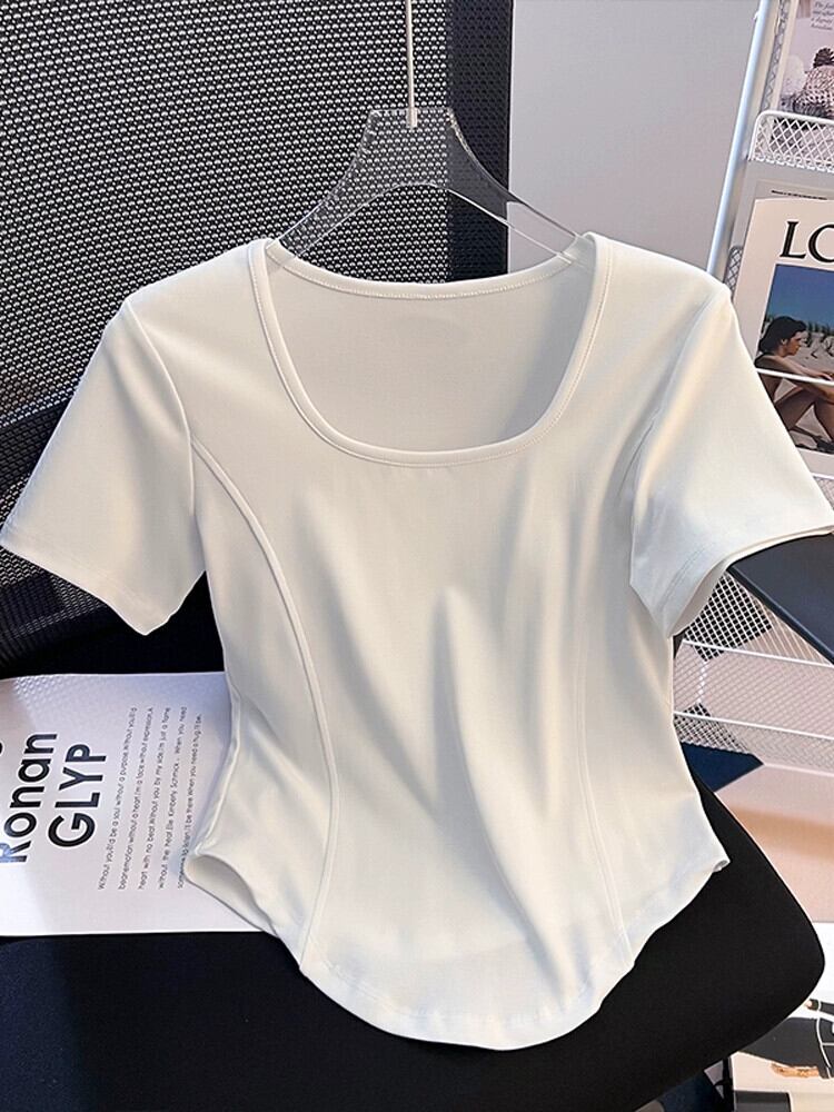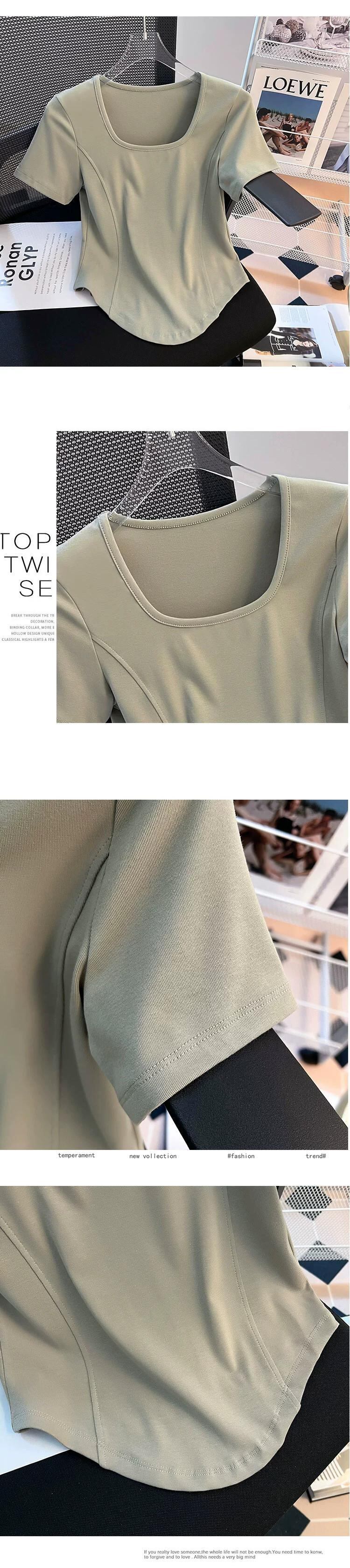 カーブした裾スクエアカラー半袖 Tシャツ女性の夏のファッション西洋スタイルニッチスリムフィット大きなネックラインフィッシュボーンショートトップ サマー 夏物 スクウェア 7460057382915579 | framboise21