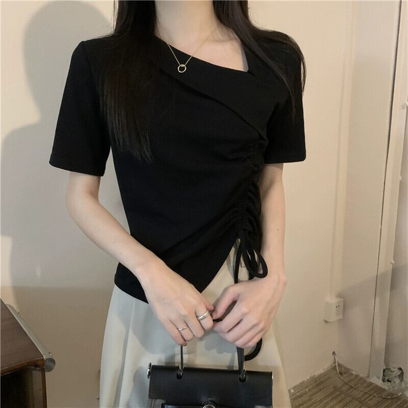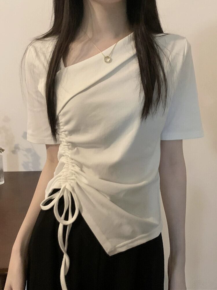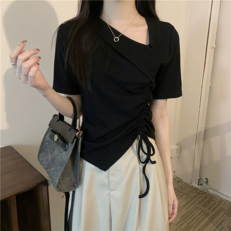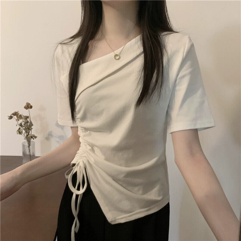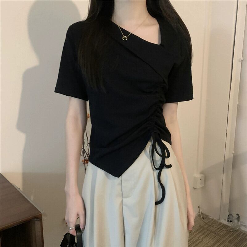 イレギュラーヘム フロントショルダー 半袖 Tシャツ レディース 夏 シック デザイン感 スリム スリム ショートサイド ドローストリング トップス サマー 夏物 7460037783280692 | framboise21