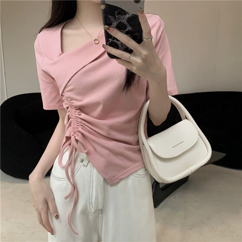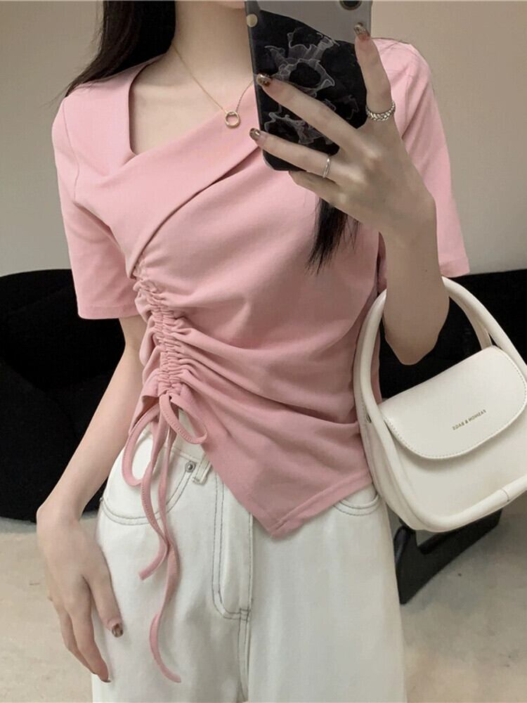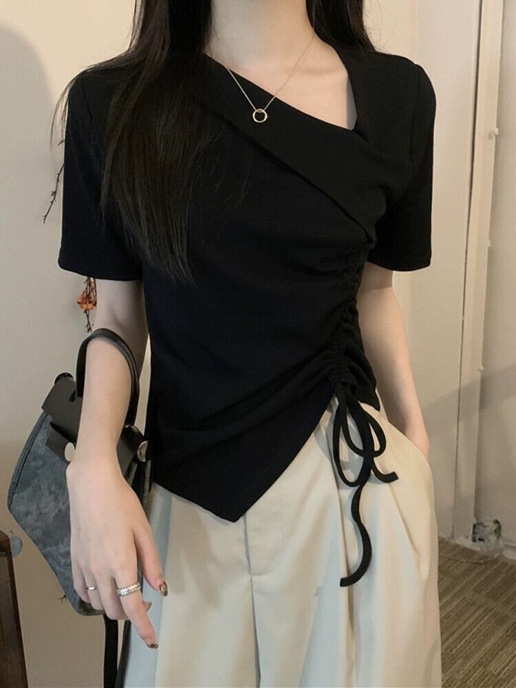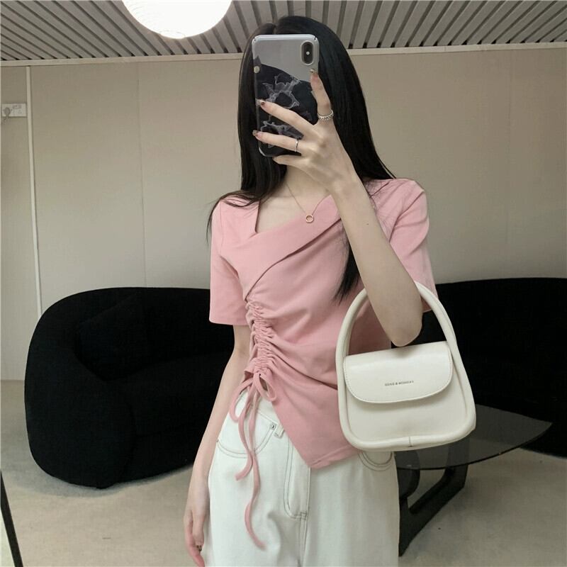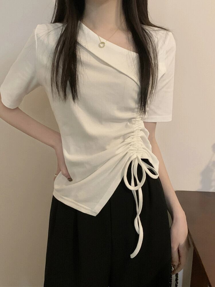 イレギュラーヘム フロントショルダー 半袖 Tシャツ レディース 夏 シック デザイン感 スリム スリム ショートサイド ドローストリング トップス サマー 夏物 7460037783280692 | framboise21